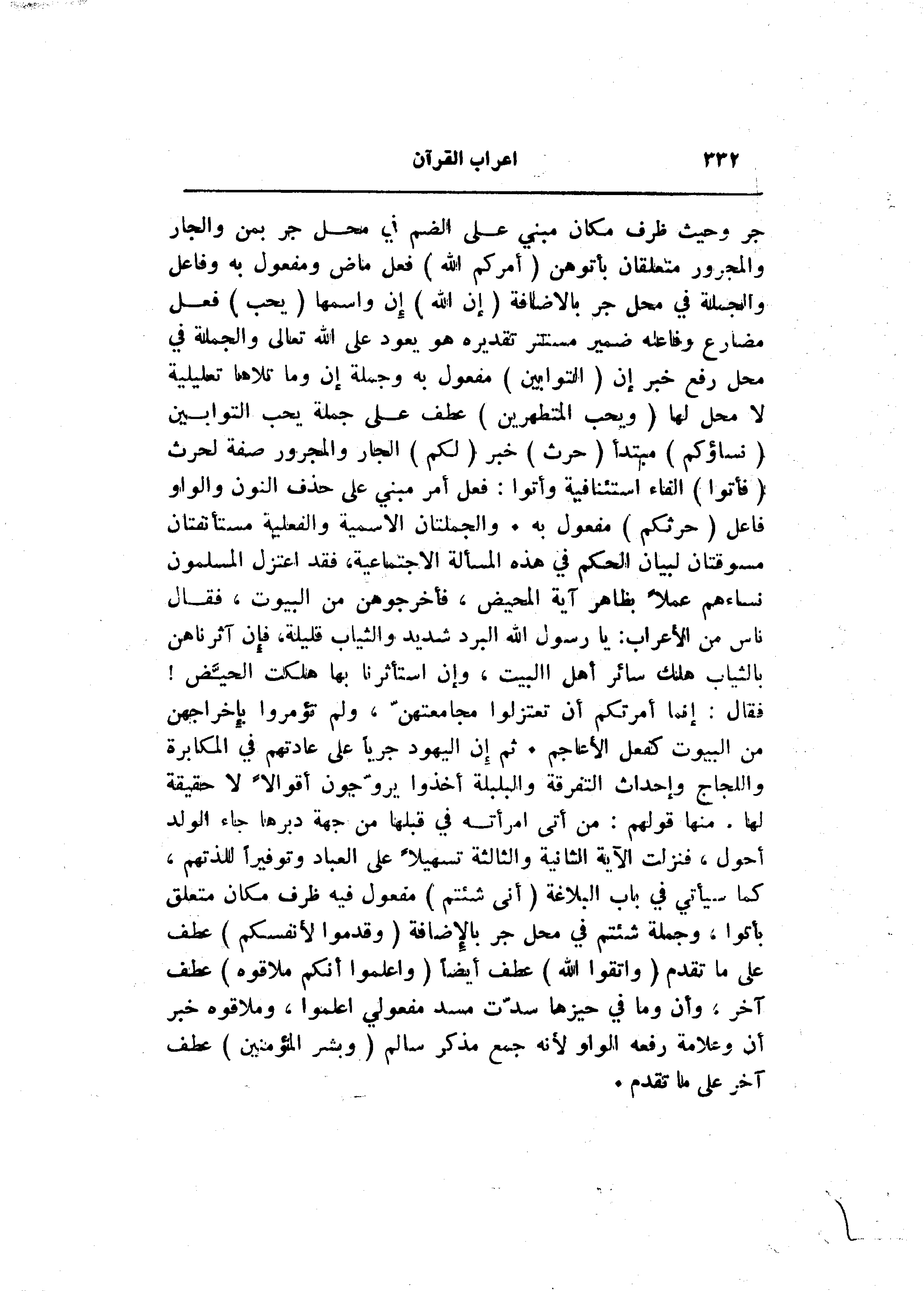 جر وحيث ظرف مكان مبني على الضم في محل جر بمن والجار والمجرور متعلقان بأتوهن (أَمَرَكُمُ اللَّهُ) فعل ماض ومفعول به وفاعل والجملة في محل جر بالاضافة (إِنَّ اللَّهَ) إن واسمها (يُحِبُّ) فعل مضارع وفاعله ضمير مستتر تقديره هو يعود على الله تعالى والجملة في محل رفع خبر إن (التَّوَّابِينَ) مفعول به وجملة إن وما تلاها تعليلية لا محل لها (وَيُحِبُّ الْمُتَطَهِّرِينَ) عطف على جملة يحب التوابين (نِساؤُكُمْ) مبتدأ (حَرْثٌ) خبر (لَكُمْ) الجار والمجرور صفة لحرث (فَأْتُوا) الفاء استئنافية وأتوا: فعل أمر مبني على حذف النون والواو فاعل (حَرْثَكُمْ) مفعول به. والجملتان الاسمية والفعلية مستأنفتان مسوقتان لبيان الحكم في هذه المسألة الاجتماعية، فقد اعتزل المسلمون نساءهم عملا بظاهر آية المحيض، فأخرجوهن من البيوت، فقال ناس من الأعراب: يا رسول الله البرد شديد والثياب قليلة، فإن آثرناهن بالثياب هلك سائر أهل البيت، وإن استأثرنا بها هلكت الحيّض! فقال: إنما أمرتكم أن تعتزلوا مجامعتهنّ، ولم تؤمروا بإخراجهن من البيوت كفعل الأعاجم. ثم إن اليهود جريا على عادتهم في المكابرة واللجاج وإحداث التفرقة والبلبلة أخذوا يروّجون أقوالا لا حقيقة لها. منها قولهم: من أتى امرأته في قبلها من جهة دبرها جاء الولد أحول، فنزلت الآية الثانية والثالثة تسهيلا على العباد وتوفيرا للذتهم، كما سيأتي في باب البلاغة (أَنَّى شِئْتُمْ) مفعول فيه ظرف مكان متعلق بأتوا، وجملة شئتم في محل جر بالإضافة (وَقَدِّمُوا لِأَنْفُسِكُمْ) عطف على ما تقدم (وَاتَّقُوا اللَّهَ) عطف أيضا (وَاعْلَمُوا أَنَّكُمْ مُلاقُوهُ) عطف آخر، وأن وما في حيزها سدّت مسد مفعولي اعلموا، وملاقوه خبر أن وعلامة رفعه الواو لأنه جمع مذكر سالم (وَبَشِّرِ الْمُؤْمِنِينَ) عطف آخر على ما تقدم.