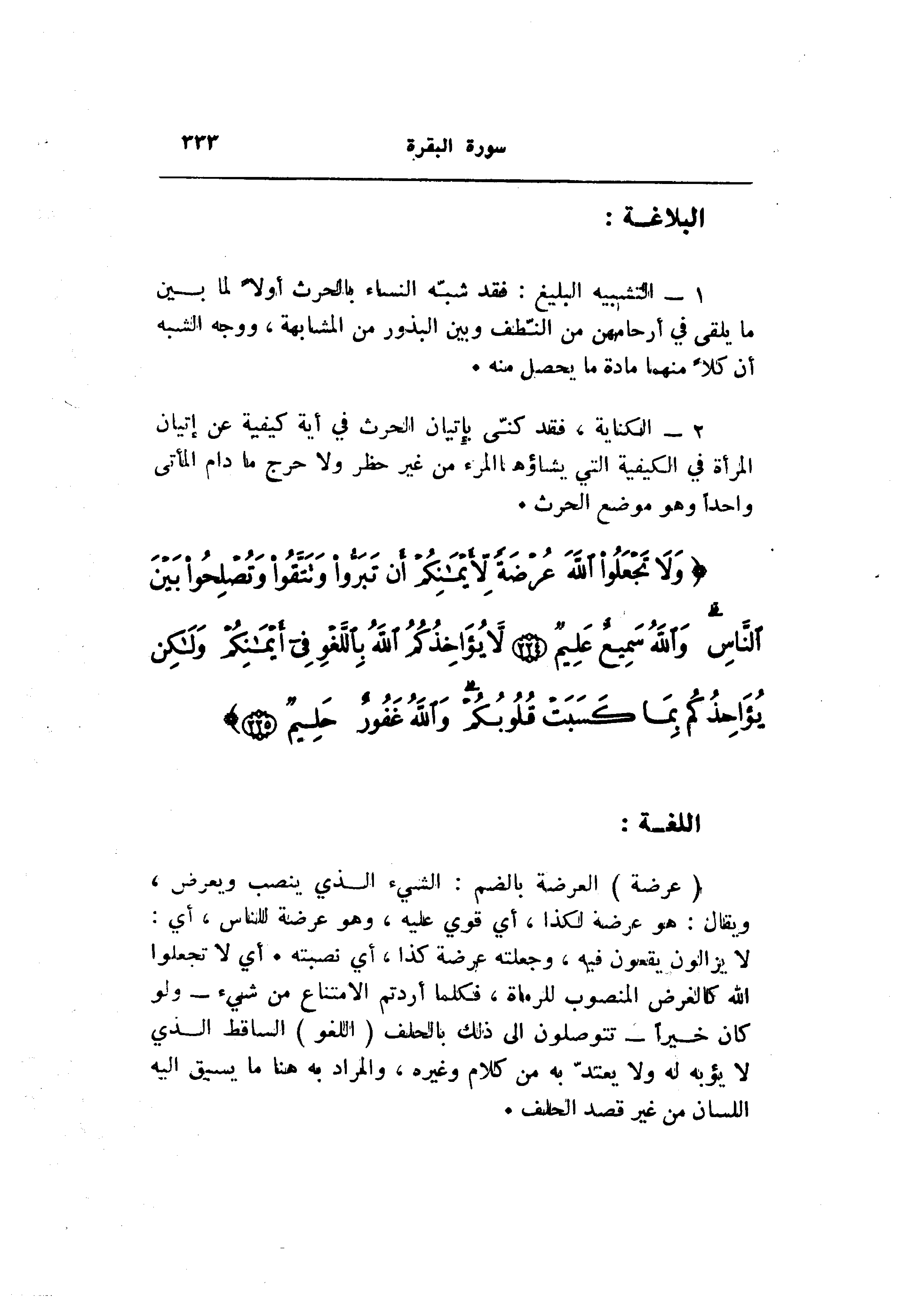 لا يزالون يقعون فيه، وجعلته عرضة كذا، أي نصبته. أي لا تجعلوا الله كالغرض المنصوب للرماة، فكلما أردتم الامتناع من شيء- ولو كان خيرا- تتوصلون الى ذلك بالحلف (اللغو) الساقط الذي لا يؤبه له ولا يعتدّ به من كلام وغيره، والمراد به هنا ما يسيق اليه اللسان من غير قصد الحلف.