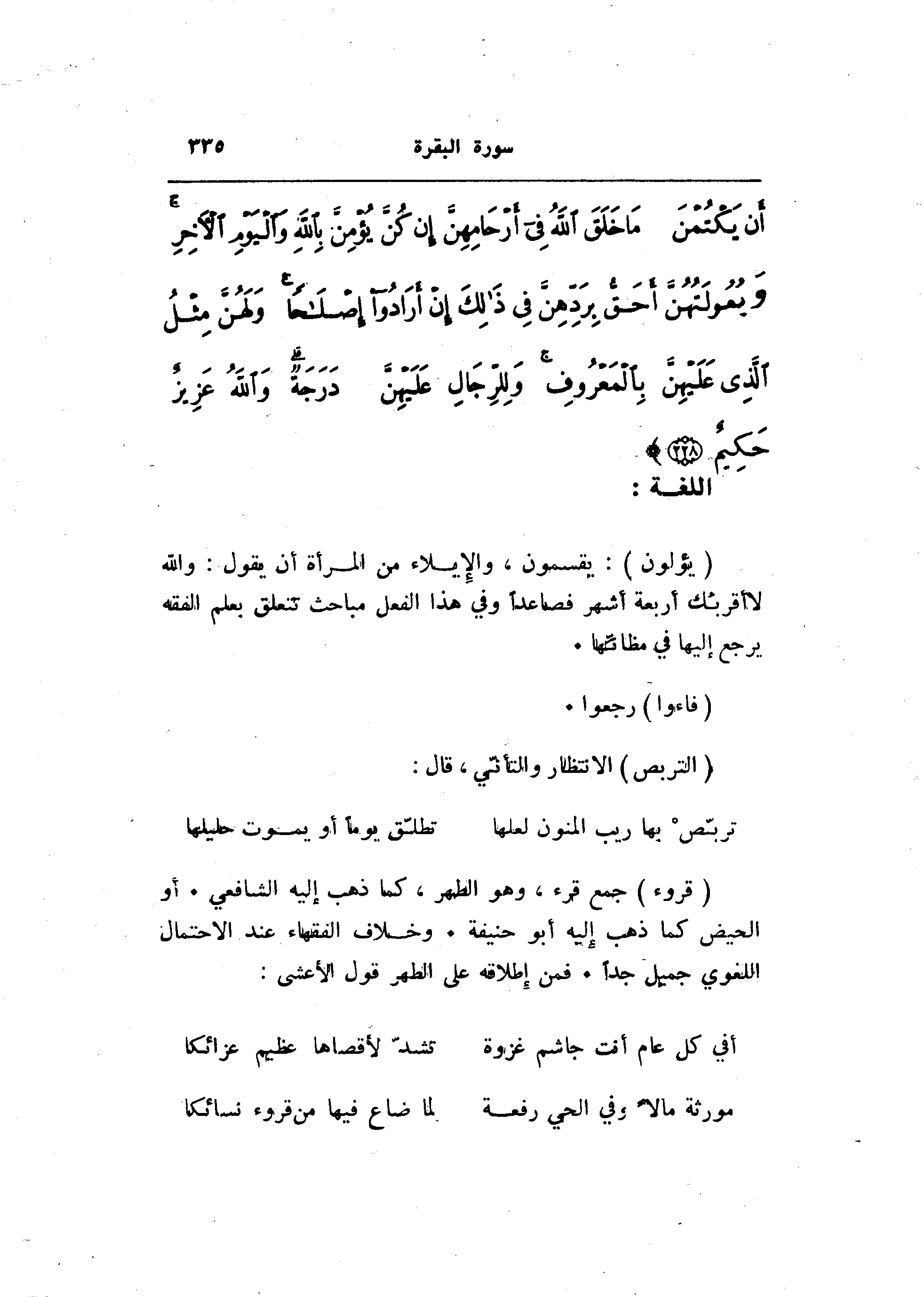 (قروء) جمع قرء، وهو الطهر، كما ذهب إليه الشافعي. أو الحيض كما ذهب إليه أبو حنيفة. وخلاف الفقهاء عند الاحتمال اللغوي جميل جدا. فمن إطلاقه على الطهر قول الأعشى: