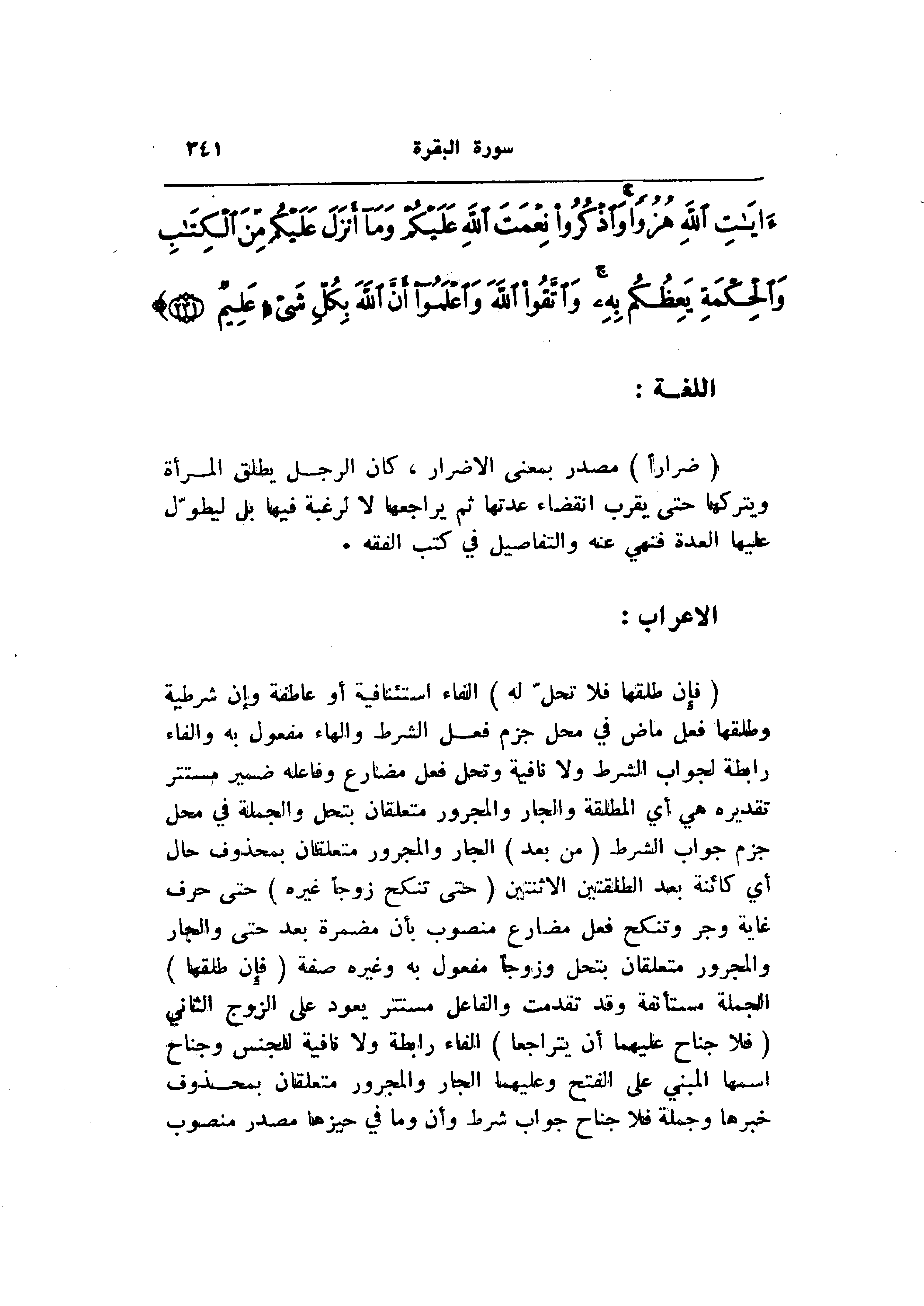 (ضِراراً) مصدر بمعنى الإضرار، كان الرجل يطلق المرأة ويتركها حتى يقرب انقضاء عدتها ثم يراجعها لا لرغبة فيها بل ليطوّل عليها العدة فنهي عنه والتفاصيل في كتب الفقه.