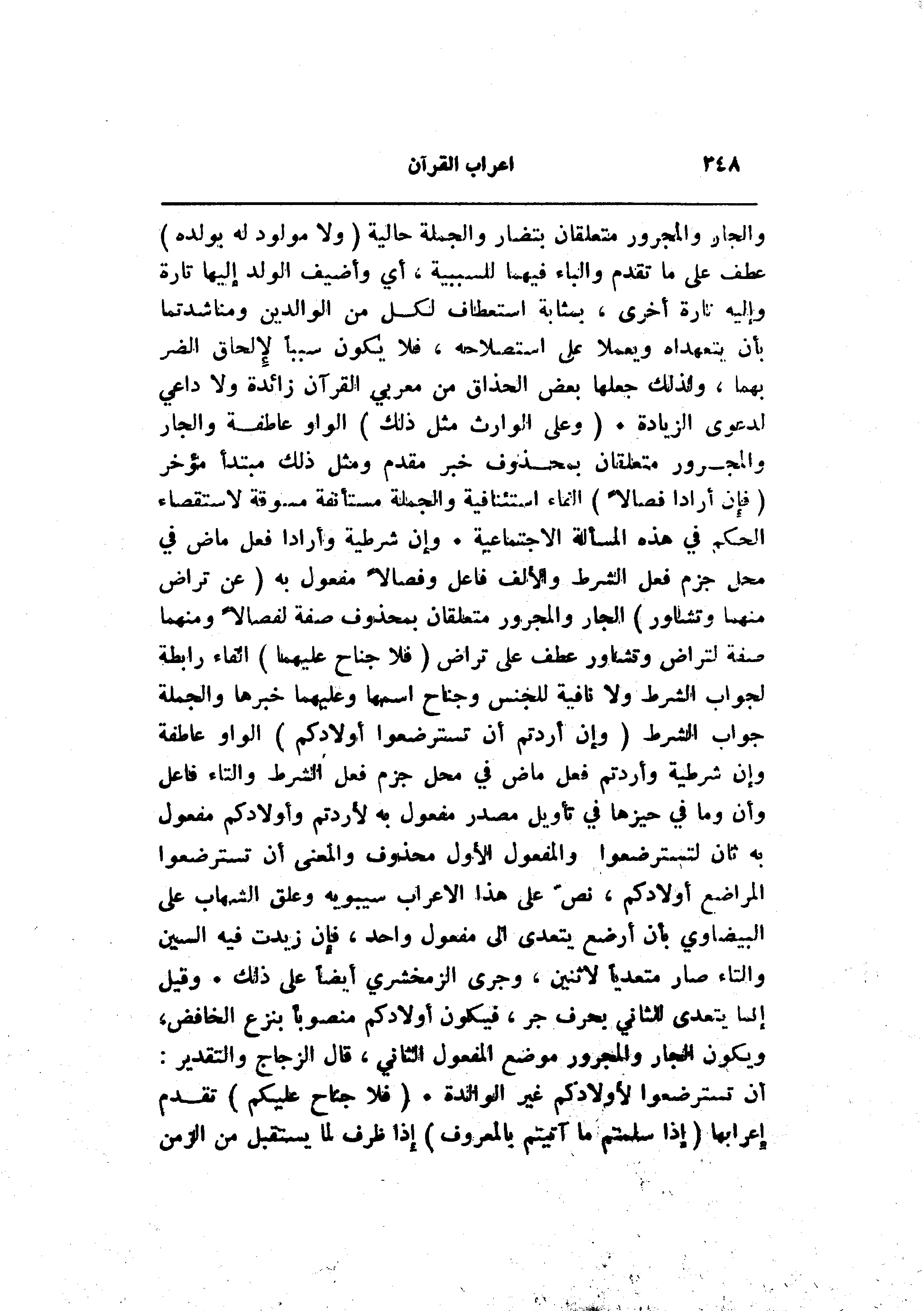 والجار والمجرور متعلقان بتضار والجملة حالية (وَلا مَوْلُودٌ لَهُ بِوَلَدِهِ) عطف على ما تقدم والباء فيهما للسببية، أي وأضيف الولد إليها تارة وإليه تارة أخرى، بمثابة استعطاف لكل من الوالدين ومناشدتما بأن يتعهداه ويعملا على استصلاحه، فلا يكون سببا لإلحاق الضر بهما، ولذلك جعلها بعض الحذاق من معربي القرآن زائدة ولا داعي لدعوى الزيادة. (وَعَلَى الْوارِثِ مِثْلُ ذلِكَ) الواو عاطفة والجار والمجرور متعلقان بمحذوف خبر مقدم ومثل ذلك مبتدأ مؤخر (فَإِنْ أَرادا فِصالًا) الفاء استئنافية والجملة مستأنفة مسوقة لاستقصاء الحكم في هذه المسألة الاجتماعية. وإن شرطية وأرادا فعل ماض في محل جزم فعل الشرط والألف فاعل وفصالا مفعول به (عَنْ تَراضٍ مِنْهُما وَتَشاوُرٍ) الجار والمجرور متعلقان بمحذوف صفة لفصالا ومنهما صفة لتراض وتشاور عطف على تراض (فَلا جُناحَ عَلَيْهِما) الفاء رابطة لجواب الشرط ولا نافية للجنس وجناح اسمها وعليهما خبرها والجملة جواب الشرط (وَإِنْ أَرَدْتُمْ أَنْ تَسْتَرْضِعُوا أَوْلادَكُمْ) الواو عاطفة وإن شرطية وأردتم فعل ماض في محل جزم فعل الشرط والتاء فاعل وأن وما في حيزها في تأويل مصدر مفعول به لأردتم وأولادكم مفعول به ثان لتسترضعوا والمفعول الأول محذوف والمعنى أن تسترضعوا المراضع أولادكم، نصّ على هذا الإعراب سيبويه وعلق الشهاب على البيضاوي بأن أرضع يتعدى الى مفعول واحد، فإن زيدت فيه السين والتاء صار متعديا لاثنين، وجرى الزمخشري أيضا على ذلك. وقيل إنما يتعدى للثاني بحرف جر، فيكون أولادكم منصوبا بنزع الخافض، ويكون الجار والمجرور موضع المفعول الثاني، قال الزجاج والتقدير: