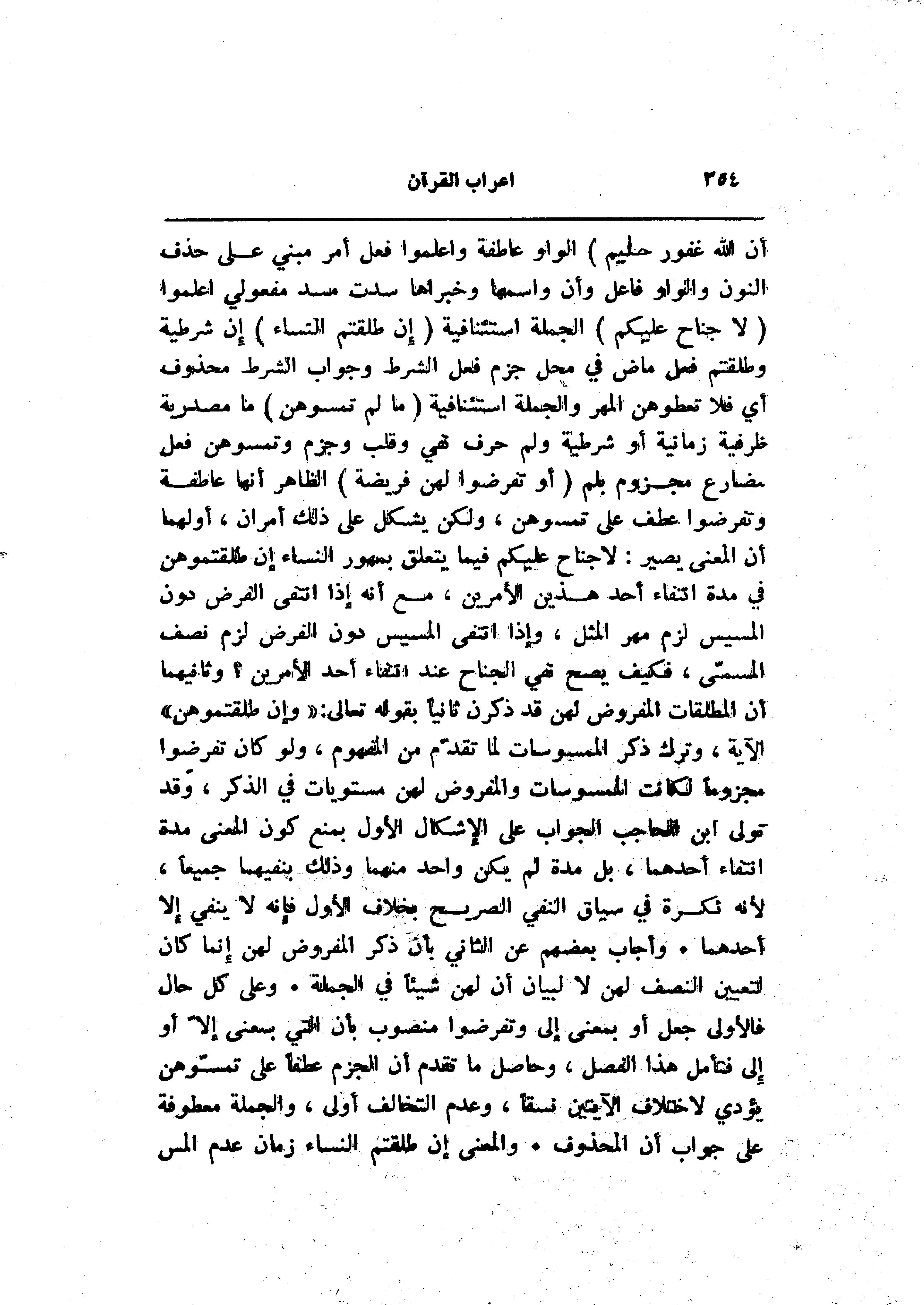 الواو عاطفة واعلموا فعل أمر مبني على حذف النون والواو فاعل وأن واسمها وخبراها سدت مسد مفعولي اعلموا (لا جُناحَ عَلَيْكُمْ) الجملة استئنافية (إِنْ طَلَّقْتُمُ النِّساءَ) إن شرطية وطلقتم فعل ماض في محل جزم فعل الشرط وجواب الشرط محذوف أي فلا تعطوهن المهر والجملة استئنافية (ما لَمْ تَمَسُّوهُنَّ) ما مصدرية ظرفية زمانية أو شرطية ولم حرف نفي وقلب وجزم وتمسوهن فعل مضارع مجزوم بلم (أَوْ تَفْرِضُوا لَهُنَّ فَرِيضَةً) الظاهر أنها عاطفة وتفرضوا عطف على تمسوهن، ولكن يشكل على ذلك أمران، أولهما أن المعنى يصير: لا جناح عليكم فيما يتعلق بمهور النساء إن طلقتموهن في مدة انتفاء أحد هذين الأمرين، مع أنه إذا انتفى الفرض دون المسيس لزم مهر المثل، وإذا انتفى المسيس دون الفرض لزم نصف المسمّى، فكيف يصح نفي الجناح عند انتفاء أحد الأمرين؟ وثانيهما أن المطلقات المفروض لهن قد ذكرن ثانيا بقوله تعالى: «وإن طلقتموهن» الآية، وترك ذكر الممسوسات لما تقدّم من المفهوم، ولو كان تفرضوا مجزوما لكانت المسوسات والمفروض لهن مستويات في الذكر، وقد تولى ابن الحاجب الجواب على الإشكال الأول بمنع كون المعنى مدة انتفاء أحدهما، بل مدة لم يكن واحد منهما وذلك بنفيهما جميعا، لأنه نكرة في سياق النفي الصريح بخلاف الأول فإنه لا ينفي إلا أحدهما. وأجاب بعضهم عن الثاني بأن ذكر المفروض لهن إنما كان لتعيين النصف لهن لا لبيان أن لهن شيئا في الجملة. وعلى كل حال فالأولى جعل أو بمعنى إلى وتفرضوا منصوب بأن التي بمعنى إلّا أو إلى فتأمل هذا الفصل، وحاصل ما تقدم أن الجزم عطفا على تمسّوهن يؤدي لاختلاف الآيتين نسقا، وعدم التخالف أولى، والجملة معطوفة على جواب أن المحذوف. والمعنى إن طلقتم النساء زمان عدم المس