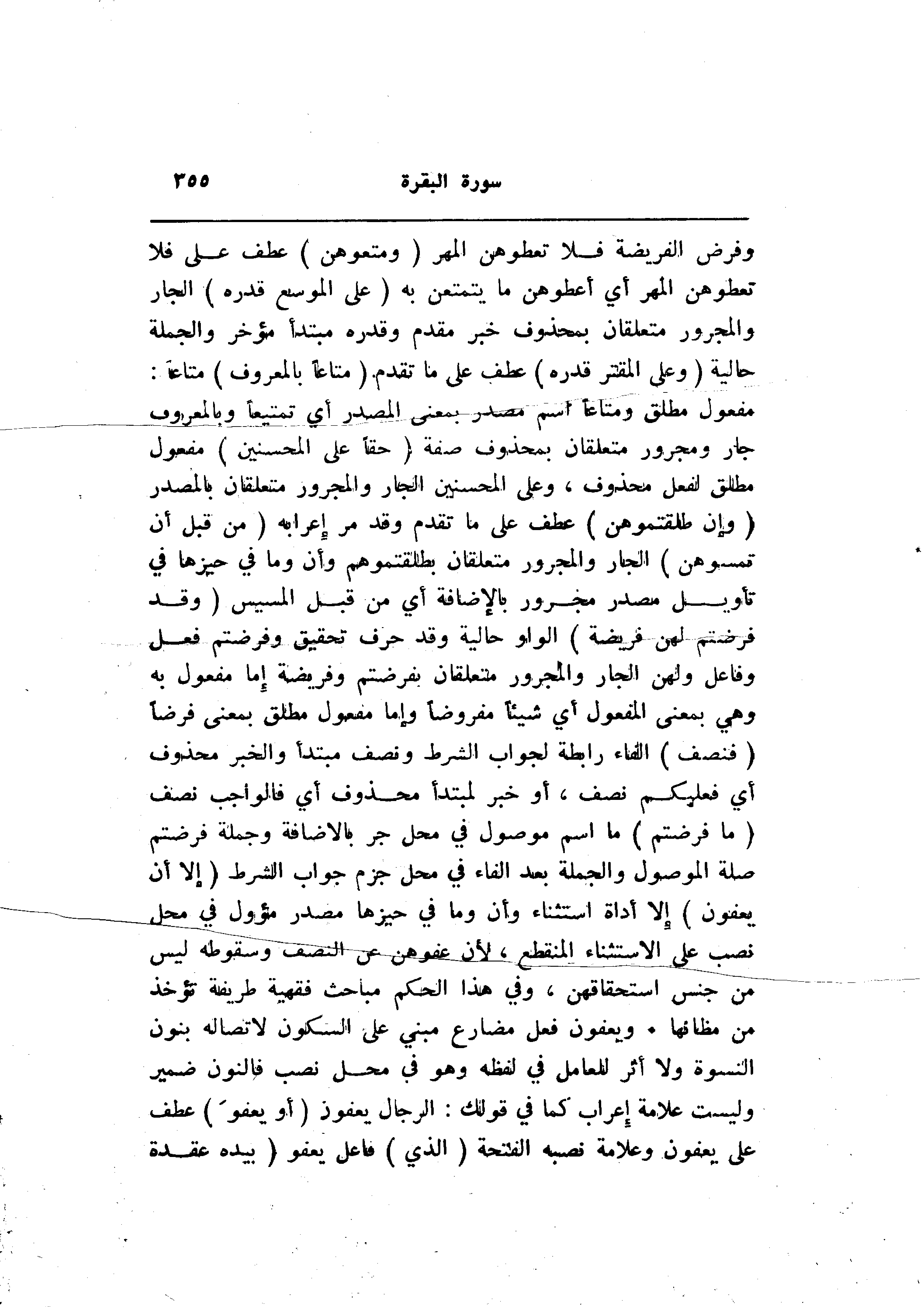 مفعول مطلق ومتاعا اسم مصدر بمعنى المصدر أي تمتيعا وبالمعروف جار ومجرور متعلقان بمحذوف صفة (حَقًّا عَلَى الْمُحْسِنِينَ) مفعول مطلق لفعل محذوف، وعلى المحسنين الجار والمجرور متعلقان بالمصدر (وَإِنْ طَلَّقْتُمُوهُنَّ) عطف على ما تقدم وقد مر إعرابه (مِنْ قَبْلِ أَنْ تَمَسُّوهُنَّ) الجار والمجرور متعلقان بطلقتموهم وأن وما في حيزها في تأويل مصدر مجرور بالإضافة أي من قبل المسيس (وَقَدْ فَرَضْتُمْ لَهُنَّ فَرِيضَةً) الواو حالية وقد حرف تحقيق وفرضتم فعل وفاعل ولهن الجار والمجرور متعلقان بفرضتم وفريضة إما مفعول به وهي بمعنى المفعول أي شيئا مفروضا وإما مفعول مطلق بمعنى فرضا (فَنِصْفُ) الفاء رابطة لجواب الشرط ونصف مبتدأ والخبر محذوف أي فعليكم نصف، أو خبر لمبتدأ محذوف أي فالواجب نصف (ما فَرَضْتُمْ) ما اسم موصول في محل جر بالاضافة وجملة فرضتم صلة الموصول والجملة بعد الفاء في محل جزم جواب الشرط (إِلَّا أَنْ يَعْفُونَ) إلا أداة استثناء وأن وما في حيزها مصدر مؤول في محل نصب على الاستثناء المنقطع، لأن عفوهن عن النصف وسقوطه ليس من جنس استحقاقهن، وفي هذا الحكم مباحث فقهية طريفة تؤخذ من مظانها. ويعفون فعل مضارع مبني على السكون لاتصاله بنون النسوة ولا أثر للعامل في لفظه وهو في محل نصب فالنون ضمير وليست علامة إعراب كما في قولك: الرجال يعفون (أَوْ يَعْفُوَا) عطف على يعفون وعلامة نصبه الفتحة (الَّذِي) فاعل يعفو (بِيَدِهِ عُقْدَةُ النِّكاحِ)