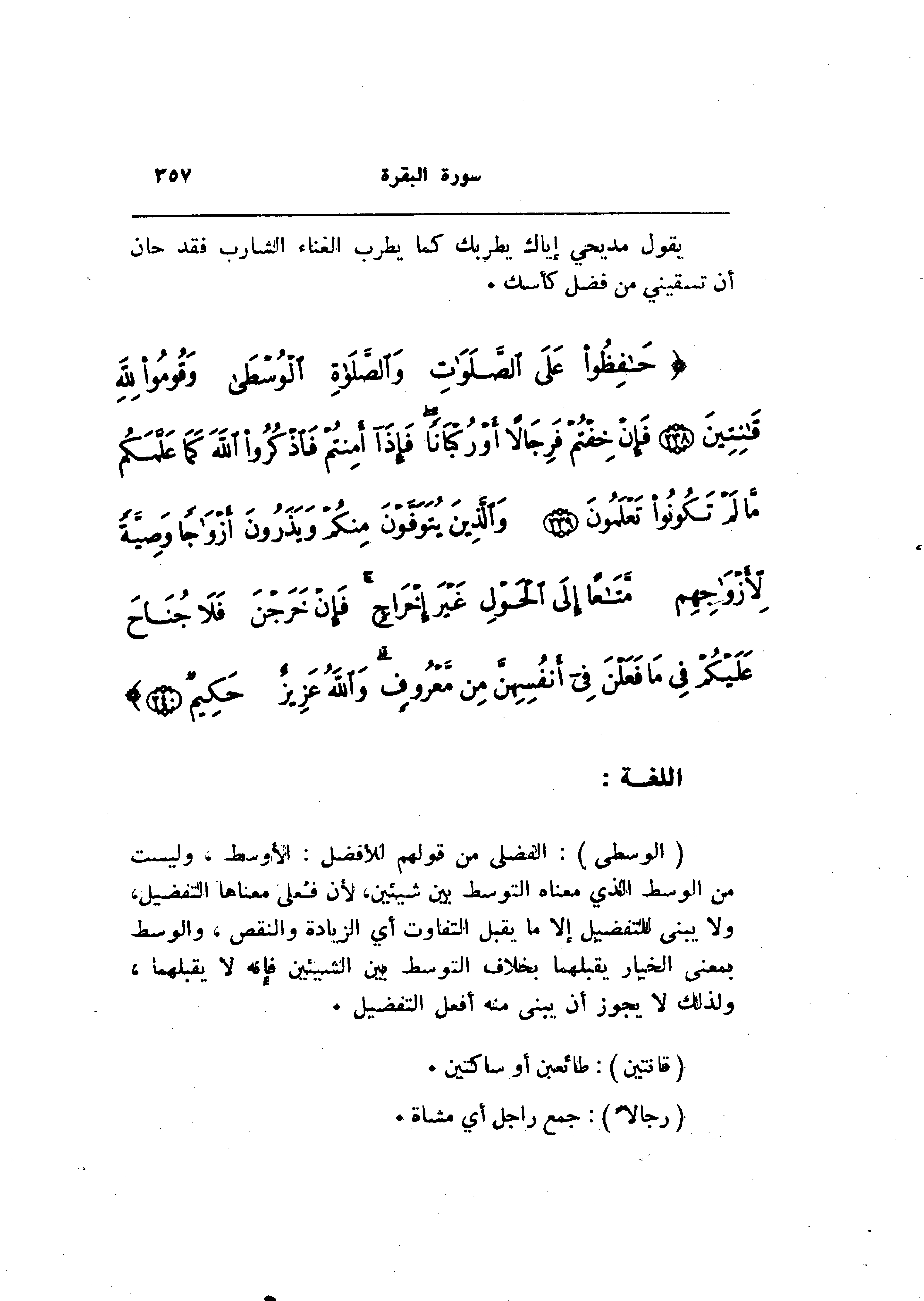 (الْوُسْطى) : الفضلى من قولهم للأفضل: الأوسط، وليست من الوسط الذي معناه التوسط بين شيئين، لأن فعلى معناها التفضيل، ولا يبنى للتفضيل إلا ما يقبل التفاوت أي الزيادة والنقص، والوسط بمعنى الخيار يقبلهما بخلاف التوسط بين الشيئين فإنه لا يقبلهما، ولذلك لا يجوز أن يبنى منه أفعل التفضيل.
