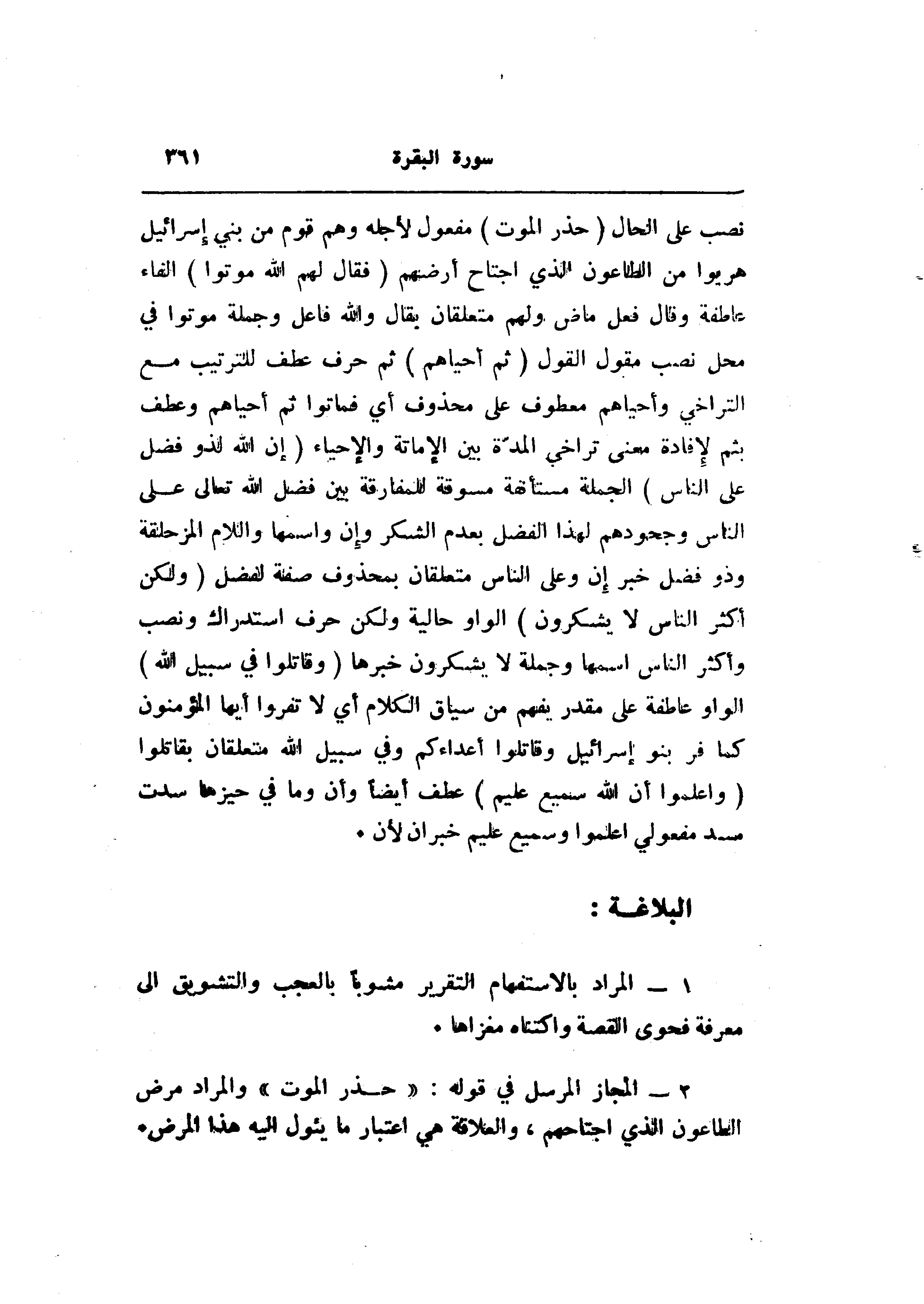 2- المجاز المرسل في قوله: «حذر الموت» والمراد مرض الطاعون الذي اجتاحهم، والعلاقة هي اعتبار ما يئول اليه هذا المرض.