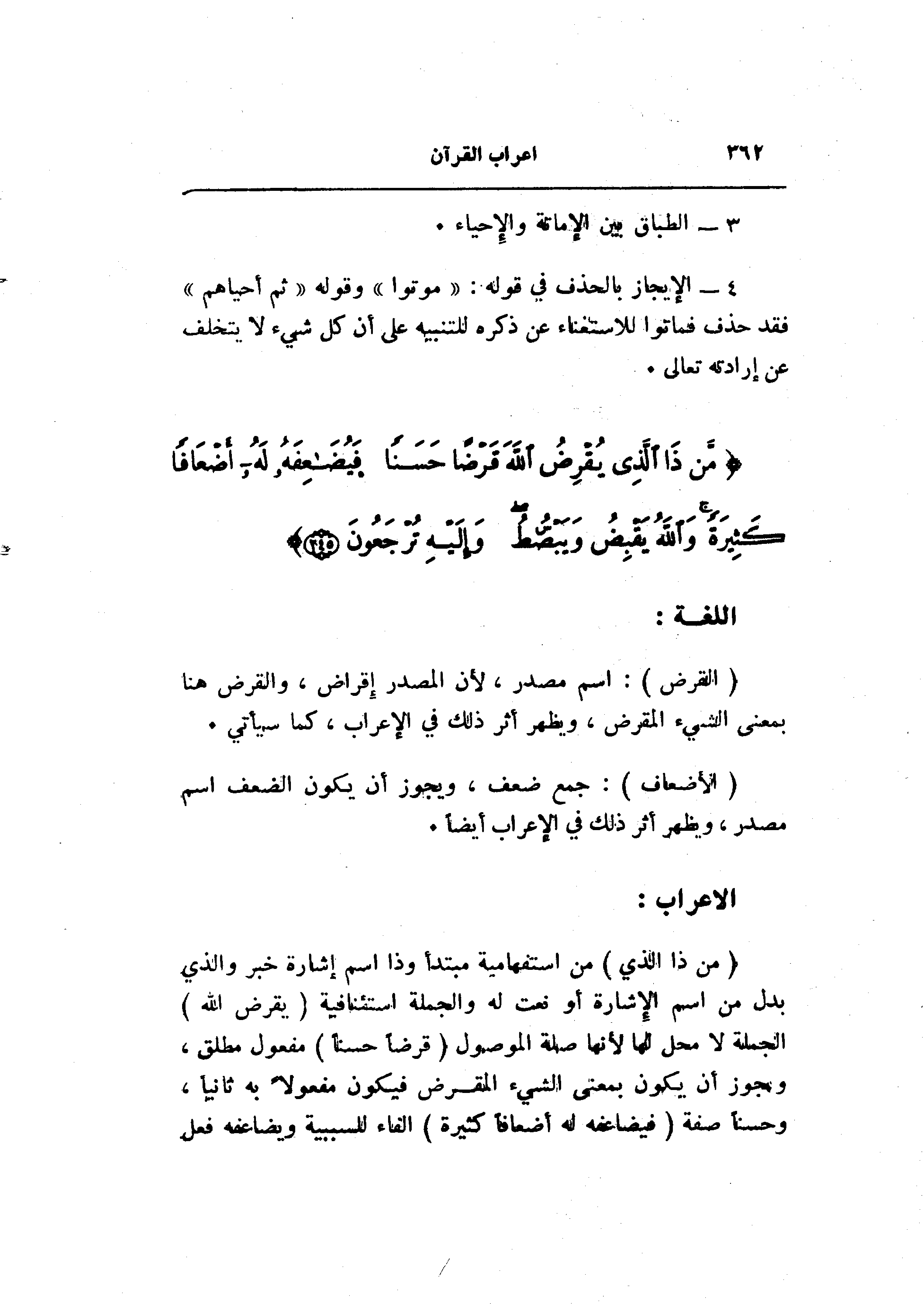 مفعول مطلق، ومجوز أن يكون بمعنى الشيء المقرض فيكون مفعولا به ثانيا، وحسنا صفة (فَيُضاعِفَهُ لَهُ أَضْعافاً كَثِيرَةً) الفاء للسببية ويضاعفه فعل