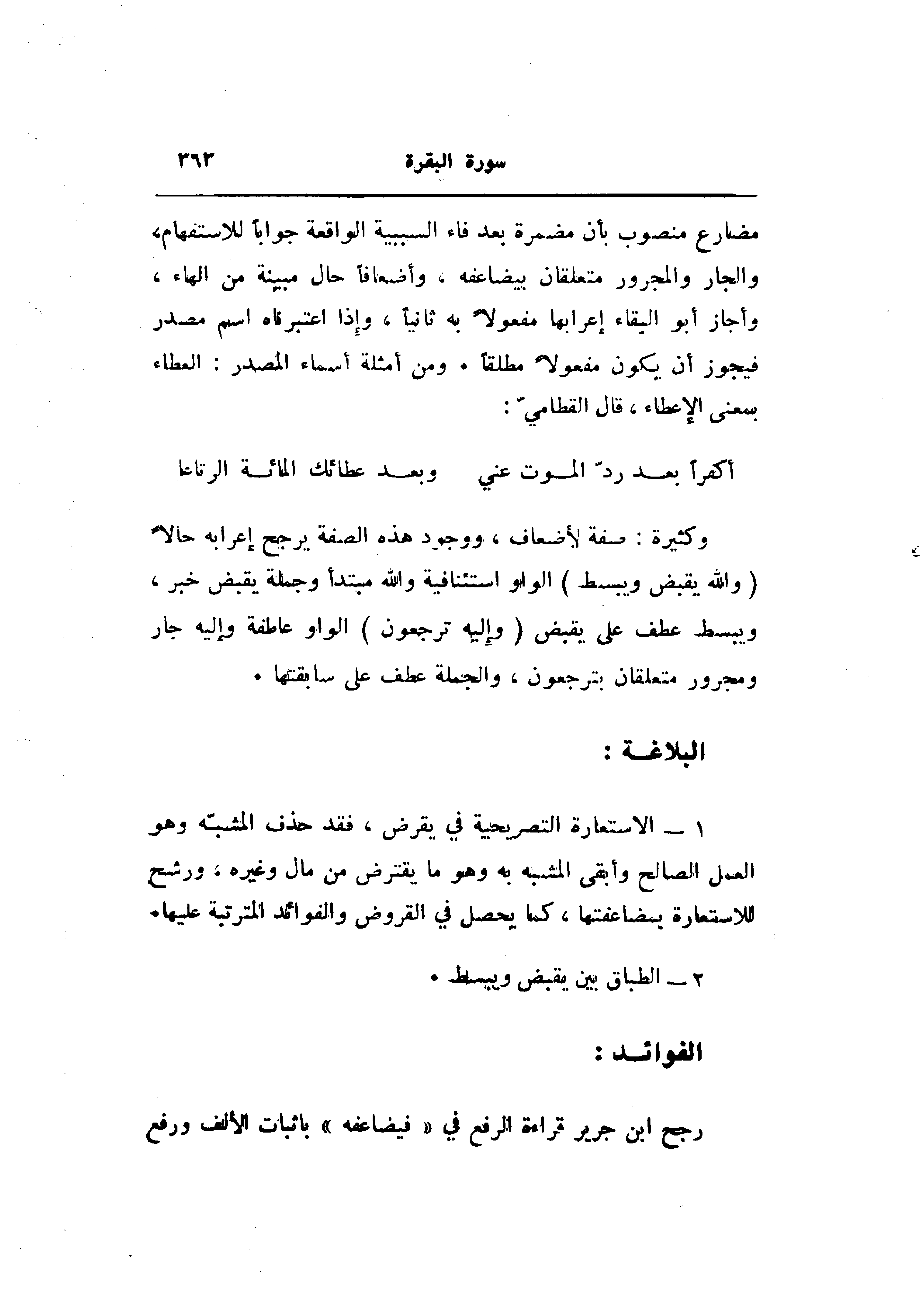 وكثيرة: صفة لأضعاف، ووجود هذه الصفة يرجح إعرابه حالا (وَاللَّهُ يَقْبِضُ وَيَبْصُطُ) الواو استئنافية والله مبتدأ وجملة يقبض خبر، ويَبْصُطُ عطف على يَقْبِضُ (وَإِلَيْهِ تُرْجَعُونَ) الواو عاطفة وإليه جار ومجرور متعلقان بترجعون، والجملة عطف على سابقتها.