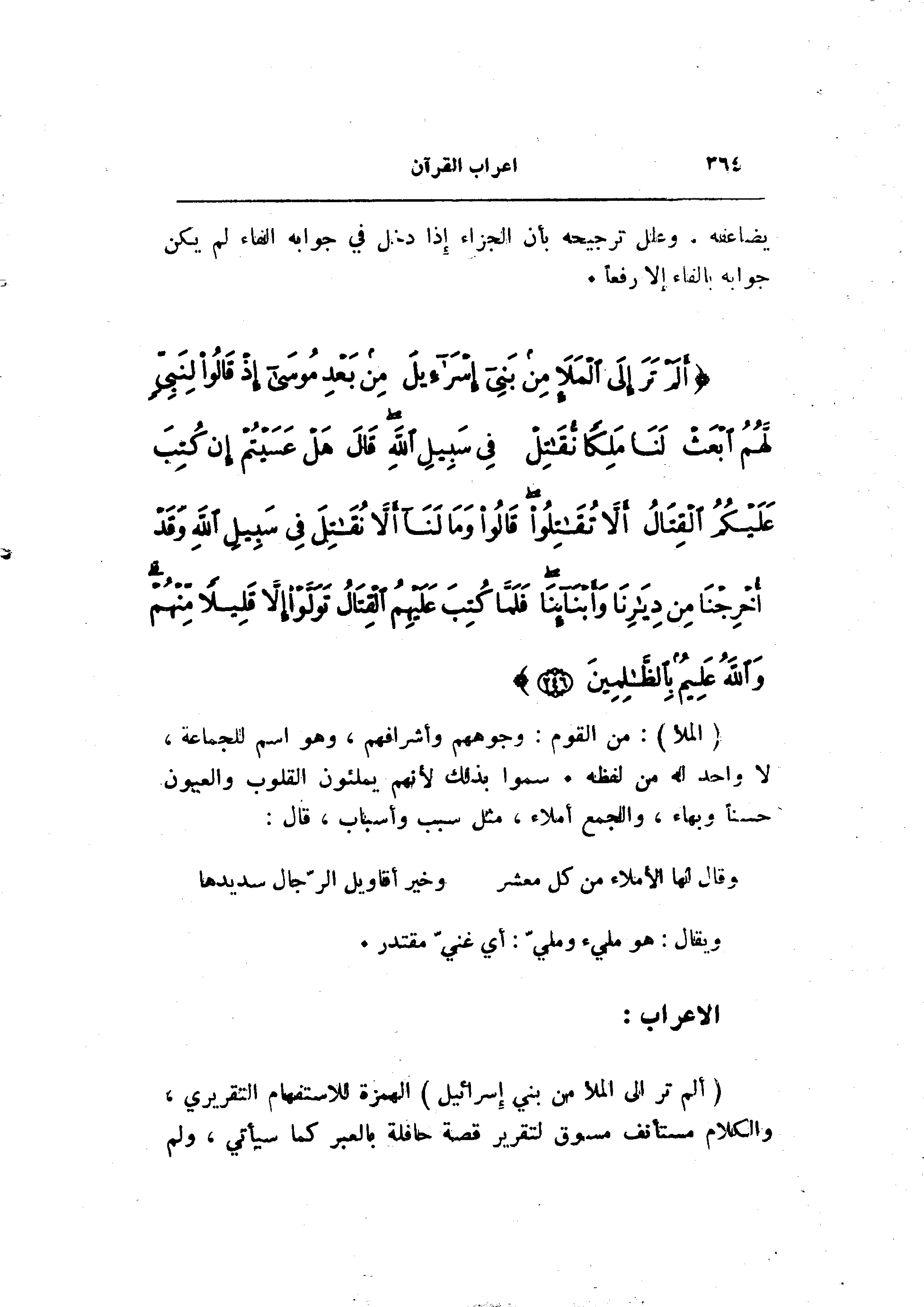 أَلَمْ تَرَ إِلَى الْمَلَإِ مِنْ بَنِي إِسْرائِيلَ مِنْ بَعْدِ مُوسى إِذْ قالُوا لِنَبِيٍّ لَهُمُ ابْعَثْ لَنا مَلِكاً نُقاتِلْ فِي سَبِيلِ اللَّهِ قالَ هَلْ عَسَيْتُمْ إِنْ كُتِبَ عَلَيْكُمُ الْقِتالُ أَلاَّ تُقاتِلُوا قالُوا وَما لَنا أَلاَّ نُقاتِلَ فِي سَبِيلِ اللَّهِ وَقَدْ أُخْرِجْنا مِنْ دِيارِنا وَأَبْنائِنا فَلَمَّا كُتِبَ عَلَيْهِمُ الْقِتالُ تَوَلَّوْا إِلاَّ قَلِيلاً مِنْهُمْ وَاللَّهُ عَلِيمٌ بِالظَّالِمِينَ (246)