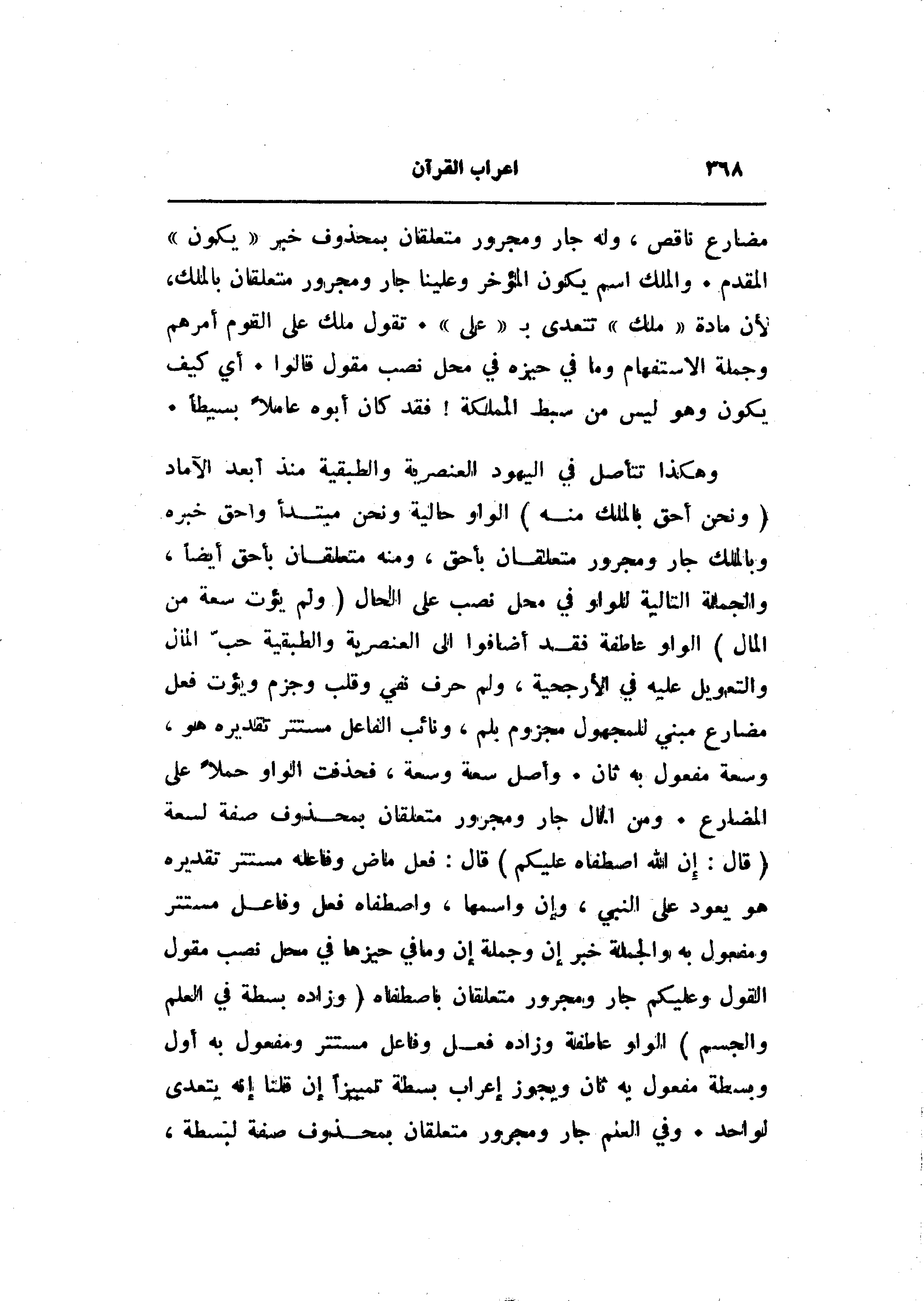 وهكذا تتأصل في اليهود العنصرية والطبقية منذ أبعد الآماد (وَنَحْنُ أَحَقُّ بِالْمُلْكِ مِنْهُ) الواو حالية ونحن مبتدأ وأحق خبره وبالملك جار ومجرور متعلقان بأحق، ومنه متعلقان بأحق أيضا، والجملة التالية للواو في محل نصب على الحال (وَلَمْ يُؤْتَ سَعَةً مِنَ الْمالِ) الواو عاطفة فقد أضافوا الى العنصرية والطبقية حبّ المال والتعويل عليه في الأرجحية، ولم حرف نفي وقلب وجزم ويؤت فعل مضارع مبني للمجهول مجزوم بلم، ونائب الفاعل مستتر تقديره هو، وسعة مفعول به ثان. وأصل سعة وسعة، فحذفت الواو حملا على المضارع. ومن المال جار ومجرور متعلقان بمحذوف صفة لسعة (قالَ: إِنَّ اللَّهَ اصْطَفاهُ عَلَيْكُمْ) قال: فعل ماض وفاعله مستتر تقديره هو يعود على النبي، وإن واسمها، واصطفاه فعل وفاعل مستتر ومفعول به والجملة خبر إن وجملة إن وما في حيزها في محل نصب مقول القول وعليكم جار ومجرور متعلقان باصطفاه (وَزادَهُ بَسْطَةً فِي الْعِلْمِ وَالْجِسْمِ) الواو عاطفة وزاده فعل وفاعل مستتر ومفعول به أول وبسطة مفعول به ثان ويجوز إعراب بسطة تمييزا إن قلنا إنه يتعدى لواحد. وفي العلم جار ومجرور متعلقان بمحذوف صفة لبسطة،