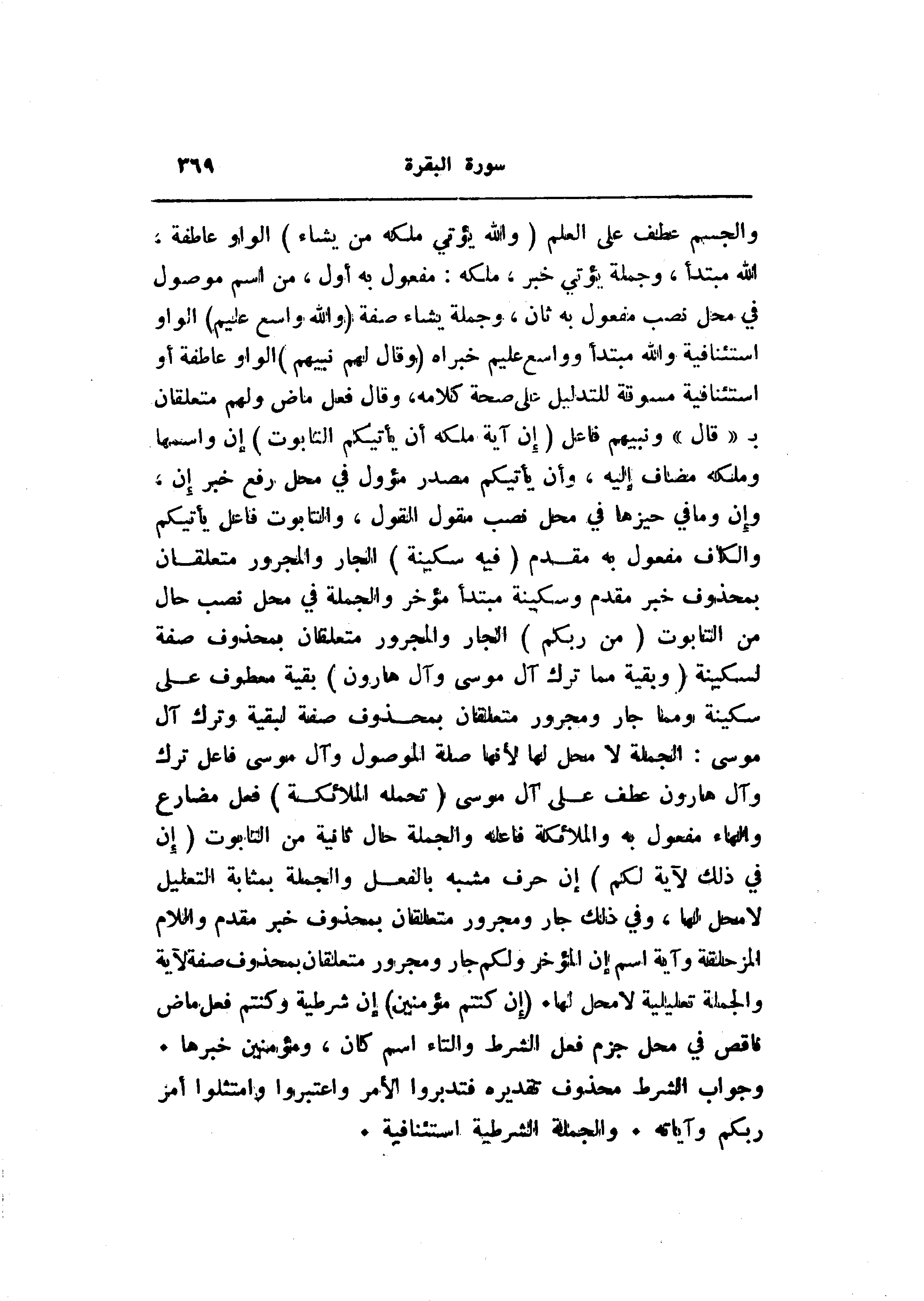 الله مبتدأ، وجملة يؤتي خبر، ملكه: مفعول به أول، من اسم موصول في محل نصب مفعول به ثان، وجملة يشاء صفة (وَاللَّهُ واسِعٌ عَلِيمٌ) الواو استئنافية والله مبتدأ وواسع عليم خبراه (وَقالَ لَهُمْ نَبِيُّهُمْ) الواو عاطفة أو استئنافية مسوقة للتدليل على صحة كلامه، وقال فعل ماض ولهم متعلقان ب «قال» ونبيهم فاعل (إِنَّ آيَةَ مُلْكِهِ أَنْ يَأْتِيَكُمُ التَّابُوتُ) إن واسمها وملكه مضاف إليه، وأن يأتيكم مصدر مؤول في محل رفع خبر إن، وإن وما في حيزها في محل نصب مقول القول، والتابوت فاعل يأتيكم والكاف مفعول به مقدم (فِيهِ سَكِينَةٌ) الجار والمجرور متعلقان بمحذوف خبر مقدم وسكينة مبتدأ مؤخر والجملة في محل نصب حال من التابوت (مِنْ رَبِّكُمْ) الجار والمجرور متعلقان بمحذوف صفة لسكينة (وَبَقِيَّةٌ مِمَّا تَرَكَ آلُ مُوسى وَآلُ هارُونَ) بقية معطوف على سكينة ومما جار ومجرور متعلقان بمحذوف صفة لبقية وترك آل موسى: الجملة لا محل لها لأنها صلة الموصول وآل موسى فاعل ترك وآل هارون عطف على آل موسى (تَحْمِلُهُ الْمَلائِكَةُ) فعل مضارع والهاء مفعول به والملائكة فاعله والجملة حال ثانية من التابوت (إِنَّ فِي ذلِكَ لَآيَةً لَكُمْ) إن حرف مشبه بالفعل والجملة بمثابة التعليل لا محل لها، وفي ذلك جار ومجرور متعلقان بمحذوف خبر مقدم واللام المزحلقة وآية اسم إن المؤخر ولكم جار ومجرور متعلقان بمحذوف صفة لآية والجملة تعليلية لا محل لها. (إِنْ كُنْتُمْ مُؤْمِنِينَ) إن شرطية وكنتم فعل ماض ناقص في محل جزم فعل الشرط والتاء اسم كان، ومؤمنين خبرها.