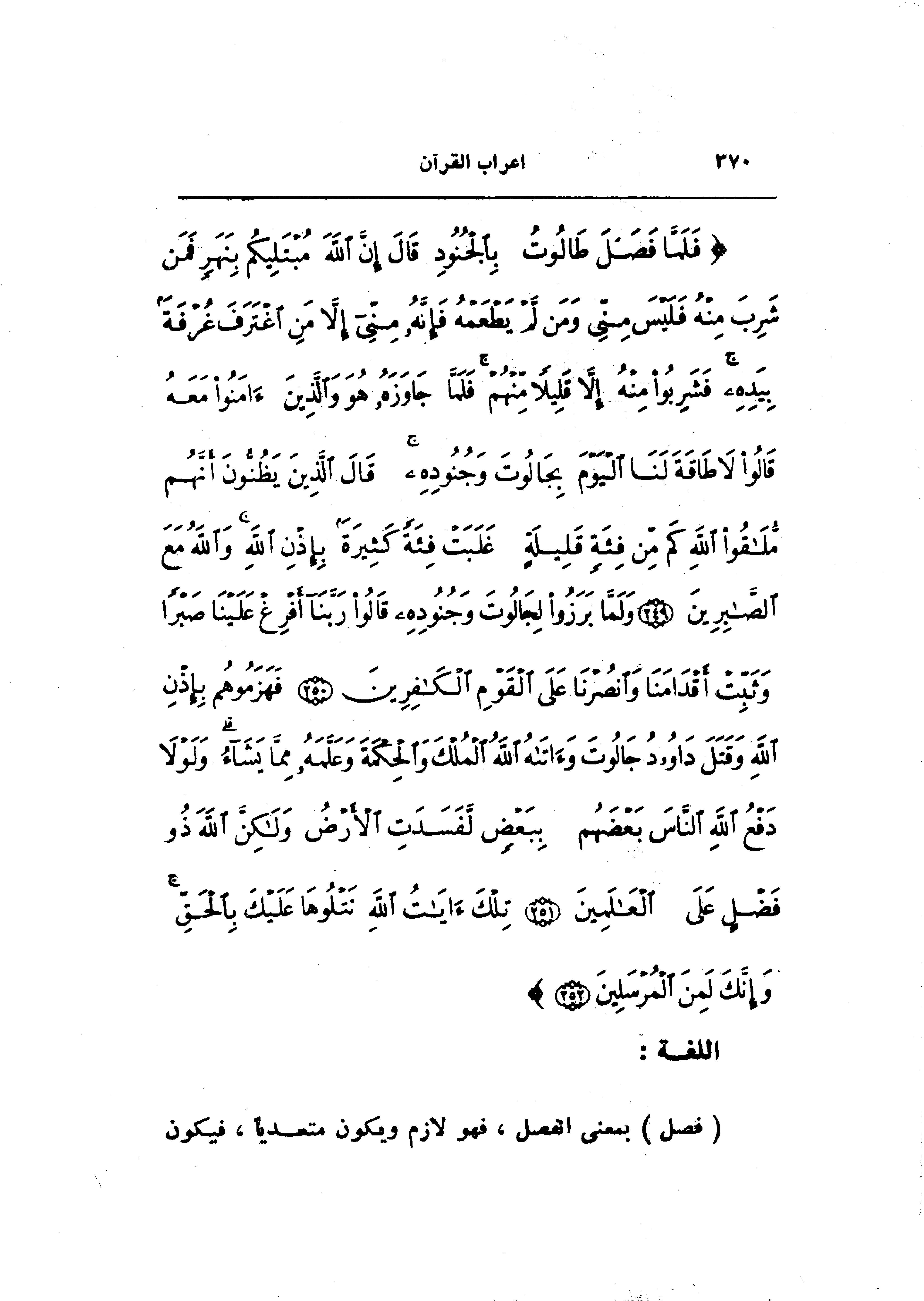 فَلَمَّا فَصَلَ طالُوتُ بِالْجُنُودِ قالَ إِنَّ اللَّهَ مُبْتَلِيكُمْ بِنَهَرٍ فَمَنْ شَرِبَ مِنْهُ فَلَيْسَ مِنِّي وَمَنْ لَمْ يَطْعَمْهُ فَإِنَّهُ مِنِّي إِلاَّ مَنِ اغْتَرَفَ غُرْفَةً بِيَدِهِ فَشَرِبُوا مِنْهُ إِلاَّ قَلِيلاً مِنْهُمْ فَلَمَّا جاوَزَهُ هُوَ وَالَّذِينَ آمَنُوا مَعَهُ قالُوا لا طاقَةَ لَنَا الْيَوْمَ بِجالُوتَ وَجُنُودِهِ قالَ الَّذِينَ يَظُنُّونَ أَنَّهُمْ مُلاقُوا اللَّهِ كَمْ مِنْ فِئَةٍ قَلِيلَةٍ غَلَبَتْ فِئَةً كَثِيرَةً بِإِذْنِ اللَّهِ وَاللَّهُ مَعَ الصَّابِرِينَ (249) وَلَمَّا بَرَزُوا لِجالُوتَ وَجُنُودِهِ قالُوا رَبَّنا أَفْرِغْ عَلَيْنا صَبْراً وَثَبِّتْ أَقْدامَنا وَانْصُرْنا عَلَى الْقَوْمِ الْكافِرِينَ (250) فَهَزَمُوهُمْ بِإِذْنِ اللَّهِ وَقَتَلَ داوُدُ جالُوتَ وَآتاهُ اللَّهُ الْمُلْكَ وَالْحِكْمَةَ وَعَلَّمَهُ مِمَّا يَشاءُ وَلَوْلا دَفْعُ اللَّهِ النَّاسَ بَعْضَهُمْ بِبَعْضٍ لَفَسَدَتِ الْأَرْضُ وَلكِنَّ اللَّهَ ذُو فَضْلٍ عَلَى الْعالَمِينَ (251) تِلْكَ آياتُ اللَّهِ نَتْلُوها عَلَيْكَ بِالْحَقِّ وَإِنَّكَ لَمِنَ الْمُرْسَلِينَ (252)