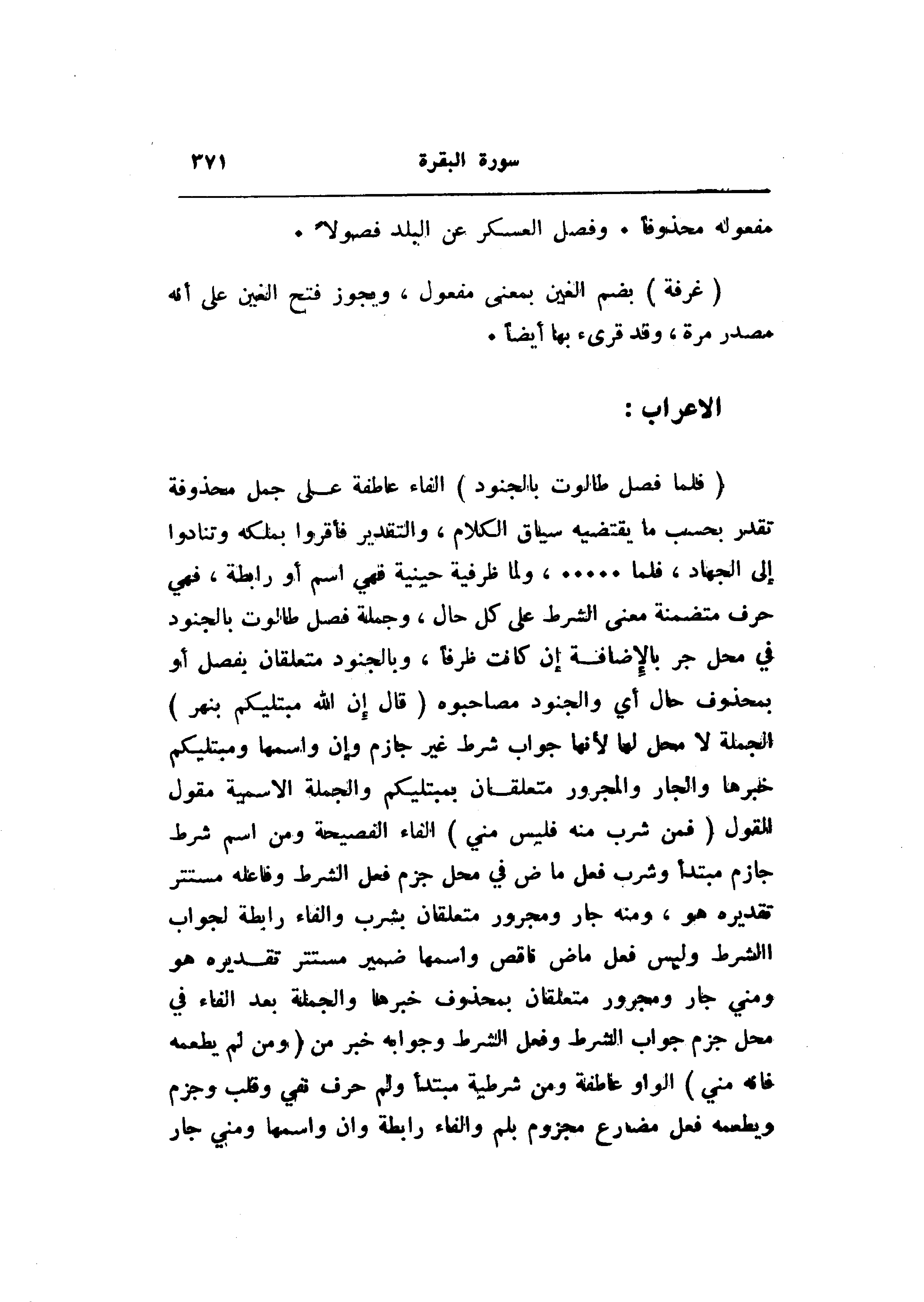 (فَلَمَّا فَصَلَ طالُوتُ بِالْجُنُودِ) الفاء عاطفة على جمل محذوفة تقدر بحسب ما يقتضيه سياق الكلام، والتقدير فأقروا بملكه وتنادوا إلى الجهاد، فلما.....، ولما ظرفية حينية فهي اسم أو رابطة، فهي حرف متضمنة معنى الشرط على كل حال، وجملة فصل طالوت بالجنود في محل جر بالإضافة إن كانت ظرفا، وبالجنود متعلقان بفصل أو بمحذوف حال أي والجنود مصاحبوه (قالَ إِنَّ اللَّهَ مُبْتَلِيكُمْ بِنَهَرٍ) الجملة لا محل لها لأنها جواب شرط غير جازم وإن واسمها ومبتليكم خبرها والجار والمجرور متعلقان بمبتليكم والجملة الاسمية مقول القول (فَمَنْ شَرِبَ مِنْهُ فَلَيْسَ مِنِّي) الفاء الفصيحة ومن اسم شرط جازم مبتدأ وشرب فعل ماض في محل جزم فعل الشرط وفاعله مستتر تقديره هو، ومنه جار ومجرور متعلقان بشرب والفاء رابطة لجواب الشرط وليس فعل ماض ناقص واسمها ضمير مستتر تقديره هو ومني جار ومجرور متعلقان بمحذوف خبرها والجملة بعد الفاء في محل جزم جواب الشرط وفعل الشرط وجوابه خبر من (وَمَنْ لَمْ يَطْعَمْهُ فَإِنَّهُ مِنِّي) الواو عاطفة ومن شرطية مبتدأ ولم حرف نفي وقلب وجزم ويطعمه فعل مضارع مجزوم بلم والفاء رابطة وان واسمها ومني جار
