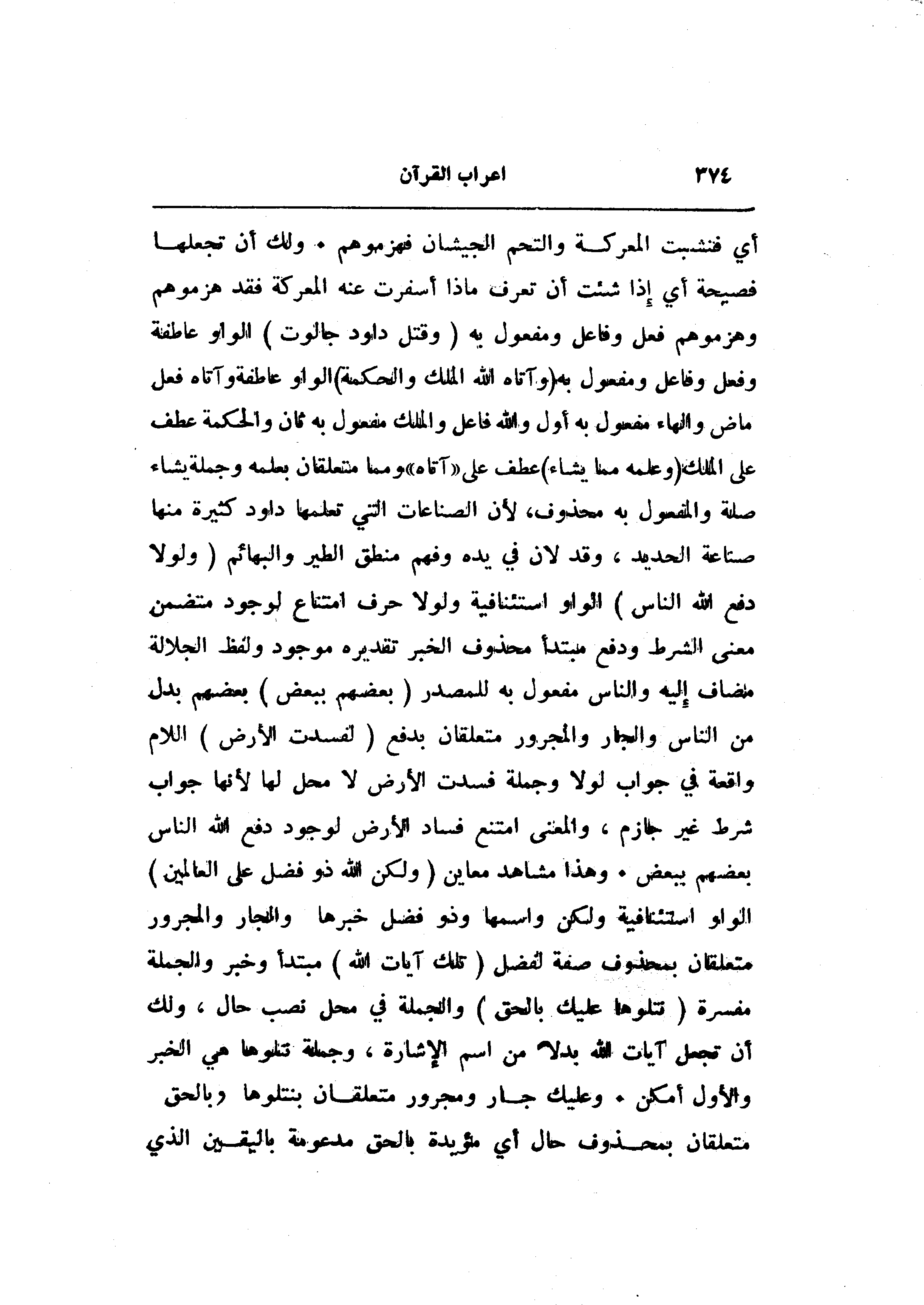 أي فنشبت المعركة والتحم الجيشان فهزموهم. ولك أن تجعلها فصيحة أي إذا شئت أن تعرف ماذا أسفرت عنه المعركة فقد هزموهم وهزموهم فعل وفاعل ومفعول به (وَقَتَلَ داوُدُ جالُوتَ) الواو عاطفة وفعل وفاعل ومفعول به (وَآتاهُ اللَّهُ الْمُلْكَ وَالْحِكْمَةَ) الواو عاطفة وآتاه فعل ماض والهاء مفعول به أول والله فاعل والملك مفعول به ثان والحكمة عطف على الملك (وَعَلَّمَهُ مِمَّا يَشاءُ) عطف على «آتاه» ومما متعلقان بعلمه وجملة يشاء صلة والمفعول به محذوف، لأن الصناعات التي تعلمها داود كثيرة منها صناعة الحديد، وقد لان في يده وفهم منطق الطير والبهائم (وَلَوْلا دَفْعُ اللَّهِ النَّاسَ) الواو استئنافية ولولا حرف امتناع لوجود متضمن معنى الشرط ودفع مبتدأ محذوف الخبر تقديره موجود ولفظ الجلالة مضاف إليه والناس مفعول به للمصدر (بَعْضَهُمْ بِبَعْضٍ) بعضهم بدل من الناس والجار والمجرور متعلقان بدفع (لَفَسَدَتِ الْأَرْضُ) اللام واقعة في جواب لولا وجملة فسدت الأرض لا محل لها لأنها جواب شرط غير جازم، والمعنى امتنع فساد الأرض لوجود دفع الله الناس بعضهم ببعض. وهذا مشاهد معاين (وَلكِنَّ اللَّهَ ذُو فَضْلٍ عَلَى الْعالَمِينَ) الواو استئنافية ولكن واسمها وذو فضل خبرها والجار والمجرور متعلقان بمحذوف صفة لفضل (تِلْكَ آياتُ اللَّهِ) مبتدأ وخبر والجملة مفسرة (نَتْلُوها عَلَيْكَ بِالْحَقِّ) والجملة في محل نصب حال، ولك أن تجعل آيات الله بدلا من اسم الإشارة، وجملة نتلوها هي الخبر والأول أمكن. وعليك جار ومجرور متعلقان بنتلوها وبالحق متعلقان بمحذوف حال أي مؤيدة بالحق مدعومة باليقين الذي