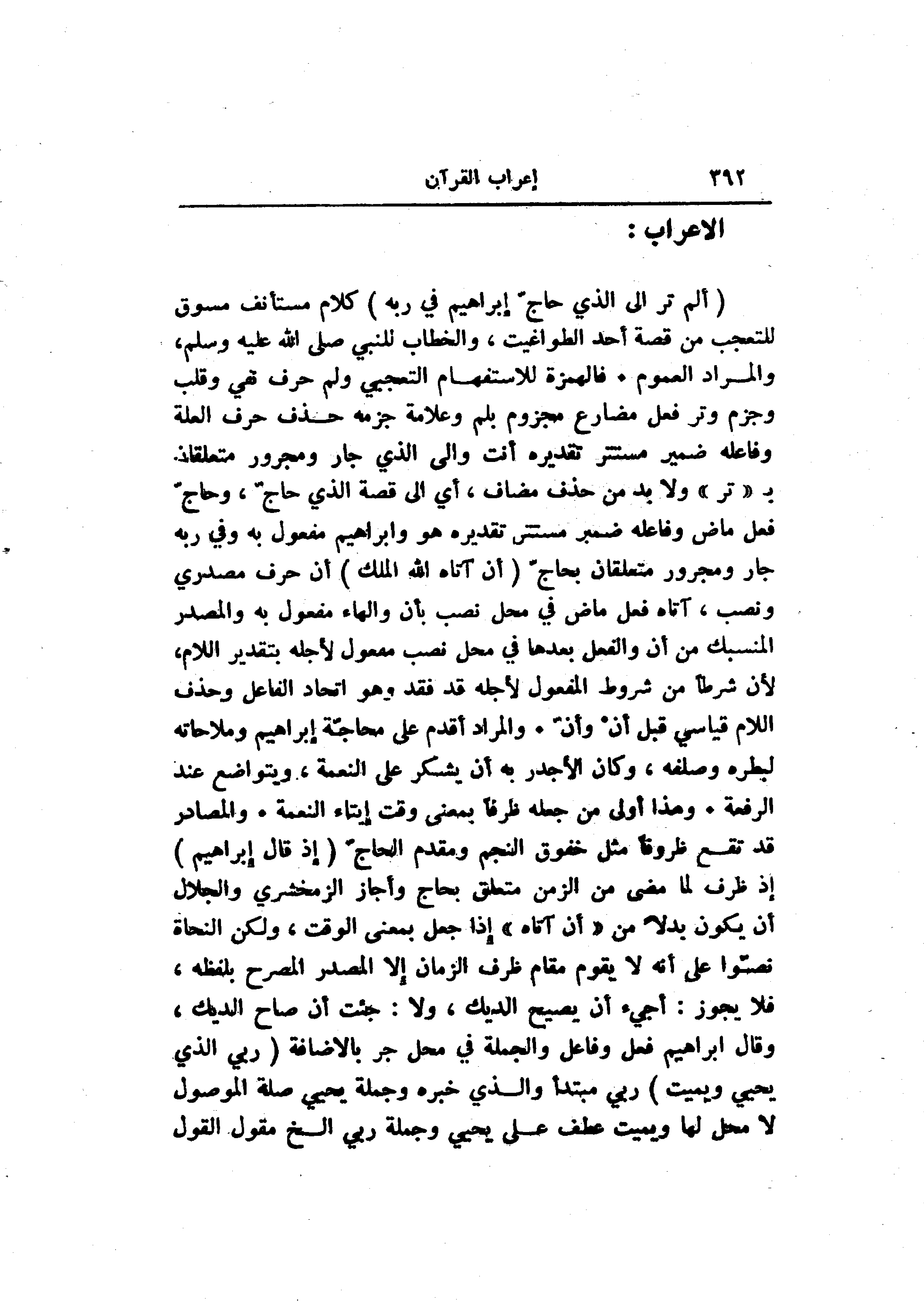(أَلَمْ تَرَ إِلَى الَّذِي حَاجَّ إِبْراهِيمَ فِي رَبِّهِ) كلام مستأنف مسوق للتعجب من قصة أحد الطواغيت، والخطاب للنبي صلى الله عليه وسلم، والمراد العموم. فالهمزة للاستفهام التعجبي ولم حرف نفي وقلب وجزم وتر فعل مضارع مجزوم بلم وعلامة جزمه حذف حرف العلة وفاعله ضمير مستتر تقديره أنت والى الذي جار ومجرور متعلقان ب «تر» ولا بد من حذف مضاف، أي الى قصة الذي حاجّ، وحاجّ فعل ماض وفاعله ضمير مستتر تقديره هو وابراهيم مفعول به وفي ربّه جار ومجرور متعلقان بحاجّ (أَنْ آتاهُ اللَّهُ الْمُلْكَ) أن حرف مصدري ونصب، آتاه فعل ماض في محل نصب بأن والهاء مفعول به والمصدر المنسبك من أن والفعل بعدها في محل نصب مفعول لأجله بتقدير اللام، لأن شرطا من شروط المفعول لأجله قد فقد وهو اتحاد الفاعل وحذف اللام قياسي قبل أن وأنّ. والمراد أقدم على محاجّة إبراهيم وملاحاته لبطره وصلفه، وكان الأجدر به أن يشكر على النعمة، ويتواضع عند الرفعة. وهذا أولى من جملة ظرفا بمعنى وقت إيتاء النعمة. والمصادر قد تقع ظروفا مثل خفوق النجم ومقدم الحاجّ (إِذْ قالَ إِبْراهِيمُ) إذ ظرف لما مضى من الزمن متعلق بحاج وأجاز الزمخشري والجلال أن يكون بدلا من «أن آتاه» إذا جعل بمعنى الوقت، ولكن النحاة نصّوا على أنه لا يقوم مقام ظرف الزمان إلا المصدر المصرح بلفظه، فلا يجوز: أجيء أن يصيح الديك، ولا: جئت أن صاح الديك، وقال ابراهيم فعل وفاعل والجملة في محل جر بالاضافة (رَبِّيَ الَّذِي يُحْيِي وَيُمِيتُ) ربي مبتدأ والذي خبره وجملة يحيي صلة الموصول لا محل لها ويميت عطف على يحيي وجملة ربي إلخ مقول القول