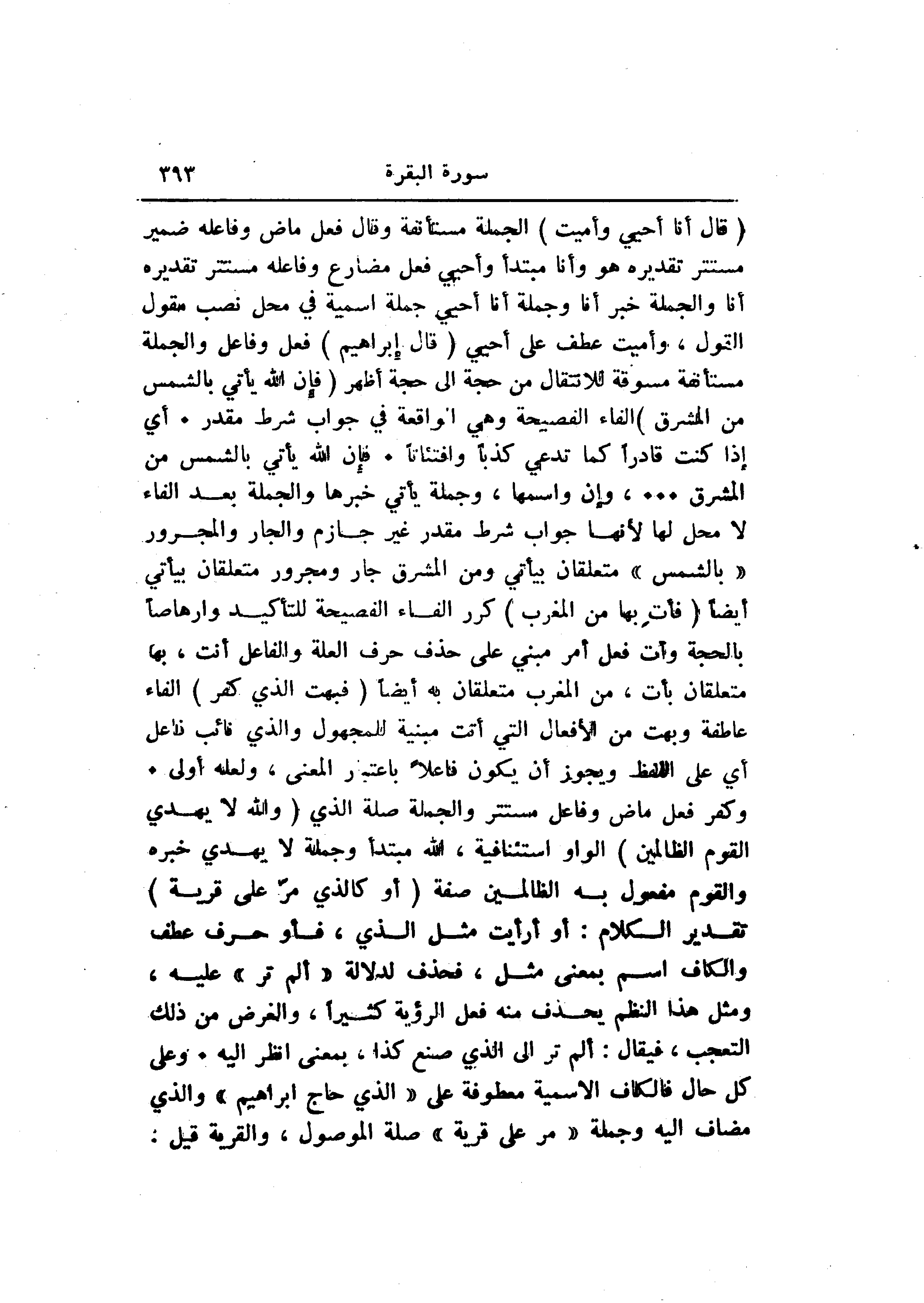 (قالَ أَنَا أُحْيِي وَأُمِيتُ) الجملة مستأنفة وقال فعل ماض وفاعله ضمير مستتر تقديره هو وأنا مبتدأ وأحيي فعل مضارع وفاعله مستتر تقديره أنا والجملة خبر أنا وجملة أنا أحيي جملة اسمية في محل نصب مقول القول، وأميت عطف على أحيي (قالَ إِبْراهِيمُ) فعل وفاعل والجملة مستأنفة مسوقة للانتقال من حجة الى حجة أظهر (فَإِنَّ اللَّهَ يَأْتِي بِالشَّمْسِ مِنَ الْمَشْرِقِ) الفاء الفصيحة وهي الواقعة في جواب شرط مقدر. أي إذا كنت قادرا كما تدعي كذبا وافتئاتا. فإن الله يأتي بالشمس من المشرق ... ، وإن واسمها، وجملة يأتي خبرها والجملة بعد الفاء لا محل لها لأنها جواب شرط مقدر غير جازم والجار والمجرور «بالشمس» متعلقان بيأتي ومن المشرق جار ومجرور متعلقان بيأتي أيضا (فَأْتِ بِها مِنَ الْمَغْرِبِ) كرر الفاء الفصيحة للتأكيد وإرهاصا بالحجة وأت فعل أمر مبني على حذف حرف العلة والفاعل أنت، بها متعلقان بأت، من المغرب متعلقان به أيضا (فَبُهِتَ الَّذِي كَفَرَ) الفاء عاطفة وبهت من الأفعال التي أتت مبنية للمجهول والذي نائب فاعل أي على اللفظ ويجوز أن يكون فاعلا باعتبار المعنى، ولعله أولى.