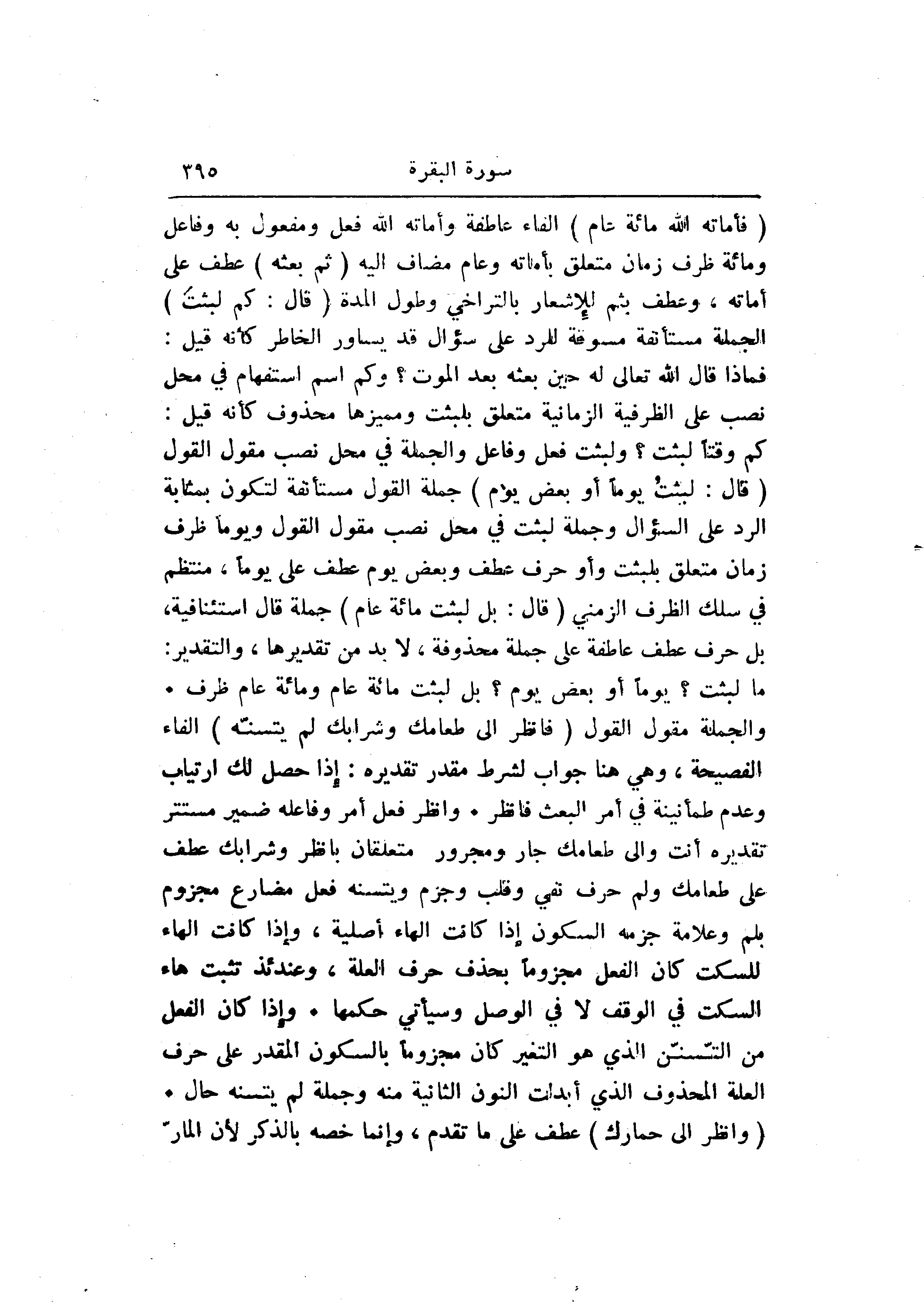 كم وقتا لبثت؟ ولبثت فعل وفاعل والجملة في محل نصب مقول القول (قالَ: لَبِثْتُ يَوْماً أَوْ بَعْضَ يَوْمٍ) جملة القول مستأنفة لتكون بمثابة الرد على السؤال وجملة لبثت في محل نصب مقول القول ويوما ظرف زمان متعلق بلبثت وأو حرف عطف وبعض يوم عطف على يوما، منتظم في سلك الظرف الزمني (قالَ: بَلْ لَبِثْتَ مِائَةَ عامٍ) جملة قال استئنافية، بل حرف عطف عاطفة على جملة محذوفة، لا بد من تقديرها، والتقدير: