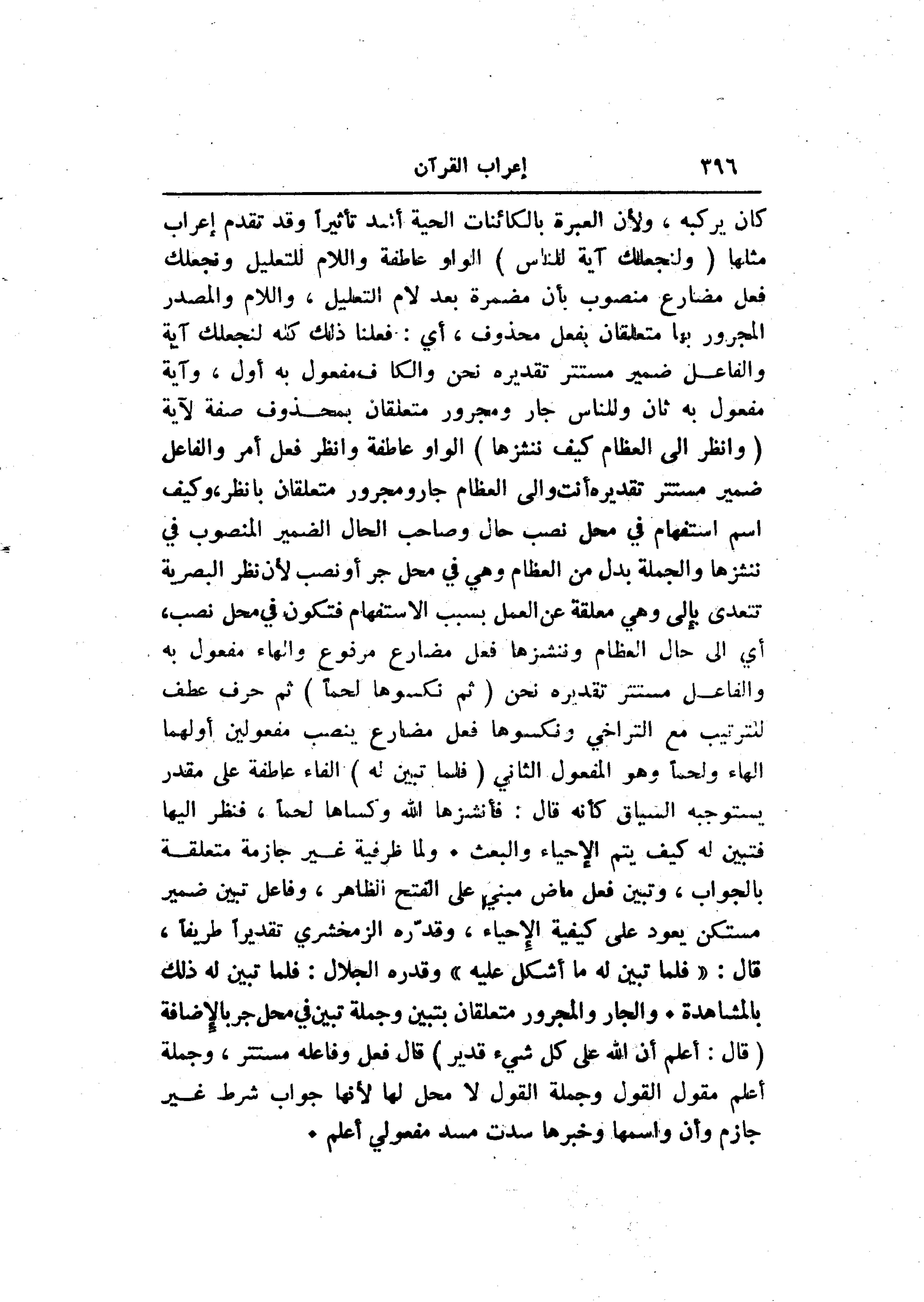 كان يركبه، ولأن العبرة بالكائنات الحية أشد تأثيرا وقد تقدم إعراب مثلها (وَلِنَجْعَلَكَ آيَةً لِلنَّاسِ) الواو عاطفة واللام للتعليل ونجعلك فعل مضارع منصوب بأن مضمرة بعد لام التعليل، واللام والمصدر المجرور بها متعلقان بفعل محذوف، أي: فعلنا ذلك كله لنجعلك آية والفاعل ضمير مستتر تقديره نحن والكاف مفعول به أول، وآية مفعول به ثان وللناس جار ومجرور متعلقان بمحذوف صفة لآية (وَانْظُرْ إِلَى الْعِظامِ كَيْفَ نُنْشِزُها) الواو عاطفة وانظر فعل أمر والفاعل ضمير مستتر تقديره أنت والى العظام جار ومجرور متعلقان بانظر، وكيف اسم استفهام في محل نصب حال وصاحب الحال الضمير المنصوب في ننشزها والجملة بدل من العظام وهي في محل جر أو نصب لأن نظر البصرية تتعدى بإلى وهي معلقة عن العمل بسبب الاستفهام فتكون في محل نصب، أي الى حال العظام وننشزها فعل مضارع مرفوع والهاء مفعول به والفاعل مستتر تقديره نحن (ثُمَّ نَكْسُوها لَحْماً) ثم حرف عطف للترتيب مع التراخي ونكسوها فعل مضارع ينصب مفعولين أولهما الهاء ولحما وهو المفعول الثاني (فَلَمَّا تَبَيَّنَ لَهُ) الفاء عاطفة على مقدر يستوجبه السياق كأنه قال: فأنشزها الله وكساها لحما، فنظر إليها فتبين له كيف يتم الإحياء والبعث. ولما ظرفية غير جازمة متعلقة بالجواب، وتبين فعل ماض مبني على الفتح الظاهر، وفاعل تبين ضمير مستكن يعود على كيفية الإحياء، وقدّره الزمخشري تقديرا طريفا، قال: «فلما تبين له ما أشكل عليه» وقدره الجلال: فلما تبين له ذلك بالمشاهدة. والجار والمجرور متعلقان بتبين وجملة تبين في محل جر بالإضافة (قالَ: أَعْلَمُ أَنَّ اللَّهَ عَلى كُلِّ شَيْءٍ قَدِيرٌ) قال فعل وفاعله مستتر، وجملة أعلم مقول القول وجملة القول لا محل لها لأنها جواب شرط غير جازم وأن واسمها وخبرها سدت مسد مفعولي أعلم.