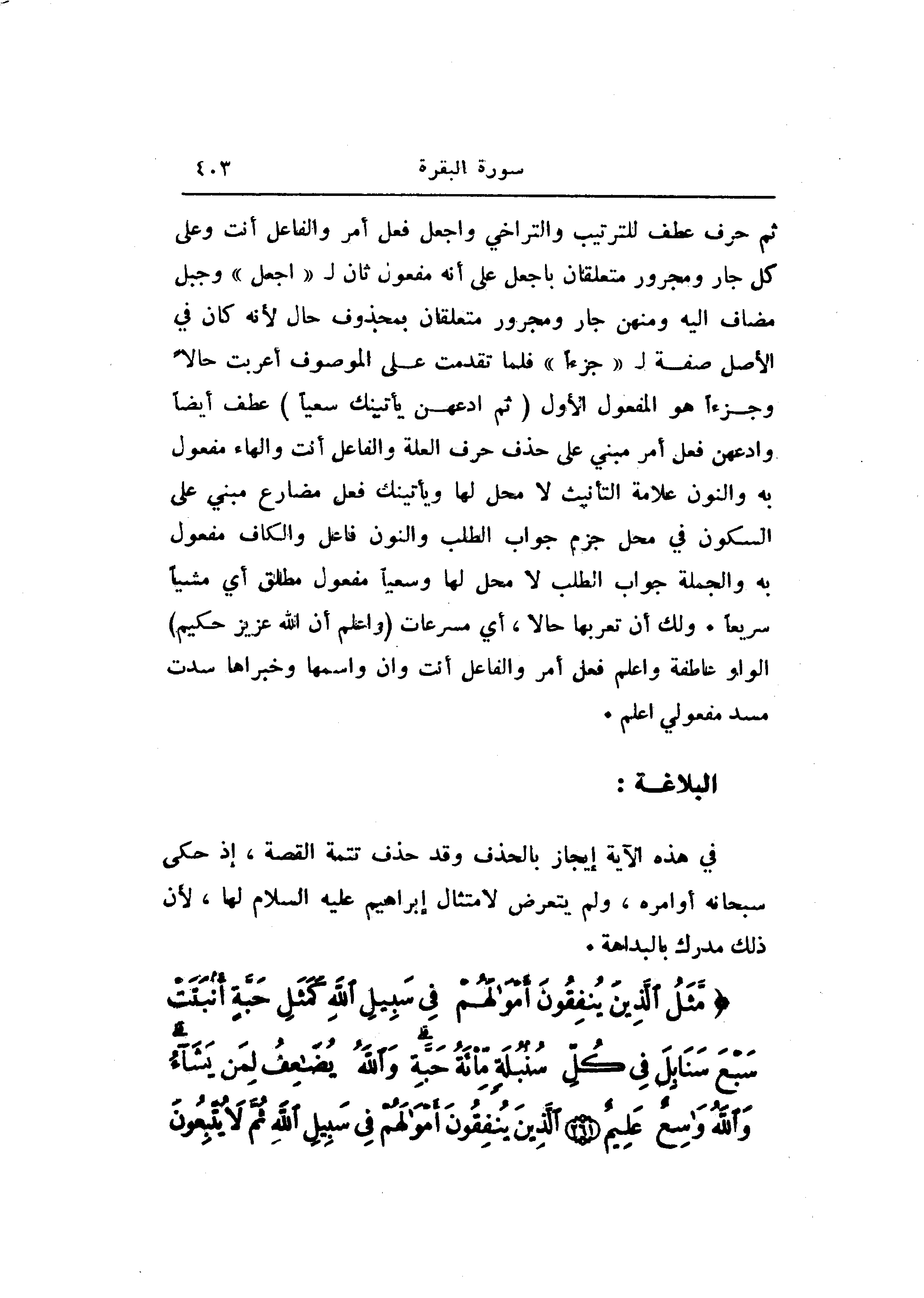 ثم حرف عطف للترتيب والتراخي واجعل فعل أمر والفاعل أنت وعلى كل جار ومجرور متعلقان باجعل على أنه مفعول ثان ل «اجعل» وجبل مضاف اليه ومنهن جار ومجرور متعلقان بمحذوف حال لأنه كان في الأصل صفة ل «جزءا» فلما تقدمت على الموصوف أعربت حالا وجزءا هو المفعول الأول (ثُمَّ ادْعُهُنَّ يَأْتِينَكَ سَعْياً) عطف أيضا وادعهن فعل أمر مبني على حذف حرف العلة والفاعل أنت والهاء مفعول به والنون علامة التأنيث لا محل لها ويأتينك فعل مضارع مبني على السكون في محل جزم جواب الطلب والنون فاعل والكاف مفعول به والجملة جواب الطلب لا محل لها وسعيا مفعول مطلق أي مشيا سريعا. ولك أن تعربها حالا، أي مسرعات (وَاعْلَمْ أَنَّ اللَّهَ عَزِيزٌ حَكِيمٌ) الواو عاطفة واعلم فعل أمر والفاعل أنت وان واسمها وخبراها سدت مسد مفعولي اعلم.