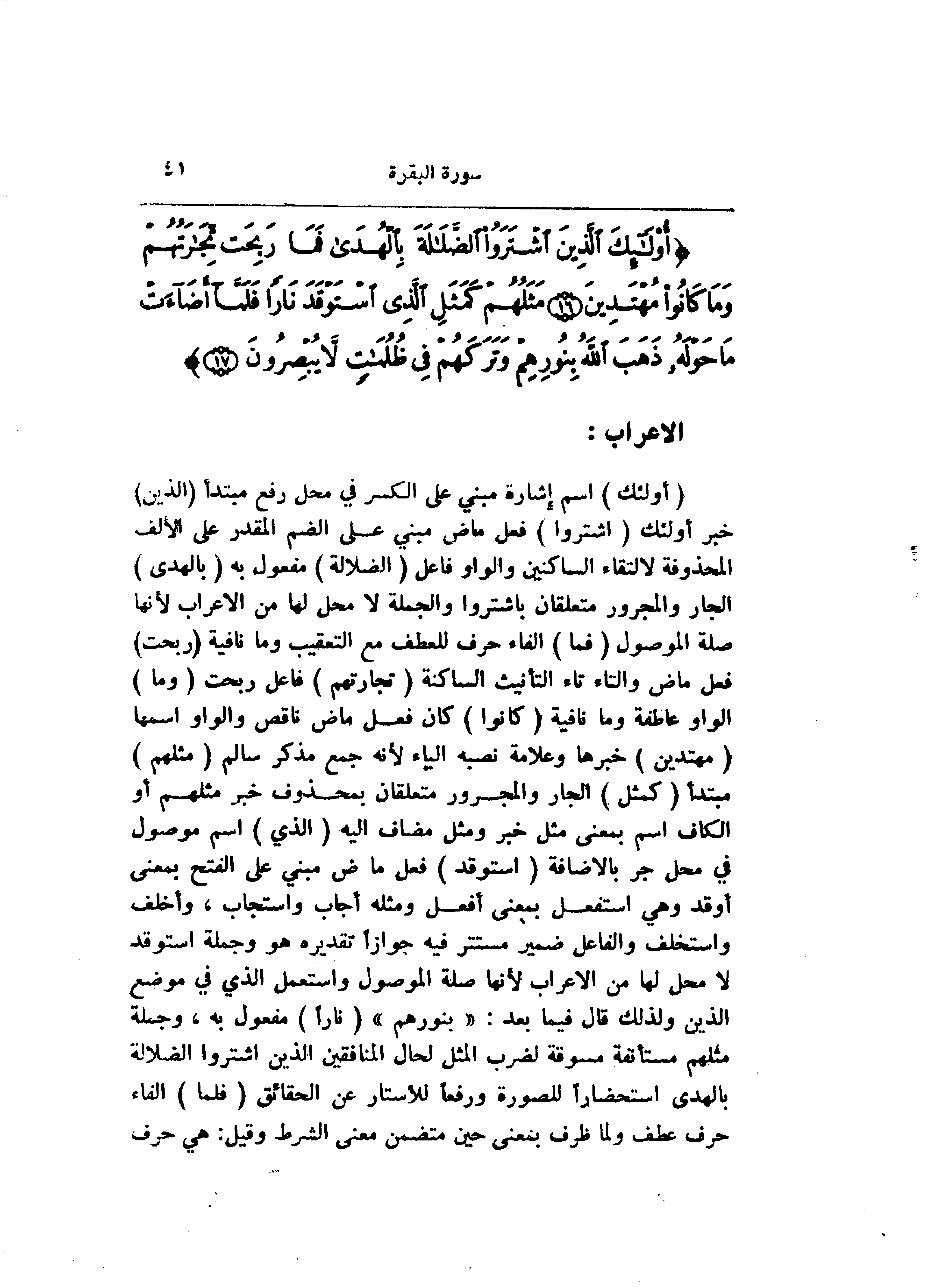 (أُولئِكَ) اسم إشارة مبني على الكسر في محل رفع مبتدأ (الَّذِينَ) خبر أولئك (اشْتَرَوُا) فعل ماض مبني على الضم المقدر على الألف المحذوفة لالتقاء الساكنين والواو فاعل (الضَّلالَةَ) مفعول به (بِالْهُدى) الجار والمجرور متعلقان باشتروا والجملة لا محل لها من الإعراب لأنها صلة الموصول (فَما) الفاء حرف للعطف مع التعقيب وما نافية (رَبِحَتْ) فعل ماض والتاء تاء التأنيث الساكنة (تِجارَتُهُمْ) فاعل ربحت (وَما) الواو عاطفة وما نافية (كانُوا) كان فعل ماض ناقص والواو اسمها (مُهْتَدِينَ) خبرها وعلامة نصبه الياء لأنه جمع مذكر سالم (مَثَلُهُمْ) مبتدأ (كَمَثَلِ) الجار والمجرور متعلقان بمحذوف خبر مثلهم أو الكاف اسم بمعنى مثل خبر ومثل مضاف اليه (الَّذِي) اسم موصول في محل جر بالاضافة (اسْتَوْقَدَ) فعل ماض مبني على الفتح بمعنى أوقد وهي استفعل بمعنى أفعل ومثله أجاب واستجاب، وأخلف واستخلف والفاعل ضمير مستتر فيه جوازا تقديره هو وجملة استوقد لا محل لها من الإعراب لأنها صلة الموصول واستعمل الذي في موضع الذين ولذلك قال فيما بعد: «بنورهم» (ناراً)