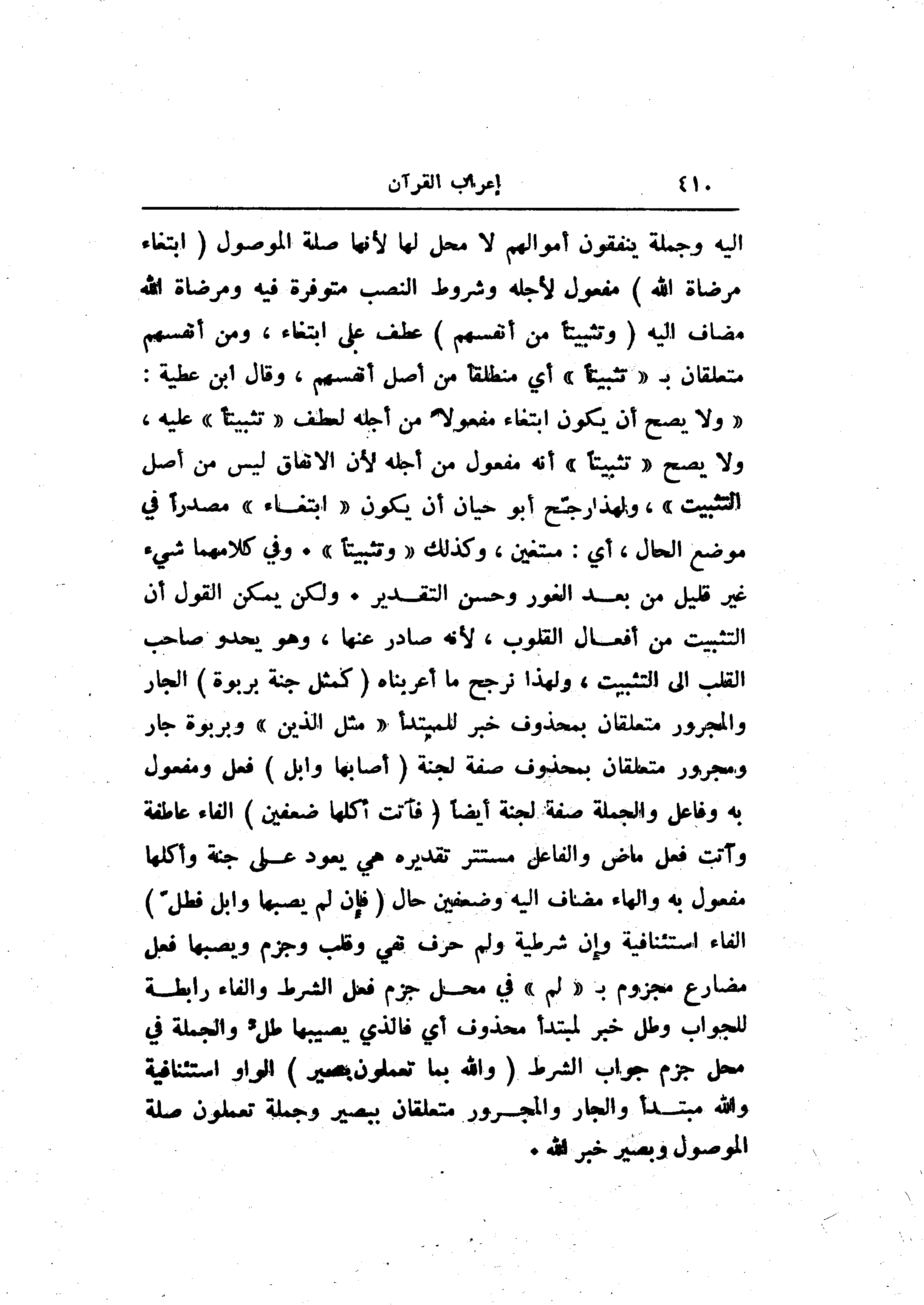 «ولا يصح أن يكون ابتغاء مفعولا من أجله لعطف «تثبيتا» عليه، ولا يصح «تثبيتا» أنه مفعول من أجله لأن الانفاق ليس من أصل التثبيت» ، ولهذا رجّح أبو حيان أن يكون «ابتغاء» مصدرا في موضع الحال، أي: متغين، وكذلك «وتثبيتا» . وفي كلامهما شيء غير قليل من بعد الغور وحسن التقدير. ولكن يمكن القول أن التثبيت من أفعال القلوب، لأنه صادر عنها، وهو يحدو صاحب القلب الى التثبيت، ولهذا نرجح ما أعربناه (كَمَثَلِ جَنَّةٍ بِرَبْوَةٍ) الجار والمجرور متعلقان بمحذوف خبر للمبتدأ «مثل الذين» وبربوة جار ومجرور متعلقان بمحذوف صفة لجنة (أَصابَها وابِلٌ) فعل ومفعول به وفاعل والجملة صفة لجنة أيضا (فَآتَتْ أُكُلَها ضِعْفَيْنِ) الفاء عاطفة وآتت فعل ماض والفاعل مستتر تقديره هي يعود على جنة وأكلها مفعول به والهاء مضاف اليه وضعفين حال (فَإِنْ لَمْ يُصِبْها وابِلٌ فَطَلٌّ) الفاء استئنافية وإن شرطية ولم حرف نفي وقلب وجزم ويصبها فعل مضارع مجزوم ب «لم» في محل جزم فعل الشرط والفاء رابطة للجواب وطل خبر لمبتدأ محذوف أي فالذي يصيبها طلّ والجملة في محل جزم جواب الشرط (وَاللَّهُ بِما تَعْمَلُونَ بَصِيرٌ) الواو استئنافية والله مبتدأ والجار والمجرور متعلقان ببصير وجملة تعملون صلة الموصول وبصير خبر الله.