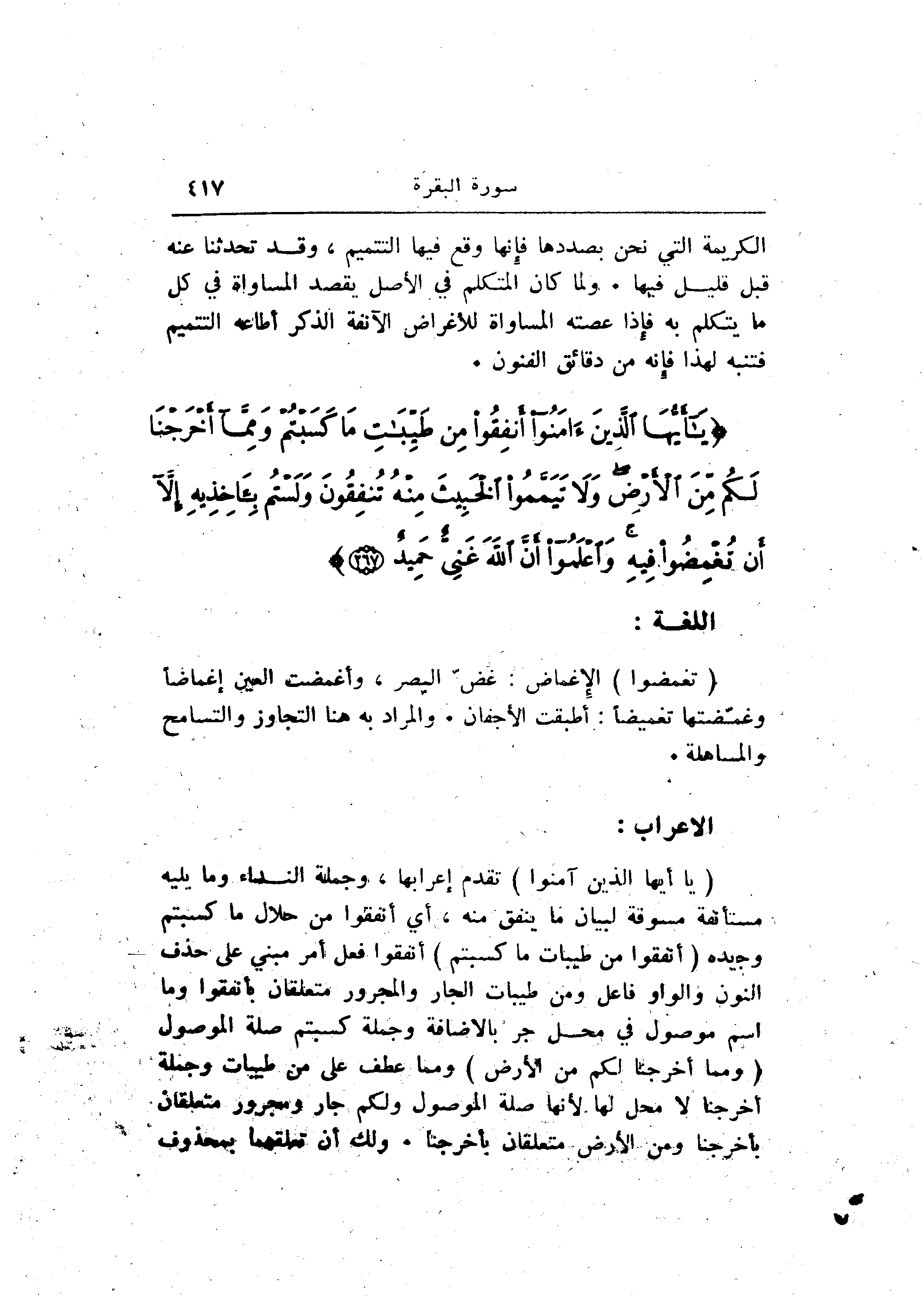 (يا أَيُّهَا الَّذِينَ آمَنُوا) تقدم إعرابها، وجملة النداء وما يليه مستأنفة مسوقة لبيان ما ينفق منه، أي أنفقوا من حلال ما كسبتم وجيده (أَنْفِقُوا مِنْ طَيِّباتِ ما كَسَبْتُمْ) أنفقوا فعل أمر مبني على حذف النون والواو فاعل ومن طيبات الجار والمجرور متعلقان بأنفقوا وما اسم موصول في محل جر بالاضافة وجملة كسبتم صلة الموصول (وَمِمَّا أَخْرَجْنا لَكُمْ مِنَ الْأَرْضِ) ومما عطف على من طيبات وجملة أخرجنا لا محل لها لأنها صلة الموصول ولكم جار ومجرور متعلقان بأخرجنا ومن الأرض متعلقان بأخرجنا. ولك أن تعلقهما بمحذوف