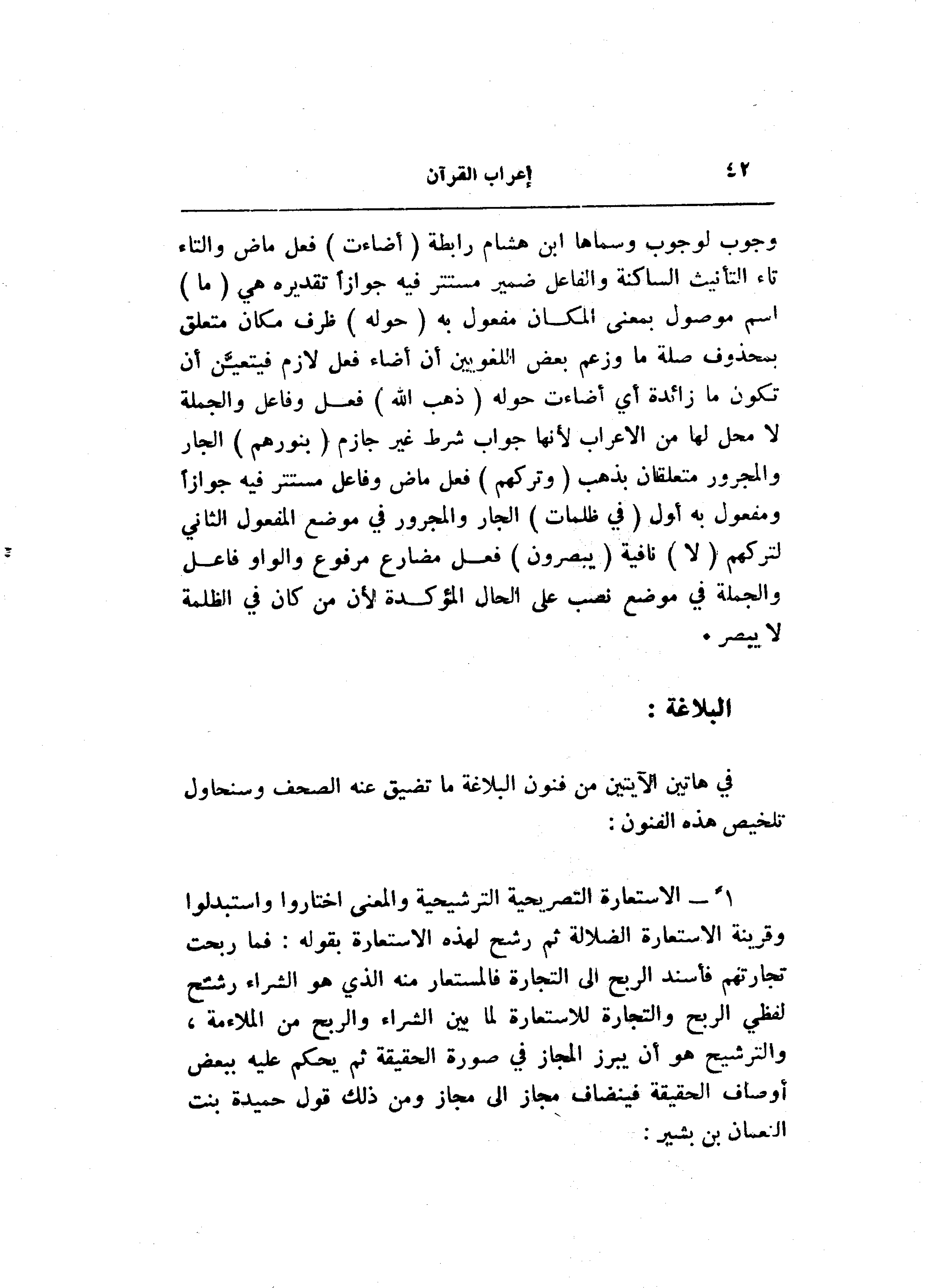 1- الاستعارة التصريحية الترشيحية والمعنى اختاروا واستبدلوا وقرينة الاستعارة الضلالة ثم رشح لهذه الاستعارة بقوله: فما ربحت تجارتهم فأسند الربح الى التجارة فالمستعار منه الذي هو الشراء رشّح لفظي الربح والتجارة للاستعارة لما بين الشراء والربح من الملاءمة، والترشيح هو أن يبرز المجاز في صورة الحقيقة ثم يحكم عليه ببعض أوصاف الحقيقة فينضاف مجاز الى مجاز ومن ذلك قول حميدة بنت النعمان بن بشير: