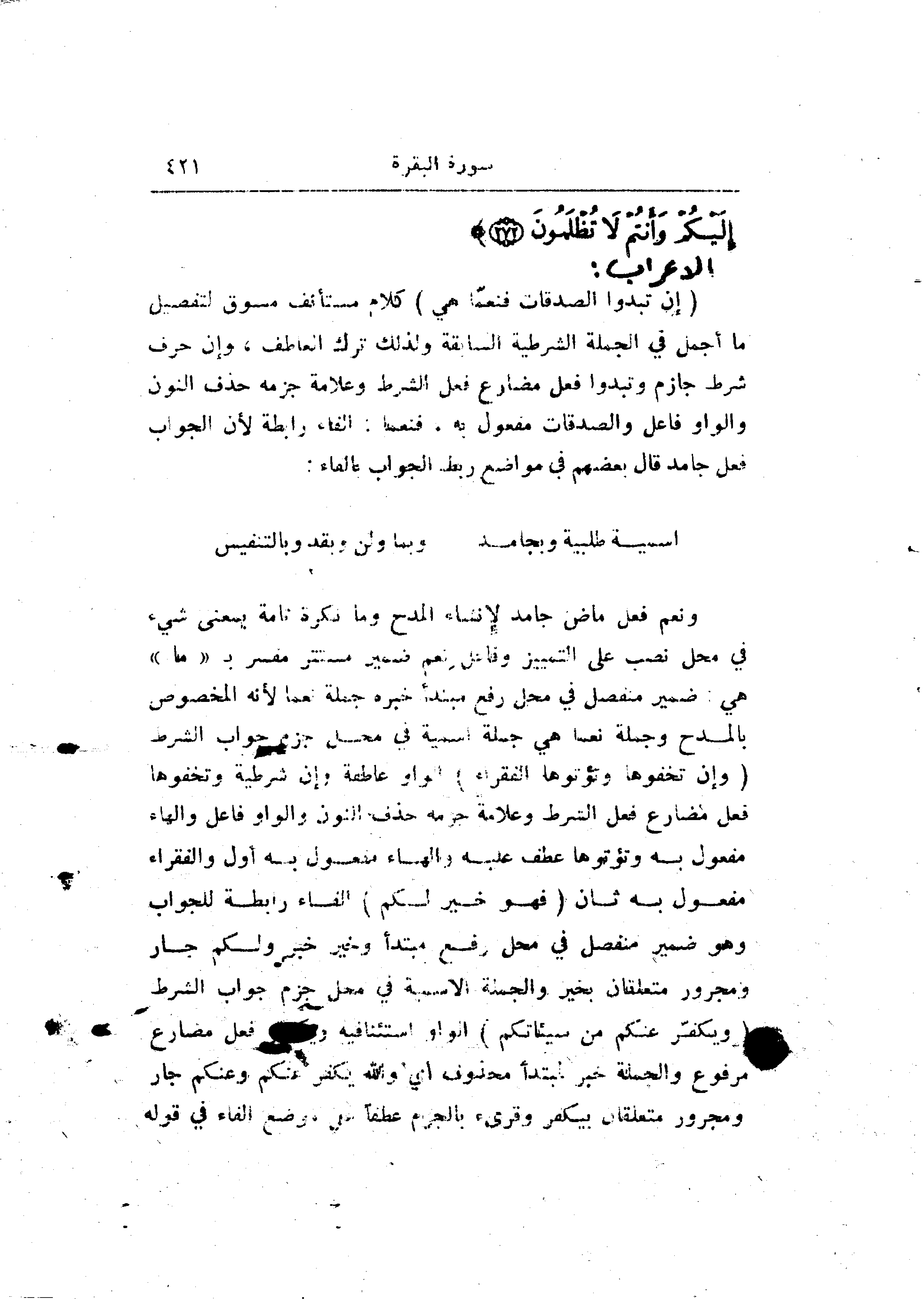 ونعم فعل ماض جامد لإنشاء المدح وما نكرة تامة بمعنى شيء في محل نصب على التمييز وفاعل نعم ضمير مستتر مفسر ب «ما» هي: ضمير منفصل في محل رفع مبتدأ خبره جملة نعما لأنه المخصوص بالمدح وجملة نعما هي جملة اسمية في محل جزم جواب الشرط (وَإِنْ تُخْفُوها وَتُؤْتُوهَا الْفُقَراءَ) الواو عاطفة وإن شرطية وتخفوها فعل مضارع فعل الشرط وعلامة جزمه حذف النون والواو فاعل والهاء مفعول به وتؤتوها عطف عليه والهاء مفعول به أول والفقراء مفعول به ثان (فَهُوَ خَيْرٌ لَكُمْ) الفاء رابطة للجواب وهو ضمير منفصل في محل رفع مبتدأ وخير خبر ولكم جار ومجرور متعلقان بخير والجملة الاسمية في محل جزم جواب الشرط (وَيُكَفِّرُ عَنْكُمْ مِنْ سَيِّئاتِكُمْ) الواو استئنافية ويكفّر فعل مضارع مرفوع والجملة خبر لمبتدأ محذوف أي والله يكفر عنكم وعنكم جار ومجرور متعلقان بيكفر وقرىء بالجزم عطفا على موضع الفاء في قوله