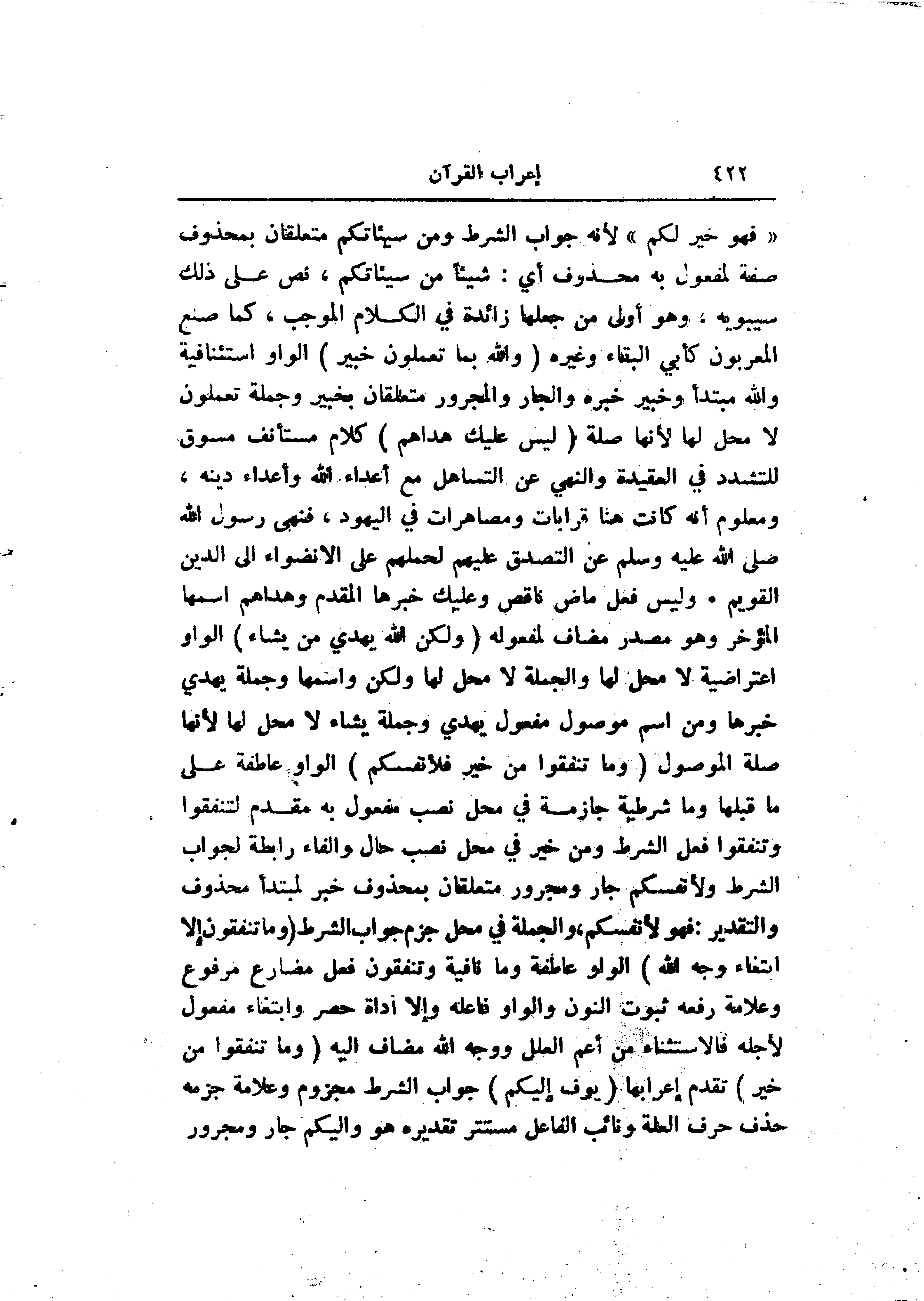 «فهو خير لكم» لأنه جواب الشرط ومن سيئاتكم متعلقان بمحذوف صفة لمفعول به محذوف أي: شيئا من سيئاتكم، نص على ذلك سيبويه، وهو أولى من جعلها زائدة في الكلام الموجب، كما صنع المعربون كأبي البقاء وغيره (وَاللَّهُ بِما تَعْمَلُونَ خَبِيرٌ) الواو استئنافية والله مبتدأ وخبير خبره والجار والمجرور متعلقان بخبير وجملة تعملون لا محل لها لأنها صلة (لَيْسَ عَلَيْكَ هُداهُمْ) كلام مستأنف مسوق للتشدد في العقيدة والنهي عن التساهل مع أعداء الله وأعداء دينه، ومعلوم أنه كانت هنا قرابات ومصاهرات في اليهود، فنهى رسول الله صلى الله عليه وسلم عن التصدق عليهم لحملهم على الانضواء الى الدين القويم. وليس فعل ماض ناقص وعليك خبرها المقدم وهداهم اسمها المؤخر وهو مصدر مضاف لمفعوله (وَلكِنَّ اللَّهَ يَهْدِي مَنْ يَشاءُ) الواو اعتراضية لا محل لها والجملة لا محل لها ولكن واسمها وجملة يهدي خبرها ومن اسم موصول مفعول يهدي وجملة يشاء لا محل لها لأنها صلة الموصول (وَما تُنْفِقُوا مِنْ خَيْرٍ فَلِأَنْفُسِكُمْ) الواو عاطفة على ما قبلها وما شرطية جازمة في محل نصب مفعول به مقدم لتنفقوا وتنفقوا فعل الشرط ومن خير في محل نصب حال والفاء رابطة لجواب الشرط ولأنفسكم جار ومجرور متعلقان بمحذوف خبر لمبتدأ محذوف والتقدير: فهو لأنفسكم، والجملة في محل جزم جواب الشرط (وَما تُنْفِقُونَ إِلَّا ابْتِغاءَ وَجْهِ اللَّهِ) الواو عاطفة وما نافية وتنفقون فعل مضارع مرفوع وعلامة رفعه ثبوت النون والواو فاعله وإلا اداة حصر وابتغاء مفعول لأجله فالاستثناء من أعم العلل ووجه الله مضاف اليه (وَما تُنْفِقُوا مِنْ خَيْرٍ) تقدم إعرابها (يُوَفَّ إِلَيْكُمْ) جواب الشرط مجزوم وعلامة جزمه حذف حرف العلة ونائب الفاعل مستتر تقديره هو وإليكم جار ومجرور
