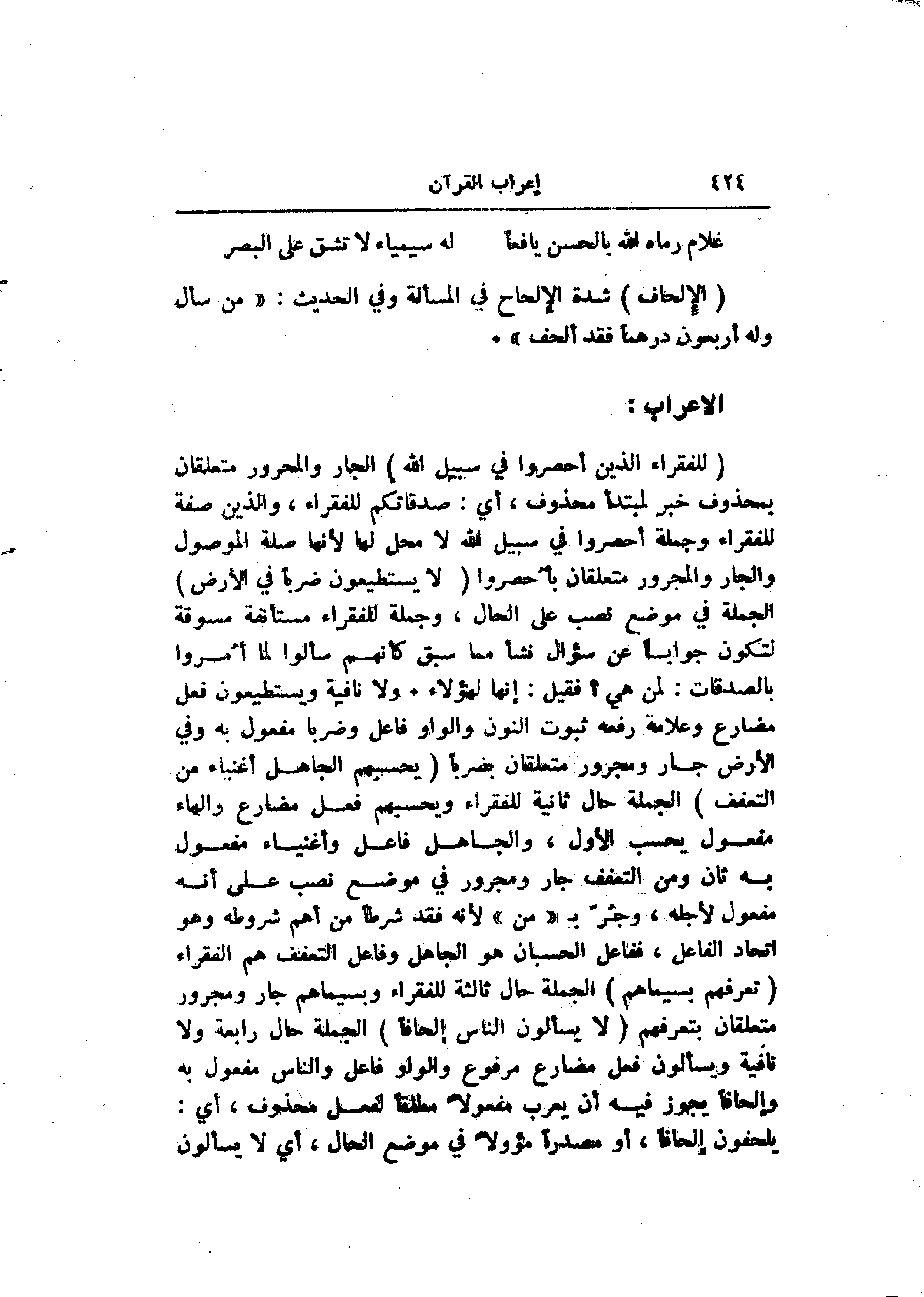 (لِلْفُقَراءِ الَّذِينَ أُحْصِرُوا فِي سَبِيلِ اللَّهِ) الجار والمجرور متعلقان بمحذوف خبر لمبتدأ محذوف، أي: صدقاتكم للفقراء، والذين صفة للفقراء وجملة أحصروا في سبيل الله لا محل لها لأنها صلة الموصول والجار والمجرور متعلقان بأحصروا (لا يَسْتَطِيعُونَ ضَرْباً فِي الْأَرْضِ) الجملة في موضع نصب على الحال، وجملة للفقراء مستأنفة مسوقة لتكون جوابا عن سؤال نشأ مما سبق كأنهم سألوا لما أمروا بالصدقات: لمن هي؟ فقيل: إنها لهؤلاء. ولا نافية ويستطيعون فعل مضارع وعلامة رفعه ثبوت النون والواو فاعل وضربا مفعول به وفي الأرض جار ومجرور متعلقان بضربا (يَحْسَبُهُمُ الْجاهِلُ أَغْنِياءَ مِنَ التَّعَفُّفِ) الجملة حال ثانية للفقراء ويحسبهم فعل مضارع والهاء مفعول يحسب الأول، والجاهل فاعل وأغنياء مفعول به ثان ومن التعفف جار ومجرور في موضع نصب على أنه مفعول لأجله، وجرّ ب «من» لأنه فقد شرطا من أهم شروطه وهو اتحاد الفاعل، ففاعل الحسبان هو الجاهل وفاعل التعفف هم الفقراء (تَعْرِفُهُمْ بِسِيماهُمْ) الجملة حال ثالثة للفقراء وبسيماهم جار ومجرور متعلقان بتعرفهم (لا يَسْئَلُونَ النَّاسَ إِلْحافاً) الجملة حال رابعة ولا نافية ويسألون فعل مضارع مرفوع والواو فاعل والناس مفعول به وإلحافا يجوز فيه أن يعرب مفعولا مطلقا لفعل محذوف، أي:
