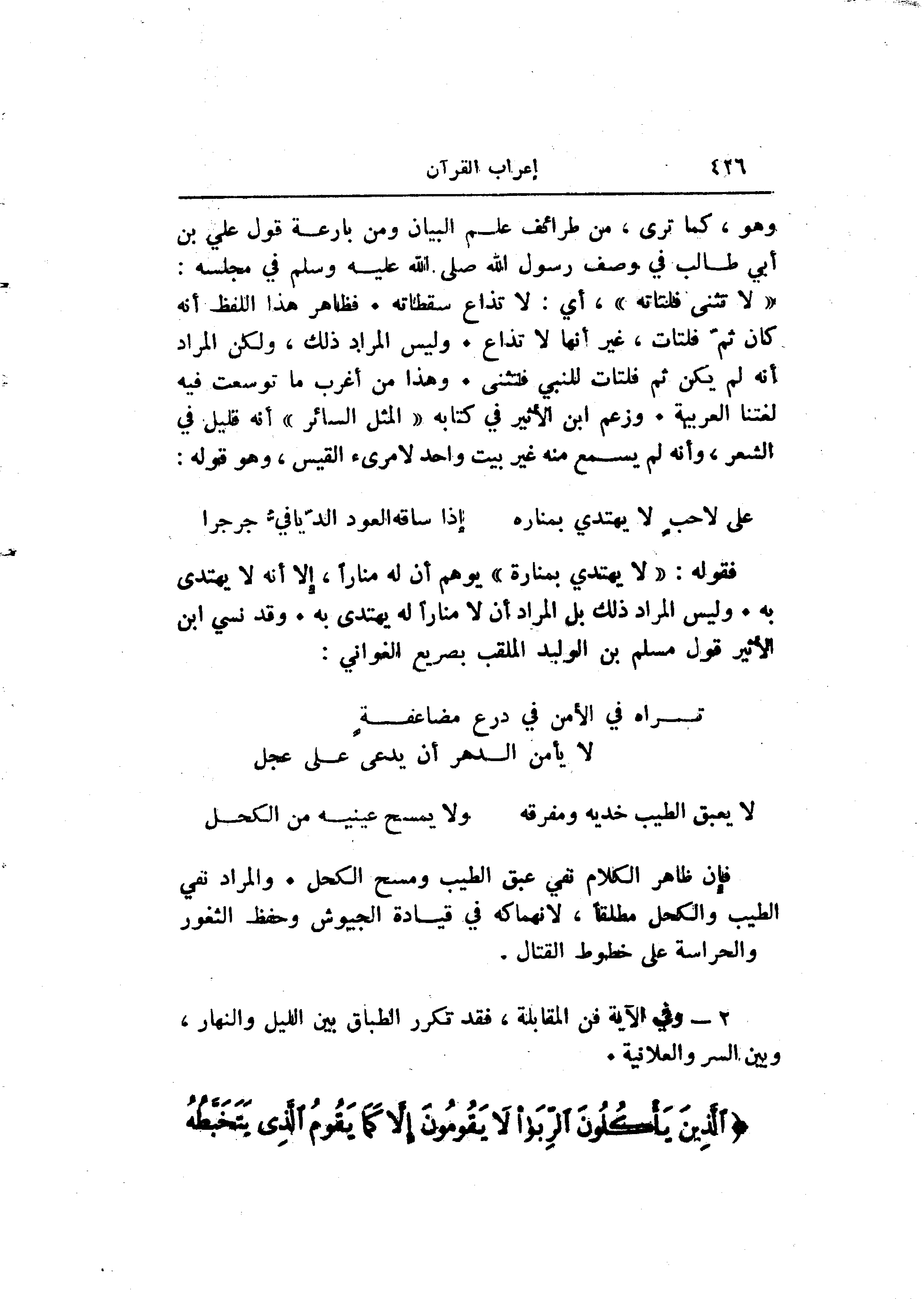 «لا تثنى فلتاته» ، أي: لا تذاع سقطاته. فظاهر هذا اللفظ أنه كان ثمّ فلتات، غير أنها لا تذاع. وليس المراد ذلك، ولكن المراد أنه لم يكن ثم فلتات للنبي فتثنى. وهذا من أغرب ما توسعت فيه لغتنا العربية. وزعم ابن الأثير في كتابه «المثل السائر» أنه قليل في الشعر، وأنه لم يسمع منه غير بيت واحد لامرىء القيس، وهو قوله:
