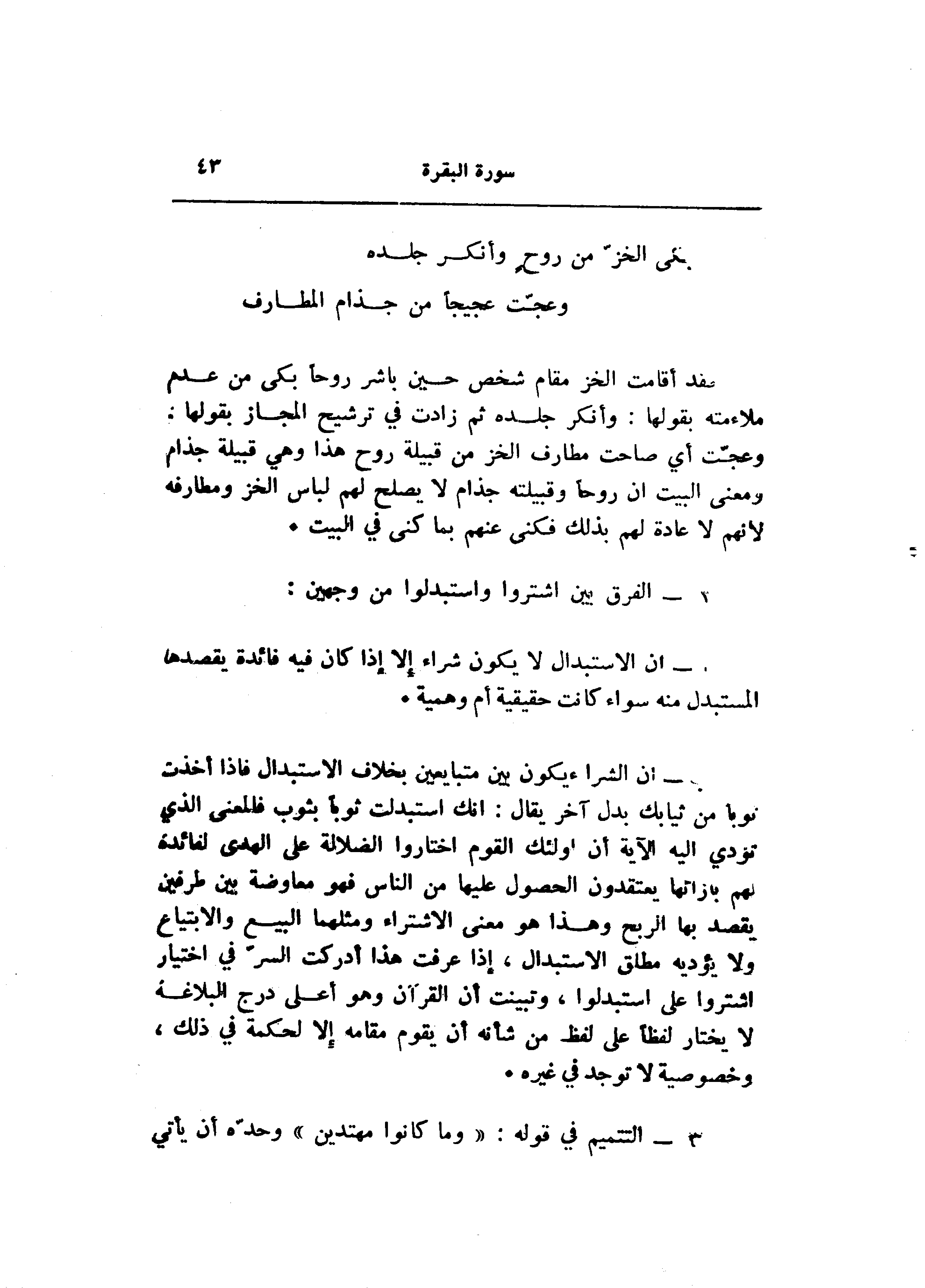 ب- ان الشراء يكون بين متبايعين بخلاف الاستبدال فاذا أخذت ثوبا من ثيابك بدل آخر يقال: انك استبدلت ثوبا بثوب فالمعنى الذي تؤدي إليه الآية أن أولئك القوم اختاروا الضلالة على الهدى لفائدة لهم بإزائها يعتقدون الحصول عليها من الناس فهو معاوضة بين طرفين يقصد بها الربح وهذا هو معنى الاشتراء ومثلهما البيع والابتياع ولا يؤديه مطلق الاستبدال، إذا عرفت هذا أدركت السرّ في اختيار اشتروا على استبدلوا، وتبينت أن القرآن وهو أعلى درج البلاغة لا يختار لفظا على لفظ من شأنه أن يقوم مقامه إلا لحكمة في ذلك، وخصوصية لا توجد في غيره.