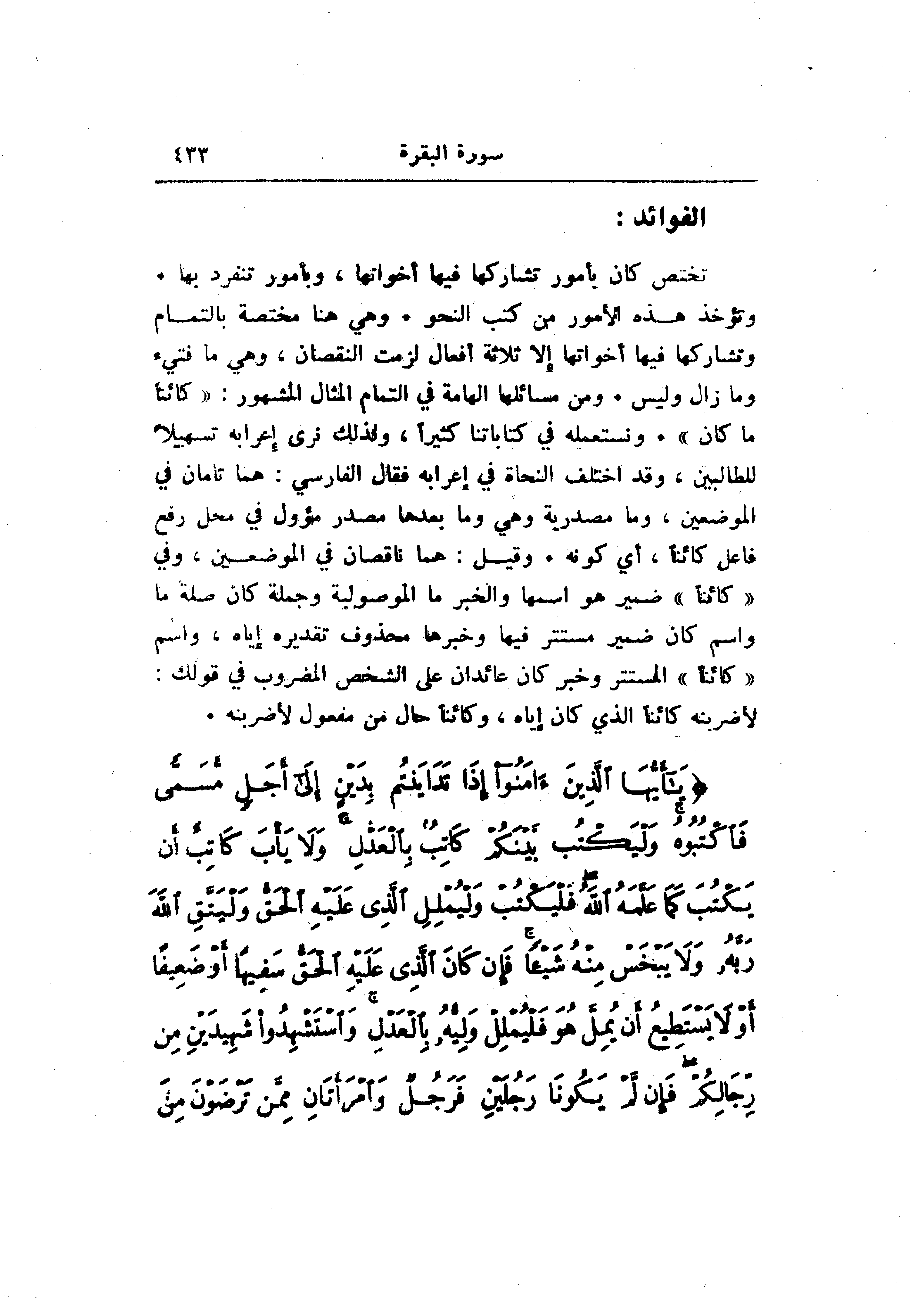 وتؤخذ هذه الأمور من كتب النحو. وهي هنا مختصة بالتمام وتشاركها فيها أخواتها إلا ثلاثة أفعال لزمت النقصان، وهي ما فتيء وما زال وليس. ومن مسائلها الهامة في التمام المثال المشهور: «كائنا ما كان» . ونستعمله في كتاباتنا كثيرا، ولذلك نرى إعرابه تسهيلا للطالبين، وقد اختلف النحاة في إعرابه فقال الفارسي: هما تامان في الموضعين، وما مصدرية وهي وما بعدها مصدر مؤول في محل رفع فاعل كائنا، أي كونه. وقيل: هما ناقصان في الموضعين، وفي «كائنا» ضمير هو اسمها والخبر ما الموصولية وجملة كان صلة ما واسم كان ضمير مستتر فيها وخبرها محذوف تقديره إياه، واسم «كائنا» المستتر وخبر كان عائدان على الشخص المضروب في قولك: