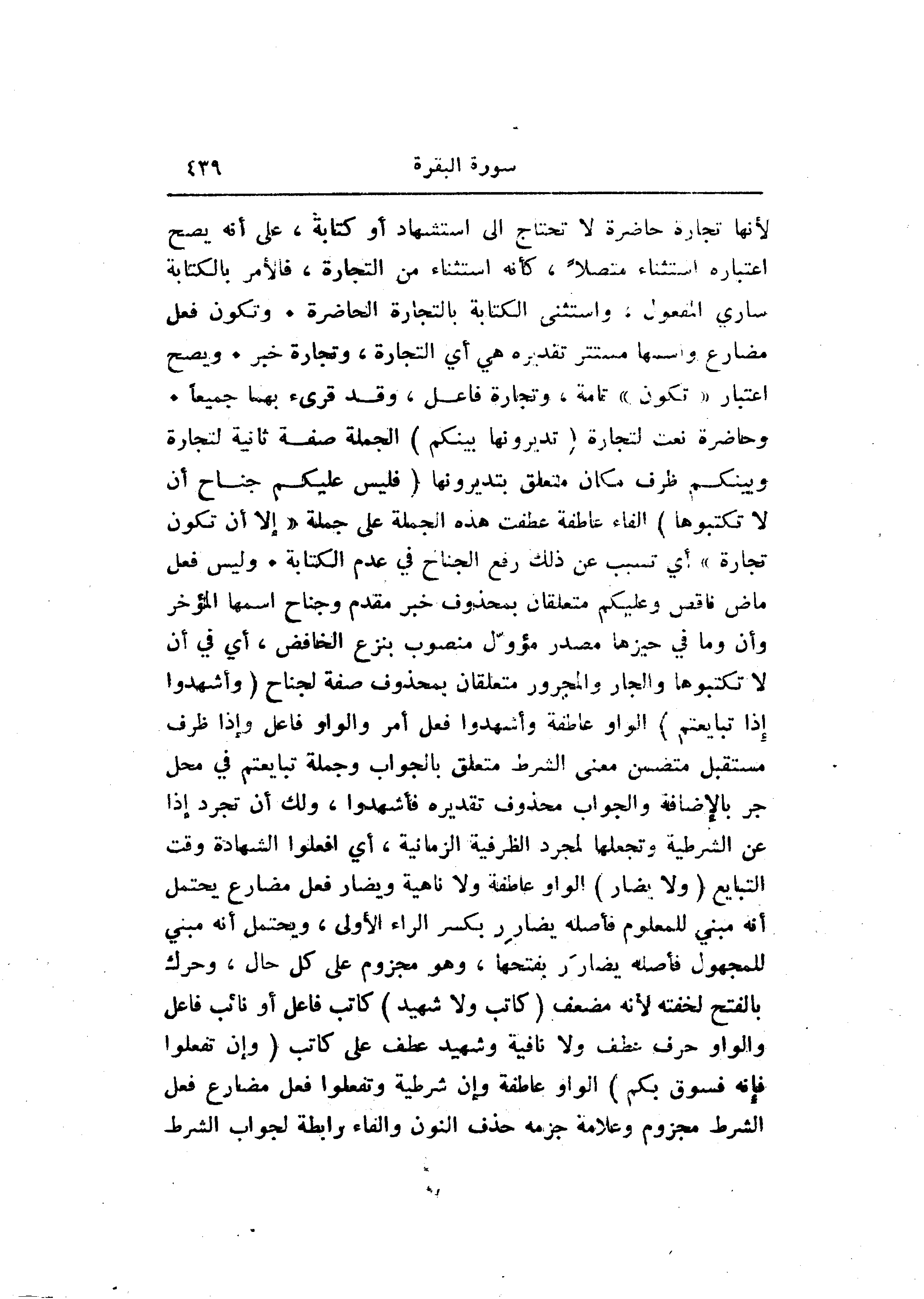 وحاضرة نعت لتجارة (تُدِيرُونَها بَيْنَكُمْ) الجملة صفة ثانية لتجارة وبينكم ظرف مكان متعلق بتديرونها (فَلَيْسَ عَلَيْكُمْ جُناحٌ أَلَّا تَكْتُبُوها) الفاء عاطفة عطفت هذه الجملة على جملة «إلا أن تكون تجارة» أي تسبب عن ذلك رفع الجناح في عدم الكتابة. وليس فعل ماض ناقص وعليكم متعلقان بمحذوف خبر مقدم وجناح اسمها المؤخر وأن وما في حيزها مصدر مؤوّل منصوب بنزع الخافض، أي في أن لا تكتبوها والجار والمجرور متعلقان بمحذوف صفة لجناح (وَأَشْهِدُوا إِذا تَبايَعْتُمْ) الواو عاطفة وأشهدوا فعل أمر والواو فاعل وإذا ظرف مستقبل متضمن معنى الشرط متعلق بالجواب وجملة تبايعتم في محل جر بالإضافة والجواب محذوف تقديره فأشهدوا، ولك أن تجرد إذا عن الشرطية وتجعلها لمجرد الظرفية الزمانية، أي افعلوا الشهادة وقت التبايع (وَلا يُضَارَّ) الواو عاطفة ولا ناهية ويضار فعل مضارع يحتمل أنه مبني للمعلوم فأصله يضارر بكسر الراء الأولى، ويحتمل أنه مبني للمجهول فأصله يضارر بفتحها، وهو مجزوم على كل حال، وحرك بالفتح لخفته لأنه مضعف (كاتِبٌ وَلا شَهِيدٌ) كاتب فاعل أو نائب فاعل والواو حرف عطف ولا نافية وشهيد عطف على كاتب (وَإِنْ تَفْعَلُوا فَإِنَّهُ فُسُوقٌ بِكُمْ) الواو عاطفة وإن شرطية وتفعلوا فعل مضارع فعل الشرط مجزوم وعلامة جزمه حذف النون والفاء رابطة لجواب الشرط