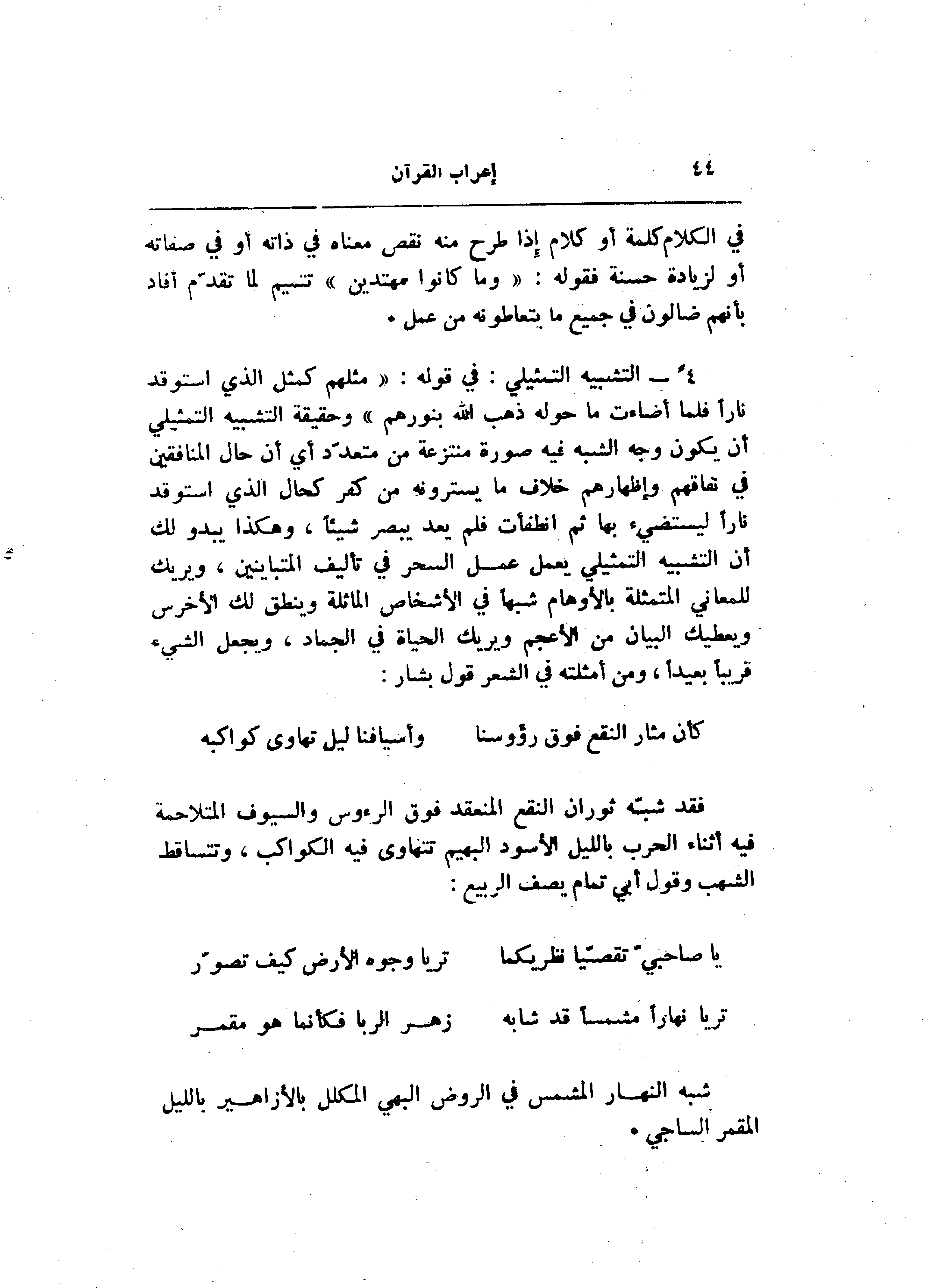 4- التشبيه التمثيلي: في قوله: «مثلهم كمثل الذي استوقد نارا فلما أضاءت ما حوله ذهب الله بنورهم» وحقيقة التشبيه التمثيلي أن يكون وجه الشبه فيه صورة منتزعة من متعدّد أي أن حال المنافقين في نفاقهم وإظهارهم خلاف ما يسترونه من كفر كحال الذي استوقد نارا ليستضيء بها ثم انطفأت فلم يعد يبصر شيئا، وهكذا يبدو لك أن التشبيه التمثيلي يعمل عمل السحر في تأليف المتباينين، ويريك للمعاني المتمثلة بالأوهام شبها في الأشخاص الماثلة وينطق لك الأخرس ويعطيك البيان من الأعجم ويريك الحياة في الجماد، ويجعل الشيء قريبا بعيدا، ومن أمثلته في الشعر قول بشار:
