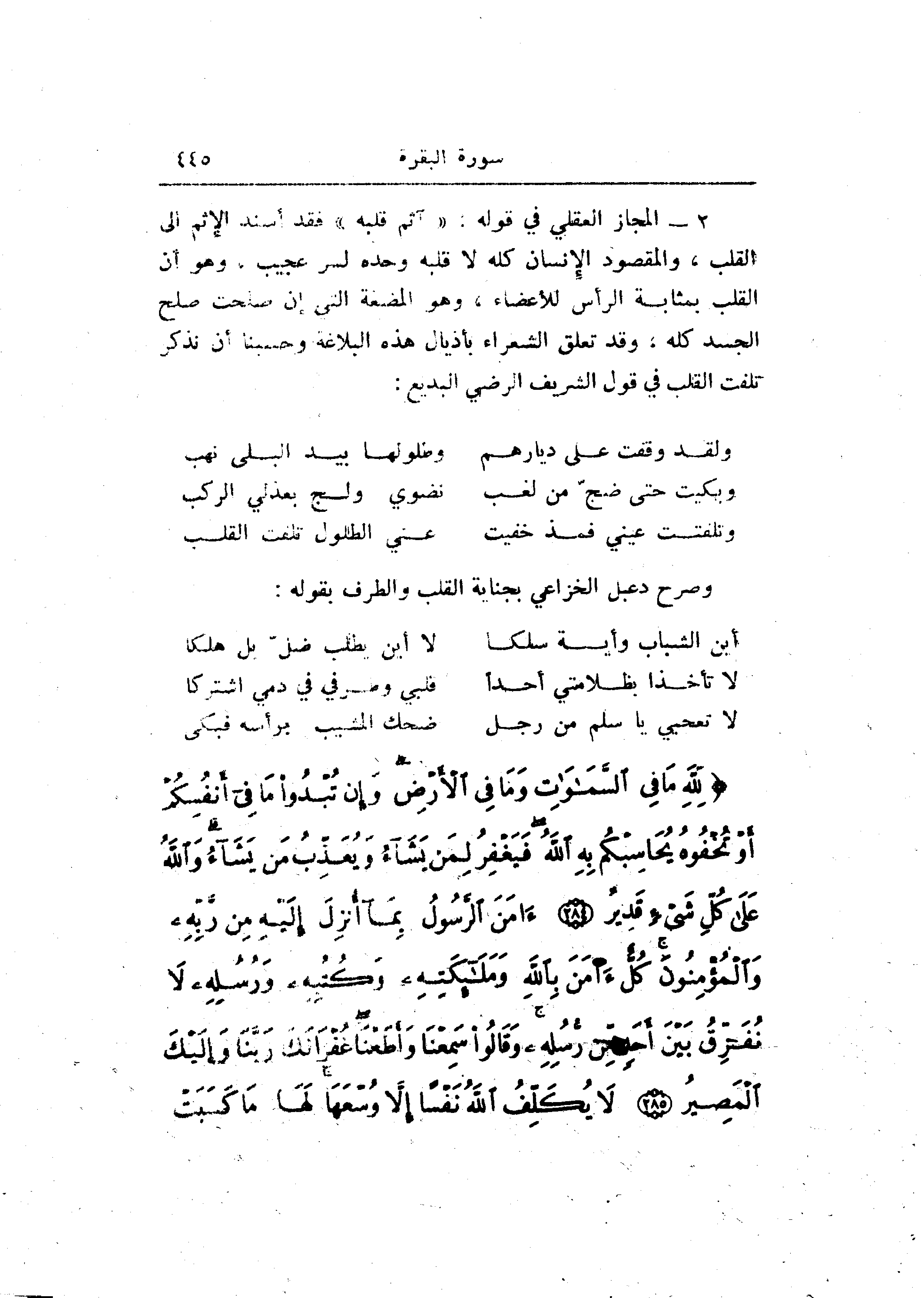 2- المجاز العقلي في قوله: «آثم قلبه» فقد أسند الإثم الى القلب، والمقصود الإنسان كله لا قلبه وحده لسر عجيب، وهو أن القلب بمثابة الرأس للأعضاء، وهو المضغة التي إن صلحت صلح الجسد كله، وقد تعلق الشعراء بأذيال هذه البلاغة وحسبنا أن نذكر تلفت القلب في قول الشريف الرضي البديع: