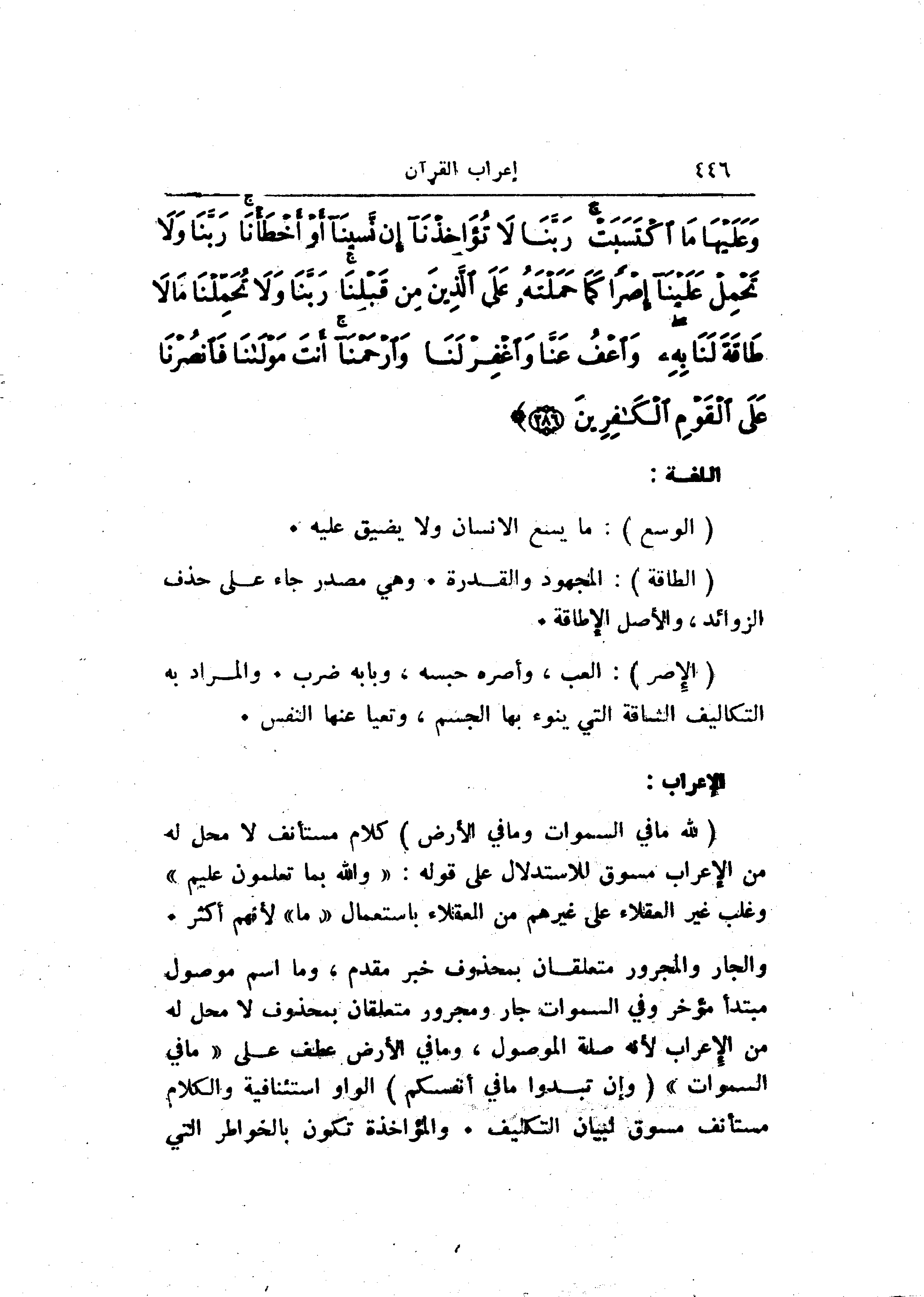 والجار والمجرور متعلقان بمحذوف خبر مقدم، وما اسم موصول مبتدأ مؤخر وفي السموات جار ومجرور متعلقان بمحذوف لا محل له من الإعراب لأنه صلة الموصول، وما في الأرض عطف على «ما في السموات» (وَإِنْ تُبْدُوا ما فِي أَنْفُسِكُمْ) الواو استئنافية والكلام مستأنف مسوق لبيان التكليف. والمؤاخذة تكون بالخواطر التي