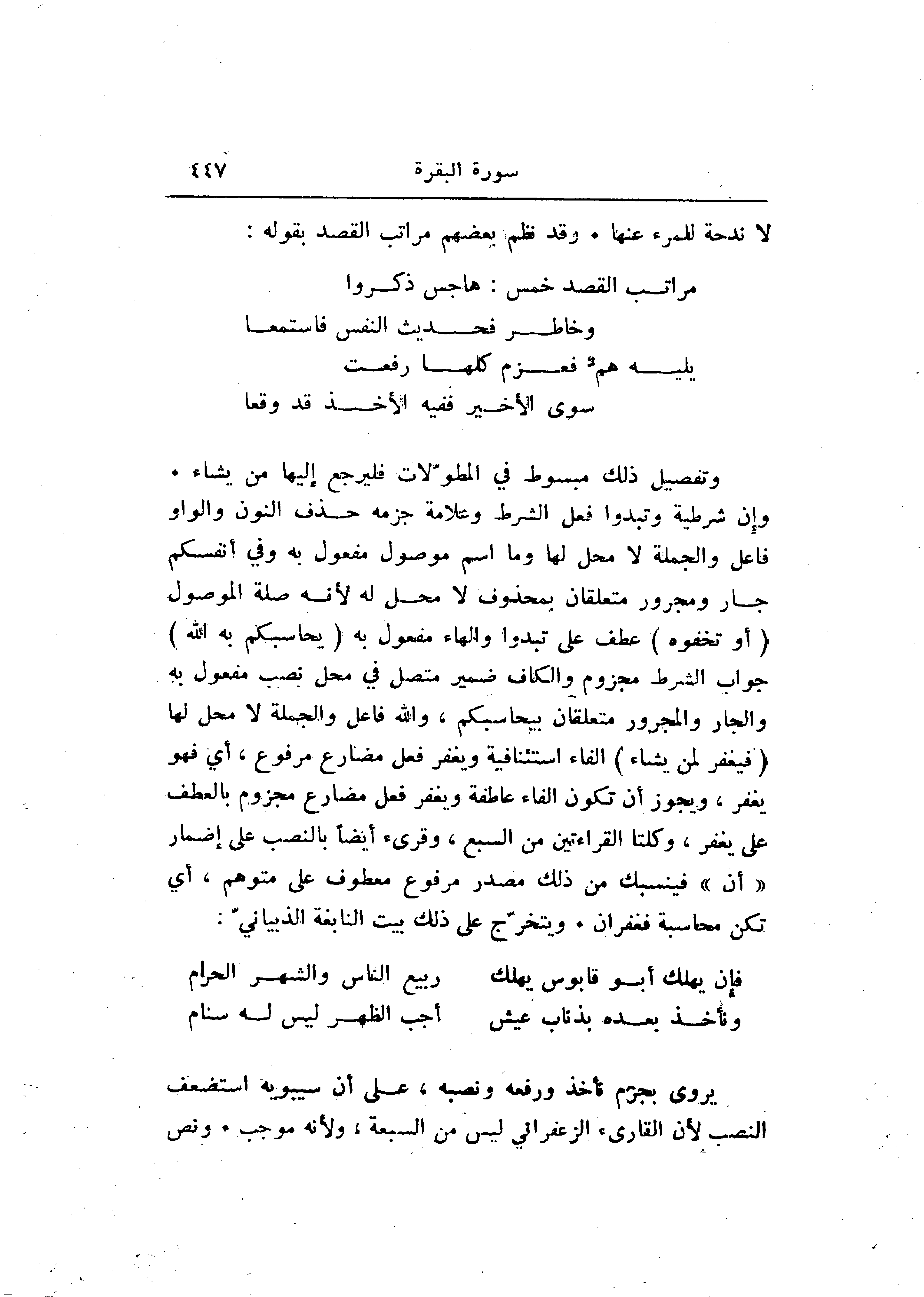 وإن شرطية وتبدوا فعل الشرط وعلامة جزمه حذف النون والواو فاعل والجملة لا محل لها وما اسم موصول مفعول به وفي أنفسكم جار ومجرور متعلقان بمحذوف لا محل له لأنه صلة الموصول (أَوْ تُخْفُوهُ) عطف على تبدوا والهاء مفعول به (يُحاسِبْكُمْ بِهِ اللَّهُ) جواب الشرط مجزوم والكاف ضمير متصل في محل نصب مفعول به والجار والمجرور متعلقان بيحاسبكم، والله فاعل والجملة لا محل لها (فَيَغْفِرُ لِمَنْ يَشاءُ) الفاء استئنافية ويغفر فعل مضارع مرفوع، أي فهو يغفر، ويجوز أن تكون الفاء عاطفة ويغفر فعل مضارع مجزوم بالعطف على يغفر، وكلتا القراءتين من السبع، وقرىء أيضا بالنصب على إضمار «أن» فينسبك من ذلك مصدر مرفوع معطوف على متوهم، أي تكن محاسبة فغفران. ويتخرّج على ذلك بيت النابغة الذبيانيّ: