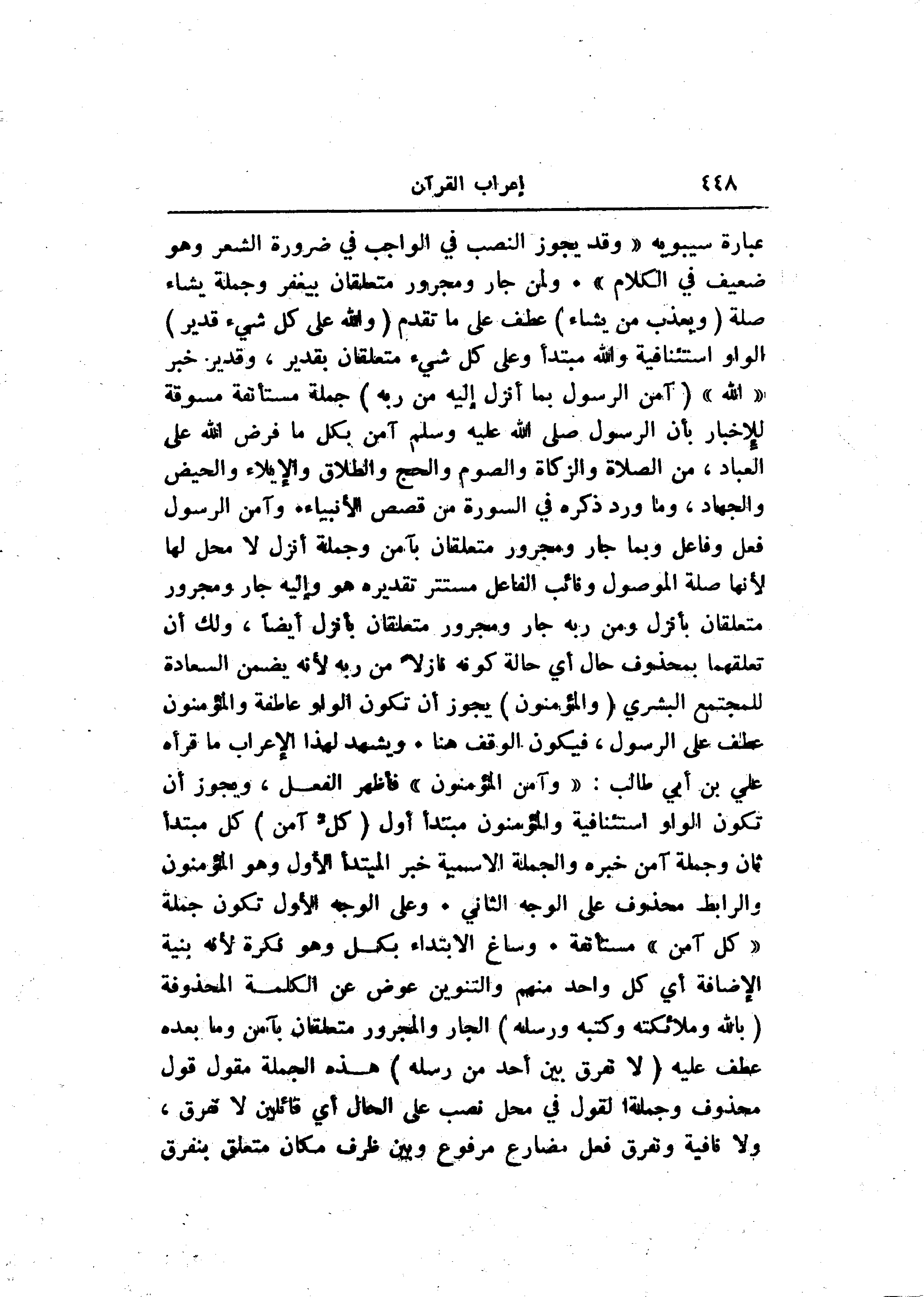 عبارة سيبويه «وقد يجوز النصب في الواجب في ضرورة الشعر وهو ضعيف في الكلام» . ولمن جار ومجرور متعلقان بيغفر وجملة يشاء صلة (وَيُعَذِّبُ مَنْ يَشاءُ) عطف على ما تقدم (وَاللَّهُ عَلى كُلِّ شَيْءٍ قَدِيرٌ) الواو استئنافية والله مبتدأ وعلى كل شيء متعلقان بقدير، وقدير خبر «الله» (آمَنَ الرَّسُولُ بِما أُنْزِلَ إِلَيْهِ مِنْ رَبِّهِ) جملة مستأنفة مسوقة للإخبار بأن الرسول صلى الله عليه وسلم آمن بكل ما فرض الله على العباد، من الصلاة والزكاة والصوم والحج والطلاق والإيلاء والحيض والجهاد، وما ورد ذكره في السورة من قصص الأنبياء. وآمن الرسول فعل وفاعل وبما جار ومجرور متعلقان بآمن وجملة أنزل لا محل لها لأنها صلة الموصول ونائب الفاعل مستتر تقديره هو وإليه جار ومجرور متعلقان بأنزل ومن ربه جار ومجرور متعلقان بأنزل أيضا، ولك أن تعلقهما بمحذوف حال أي حالة كونه نازلا من ربه لأنه يضمن السعادة للمجتمع البشري (وَالْمُؤْمِنُونَ) يجوز أن تكون الواو عاطفة والمؤمنون عطف على الرسول، فيكون الوقف هنا. ويشهد لهذا الإعراب ما قرأه علي بن أبي طالب: «وآمن المؤمنون» فأظهر الفعل، ويجوز أن تكون الواو استئنافية والمؤمنون مبتدأ أول (كُلٌّ آمَنَ) كل مبتدأ ثان وجملة آمن خبره والجملة الاسمية خبر المبتدأ الأول وهو المؤمنون والرابط محذوف على الوجه الثاني. وعلى الوجه الأول تكون جملة «كل آمن» مستأنفة. وساغ الابتداء بكل وهو نكرة لأنه بنية الإضافة أي كل واحد منهم والتنوين عوض عن الكلمة المحذوفة (بِاللَّهِ وَمَلائِكَتِهِ وَكُتُبِهِ وَرُسُلِهِ) الجار والمجرور متعلقان بآمن وما بعده عطف عليه (لا نُفَرِّقُ بَيْنَ أَحَدٍ مِنْ رُسُلِهِ) هذه الجملة مقول قول محذوف وجملة القول في محل نصب على الحال أي قائلين لا نفرق، ولا نافية ونفرق فعل مضارع مرفوع وبين ظرف مكان متعلق بنفرق
