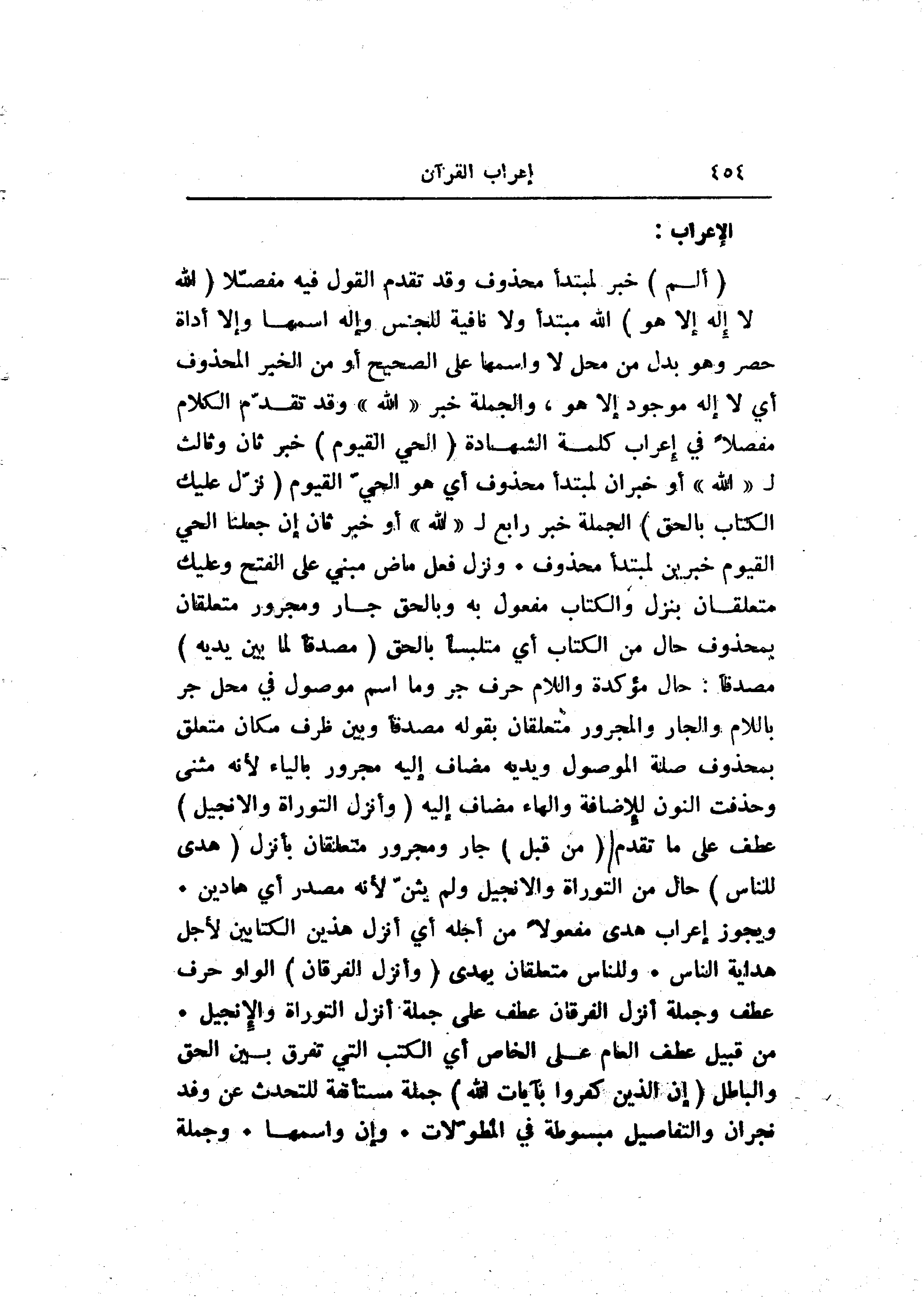 (الم) خبر لمبتدأ محذوف وقد تقدم القول فيه مفصّلا (اللَّهُ لا إِلهَ إِلَّا هُوَ) الله مبتدأ ولا نافية للجنس وإله اسمها وإلا أداة حصر وهو بدل من محل لا واسمها على الصحيح أو من الخير المحذوف أي لا إله موجود إلا هو، والجملة خبر «الله» وقد تقدّم الكلام مفصلا في إعراب كلمة الشهادة (الْحَيُّ الْقَيُّومُ) خبر ثان وثالث ل «الله» أو خبران لمبتدأ محذوف أي هو الحيّ القيوم (نَزَّلَ عَلَيْكَ الْكِتابَ بِالْحَقِّ) الجملة خبر رابع ل «الله» أو خبر ثان إن جعلنا الحي القيوم خبرين لمبتدأ محذوف. ونزل فعل ماض مبني على الفتح وعليك متعلقان بنزل والكتاب مفعول به وبالحق جار ومجرور متعلقان بمحذوف حال من الكتاب أي متلبسا بالحق (مُصَدِّقاً لِما بَيْنَ يَدَيْهِ) مصدقا: حال مؤكدة واللام حرف جر وما اسم موصول في محل جر باللام والجار والمجرور متعلقان بقوله مصدقا وبين ظرف مكان متعلق بمحذوف صلة الموصول ويديه مضاف إليه مجرور بالياء لأنه مثنى وحذفت النون للإضافة والهاء مضاف إليه (وَأَنْزَلَ التَّوْراةَ وَالْإِنْجِيلَ) عطف على ما تقدم (مِنْ قَبْلُ) جار ومجرور متعلقان بأنزل (هُدىً لِلنَّاسِ) حال من التوراة والإنجيل ولم يثنّ لأنه مصدر أي هادين.