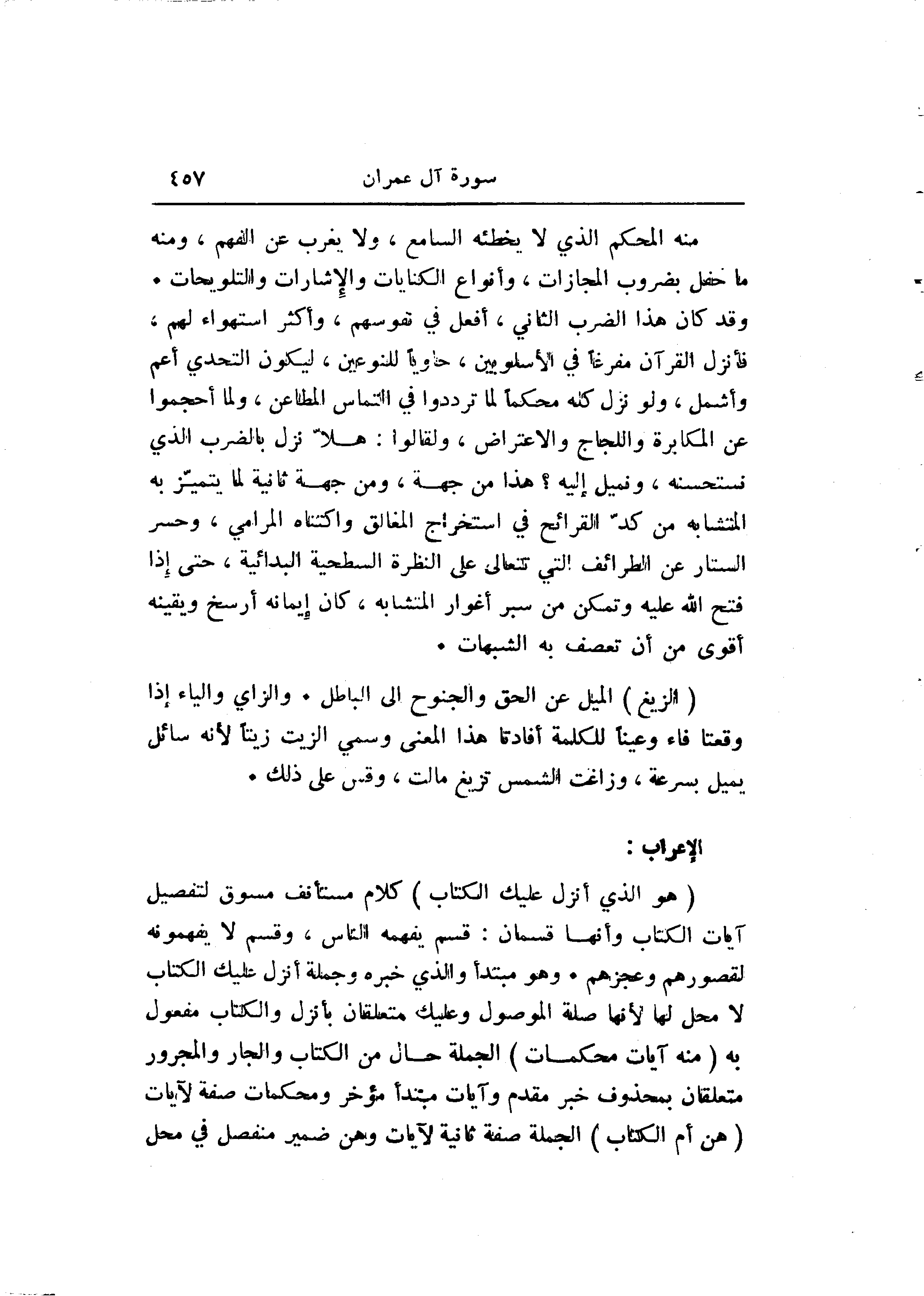 (هُوَ الَّذِي أَنْزَلَ عَلَيْكَ الْكِتابَ) كلام مستأنف مسوق لتفصيل آيات الكتاب وأنها قسمان: قسم يفهمه الناس، وقسم لا يفهمونه لقصورهم وعجزهم. وهو مبتدأ والذي خبره وجملة أنزل عليك الكتاب لا محل لها لأنها صلة الموصول وعليك متعلقان بأنزل والكتاب مفعول به (مِنْهُ آياتٌ مُحْكَماتٌ) الجملة حال من الكتاب والجار والمجرور متعلقان بمحذوف خبر مقدم وآيات مبتدأ مؤخر ومحكمات صفة لآيات (هُنَّ أُمُّ الْكِتابِ) الجملة صفة ثانية لآيات وهن ضمير منفصل في محل