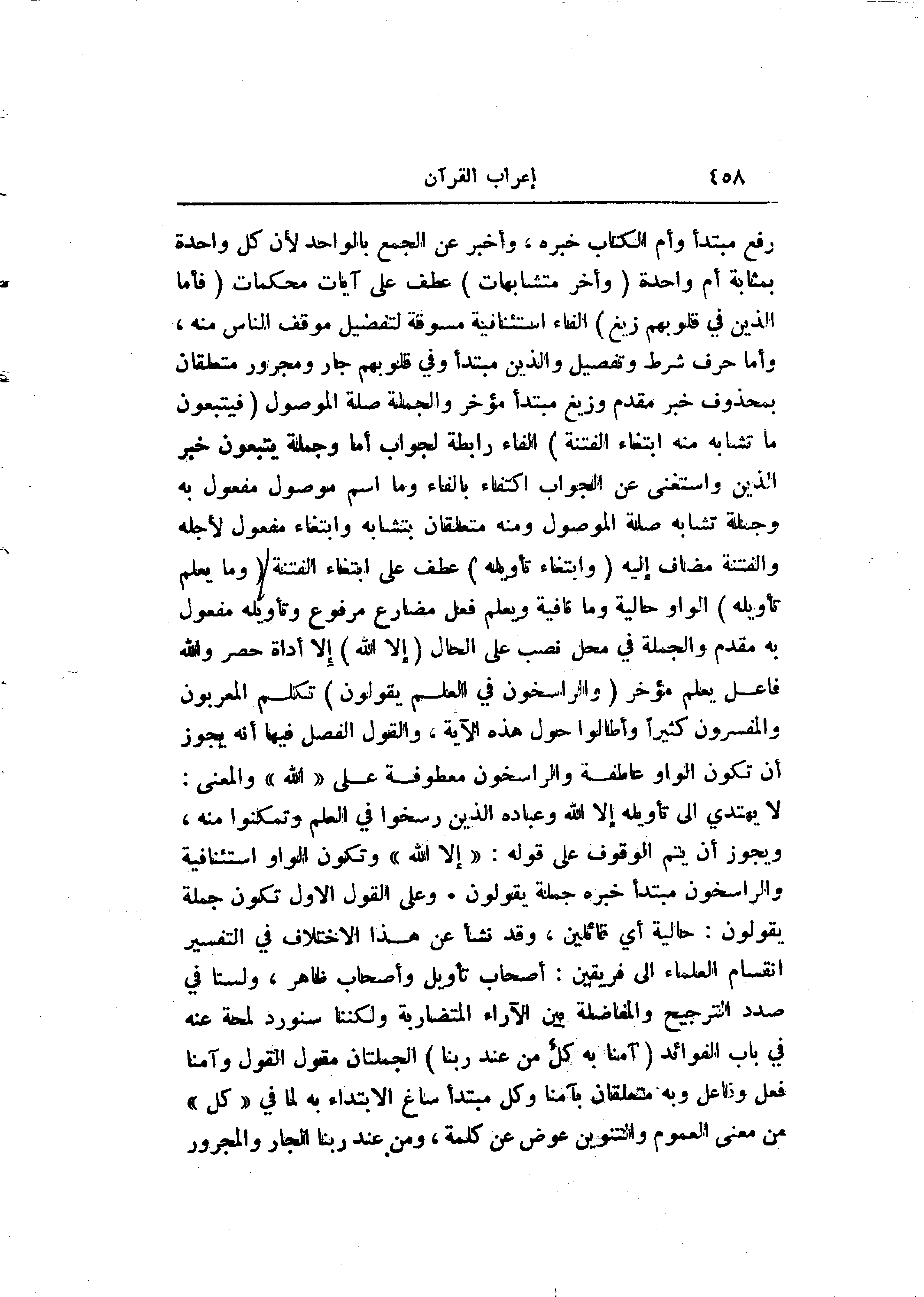 لا يهتدي الى تأويله إلا الله وعباده الذين رسخوا في العلم وتمكنوا منه، ويجوز أن يتم الوقوف على قوله: «إلا الله» وتكون الواو استئنافية والراسخون مبتدأ خبره جملة يقولون. وعلى القول الاول تكون جملة يقولون: حالية أي قائلين، وقد نشأ عن هذا الاختلاف في التفسير انقسام العلماء الى فريقين: أصحاب تأويل وأصحاب ظاهر، ولستا في صدد الترجيح والمفاضلة بين الآراء المتضاربة ولكننا سنورد لمحة عنه في باب الفوائد (آمَنَّا بِهِ كُلٌّ مِنْ عِنْدِ رَبِّنا) الجملتان مقول القول وآمنا فعل وفاعل وبه متعلقان بآمنا وكل مبتدأ ساغ الابتداء به لما في «كل» من معنى العموم والتنوين عوض عن كلمة، ومن عند ربنا الجار والمجرور