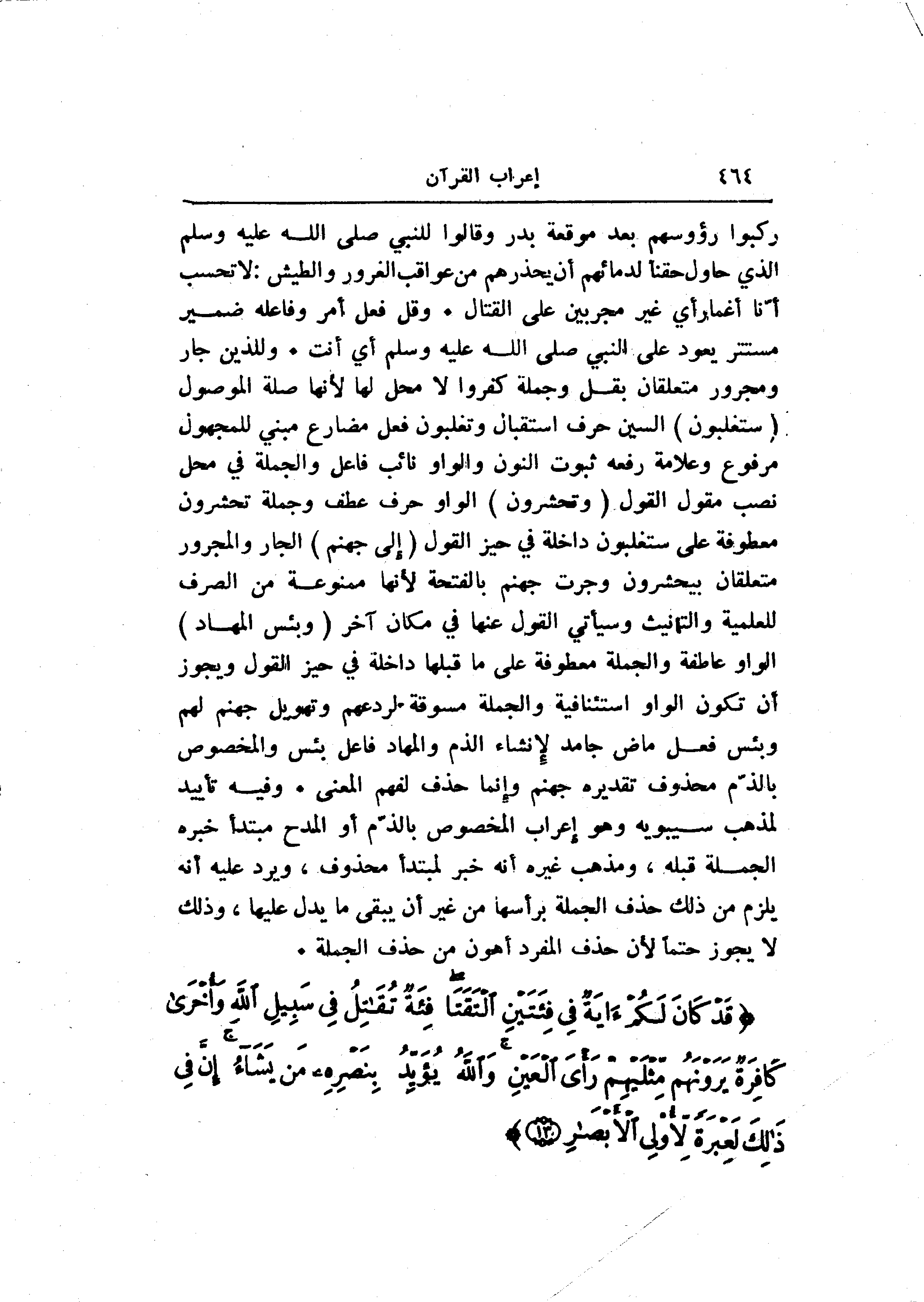 ركبوا رؤوسهم بعد موقعة بدر وقالوا للنبي صَلَّى اللَّهُ عَلَيْهِ وَسَلَّمَ الذي حاول حقنا لدمائهم أن يحذرهم من عواقب الغرور والطيش: لا تحسب أنّا أغما رأي غير مجربين على القتال. وقل فعل أمر وفاعله ضمير مستتر يعود على النبي صَلَّى اللَّهُ عَلَيْهِ وَسَلَّمَ أي أنت. وللذين جار ومجرور متعلقان بقل وجملة كفروا لا محل لها لأنها صلة الموصول (سَتُغْلَبُونَ) السين حرف استقبال وتغلبون فعل مضارع مبني للمجهول مرفوع وعلامة رفعه ثبوت النون والواو نائب فاعل والجملة في محل نصب مقول القول (وَتُحْشَرُونَ) الواو حرف عطف وجملة تحشرون معطوفة على ستغلبون داخلة في حيز القول (إِلى جَهَنَّمَ) الجار والمجرور متعلقان بيحشرون وجرت جهنم بالفتحة لأنها ممنوعة من الصرف للعلمية والتأنيث وسيأتي القول عنها في مكان آخر (وَبِئْسَ الْمِهادُ) الواو عاطفة والجملة معطوفة على ما قبلها داخلة في حيز القول ويجوز أن تكون الواو استئنافية والجملة مسوقة لردعهم وتهويل جهنم لهم وبئس فعل ماض جامد لإنشاء الذم والمهاد فاعل بئس والمخصوص بالذّم محذوف تقديره جهنم وإنما حذف لفهم المعنى. وفيه تأييد لمذهب سيبويه وهو إعراب المخصوص بالذّم أو المدح مبتدأ خبره الجملة قبله، ومذهب غيره أنه خبر لمبتدأ محذوف، ويرد عليه أنه يلزم من ذلك حذف الجملة برأسها من غير أن يبقى ما يدل عليها، وذلك لا يجوز حتما لأن حذف المفرد أهون من حذف الجملة.