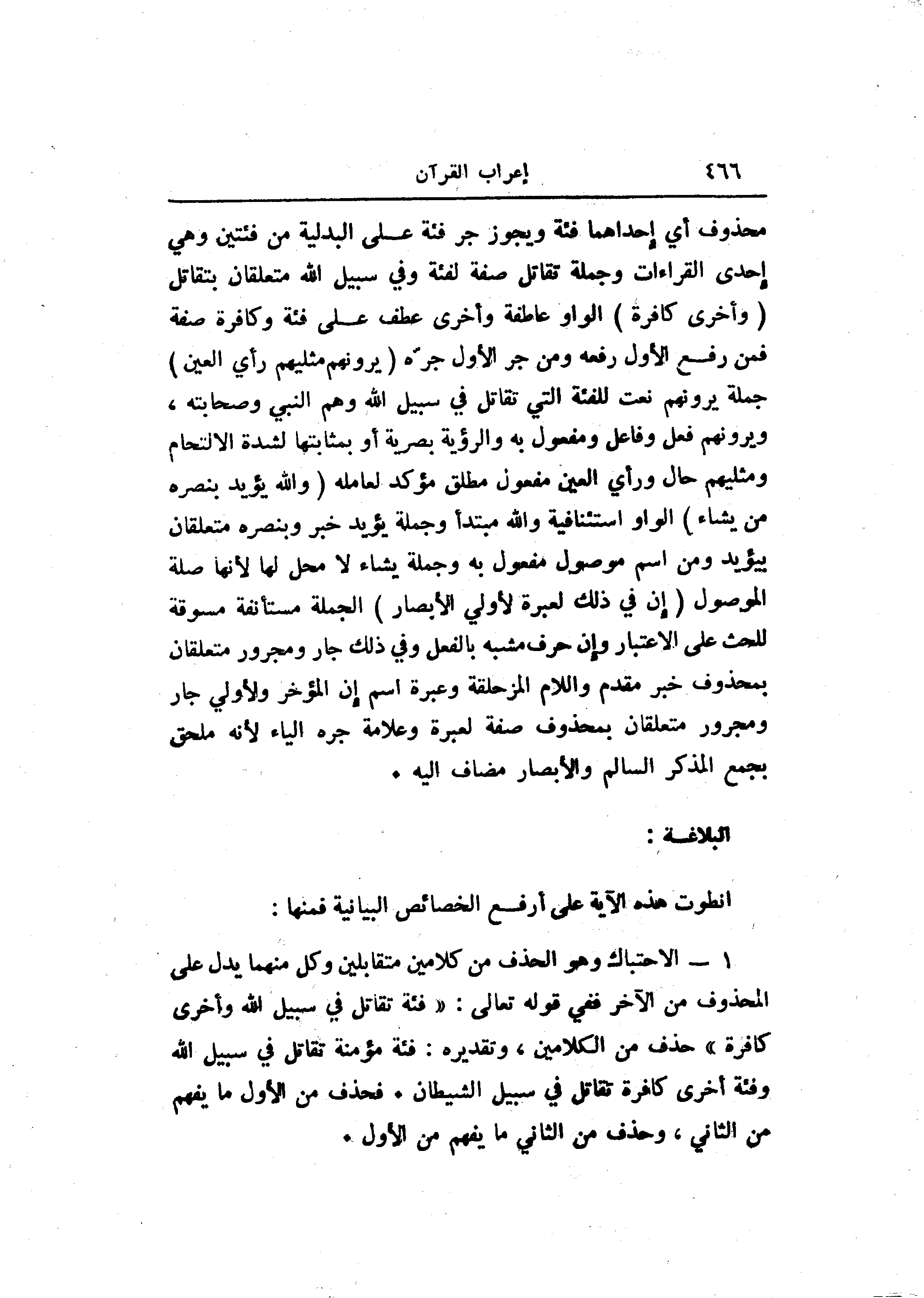 محذوف أي إحداهما فئة ويجوز جر فئة على البدلية من فئتين وهي إحدى القراءات وجملة تقاتل صفة لفئة وفي سبيل الله متعلقان بتقاتل (وَأُخْرى كافِرَةٌ) الواو عاطفة وأخرى عطف على فئة وكافرة صفة فمن رفع الأول رفعه ومن جر الأول جرّه (يَرَوْنَهُمْ مِثْلَيْهِمْ رَأْيَ الْعَيْنِ) جملة يرونهم نعت للفئة التي تقاتل في سبيل الله وهم النبي وصحابته، ويرونهم فعل وفاعل ومفعول به والرؤية بصرية أو بمثابتها لشدة الالتحام ومثليهم حال ورأي العين مفعول مطلق مؤكد لعامله (وَاللَّهُ يُؤَيِّدُ بِنَصْرِهِ مَنْ يَشاءُ) الواو استئنافية والله مبتدأ وجملة يؤيد خبر وبنصره متعلقان بيؤيد ومن اسم موصول مفعول به وجملة يشاء لا محل لها لأنها صلة الموصول (إِنَّ فِي ذلِكَ لَعِبْرَةً لِأُولِي الْأَبْصارِ) الجملة مستأنفة مسوقة للحث على الاعتبار وإن حرف مشبه بالفعل وفي ذلك جار ومجرور متعلقان بمحذوف خبر مقدم واللام المزحلقة وعبرة اسم إن المؤخر ولأولي جار ومجرور متعلقان بمحذوف صفة لعبرة وعلامة جره الياء لأنه ملحق بجمع المذكر السالم والأبصار مضاف اليه.