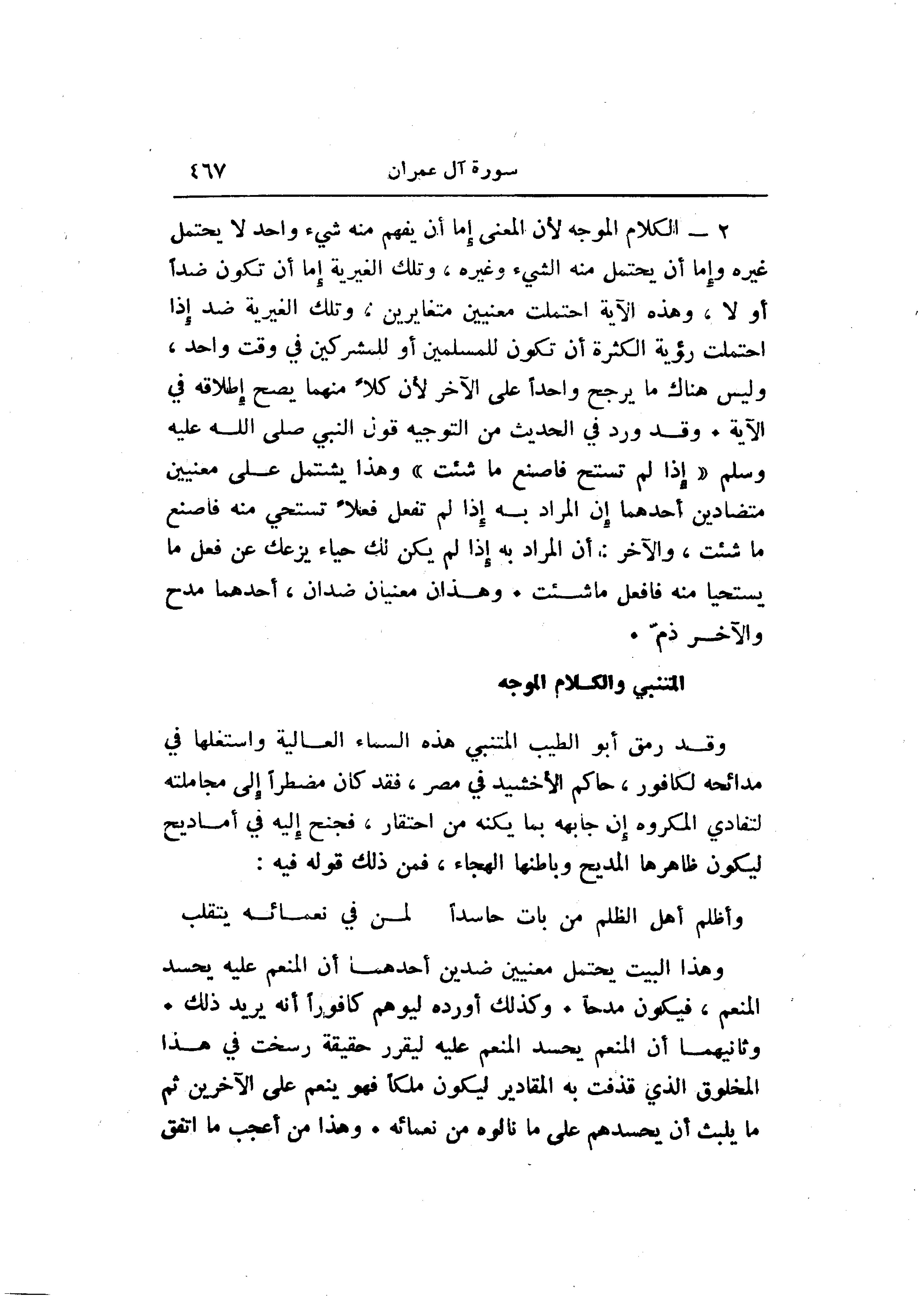 2- الكلام الموجه لأن المعنى إما أن يفهم منه شيء واحد لا يحتمل غيره وإما أن يحتمل منه الشيء وغيره، وتلك الغيرية إما أن تكون ضدا أو لا، وهذه الآية احتملت معنيين متغايرين، وتلك الغيرية ضد إذا احتملت رؤية الكثرة أن تكون للمسلمين أو للمشركين في وقت واحد، وليس هناك ما يرجح واحدا على الآخر لأن كلا منهما يصح إطلاقه في الآية. وقد ورد في الحديث من التوجيه قول النبي صَلَّى اللَّهُ عَلَيْهِ وَسَلَّمَ «إذا لم تستح فاصنع ما شئت» وهذا يشتمل على معنيين متضادين أحدهما إن المراد به إذا لم تفعل فعلا تستحي منه فاصنع ما شئت، والآخر: أن المراد به إذا لم يكن لك حياء يزعك عن فعل ما يستحيا منه فافعل ما شئت. وهذان معنيان ضدان، أحدهما مدح والآخر ذمّ.