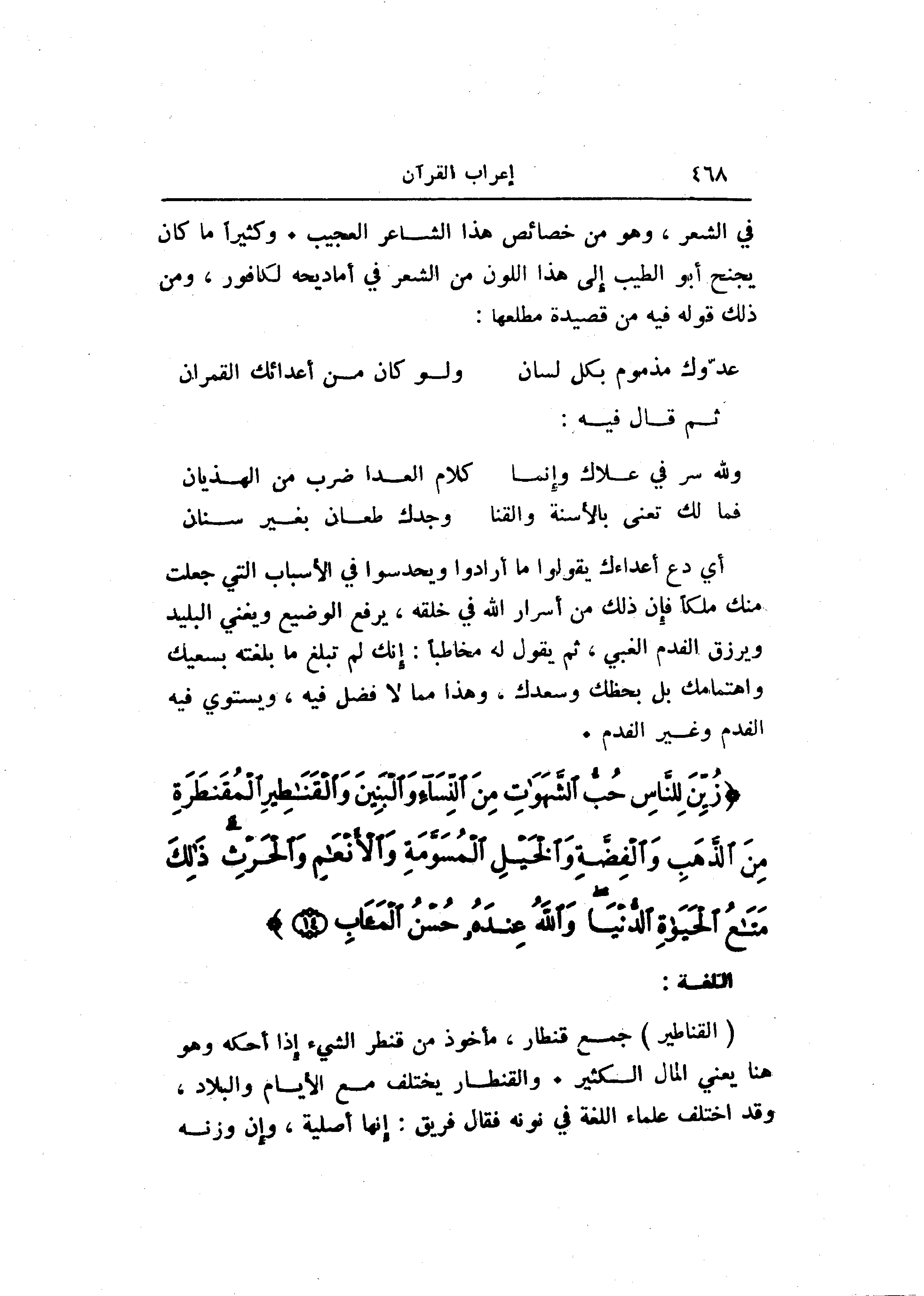(القناطير) جمع قنطار، مأخوذ من قنطر الشيء إذا أحكه وهو هنا يعني المال الكثير. والقنطار يختلف مع الأيام والبلاد، وقد اختلف علماء اللغة في نونه فقال فريق: إنها أصلية، وإن وزنه