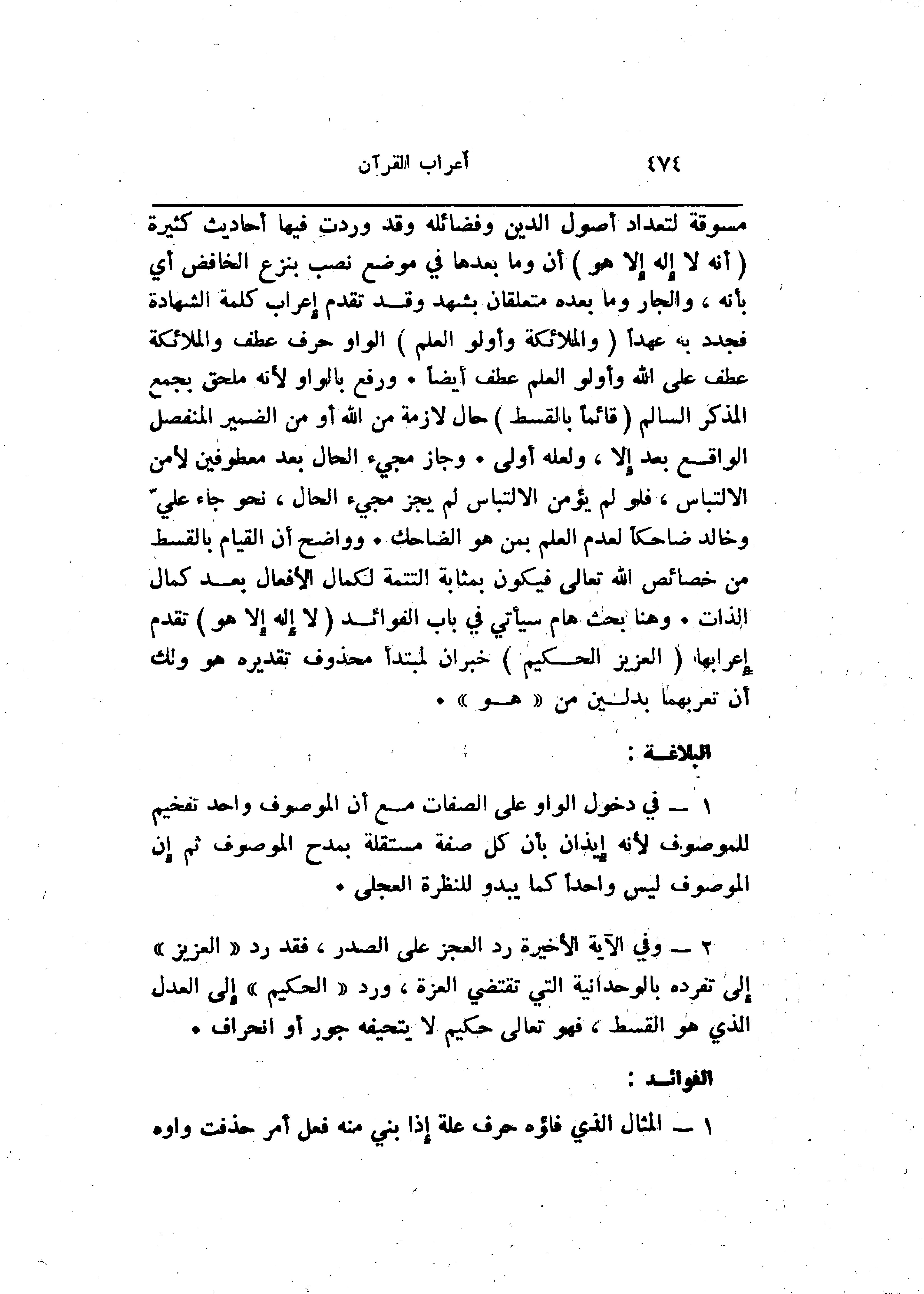 مسوقة لتعداد أصول الدين وفضائله وقد وردت فيها أحاديث كثيرة (أَنَّهُ لا إِلهَ إِلَّا هُوَ) أن وما بعدها في موضع نصب بنزع الخافض أي بأنه، والجار وما بعده متعلقان بشهد وقد تقدم إعراب كلمة الشهادة فجدد به عهدا (وَالْمَلائِكَةُ وَأُولُوا الْعِلْمِ) الواو حرف عطف والملائكة عطف على الله وأولو العلم عطف أيضا. ورفع بالواو لأنه ملحق بجمع المذكر السالم (قائِماً بِالْقِسْطِ) حال لازمة من الله أو من الضمير المنفصل الواقع بعد إلا، ولعله أولى. وجاز مجيء الحال بعد معطوفين لأمن الالتباس، فلو لم يؤمن الالتباس لم يجز مجيء الحال، نحو جاء عليّ وخالد ضاحكا لعدم العلم بمن هو الضاحك. وواضح أن القيام بالقسط من خصائص الله تعالى فيكون بمثابة التتمة لكمال الأفعال بعد كمال الذات. وهنا بحث هام سيأتي في باب الفوائد (لا إِلهَ إِلَّا هُوَ) تقدم إعرابها (الْعَزِيزُ الْحَكِيمُ) خبران لمبتدأ محذوف تقديره هو ولك أن تعربهما بدلين من «هو» .