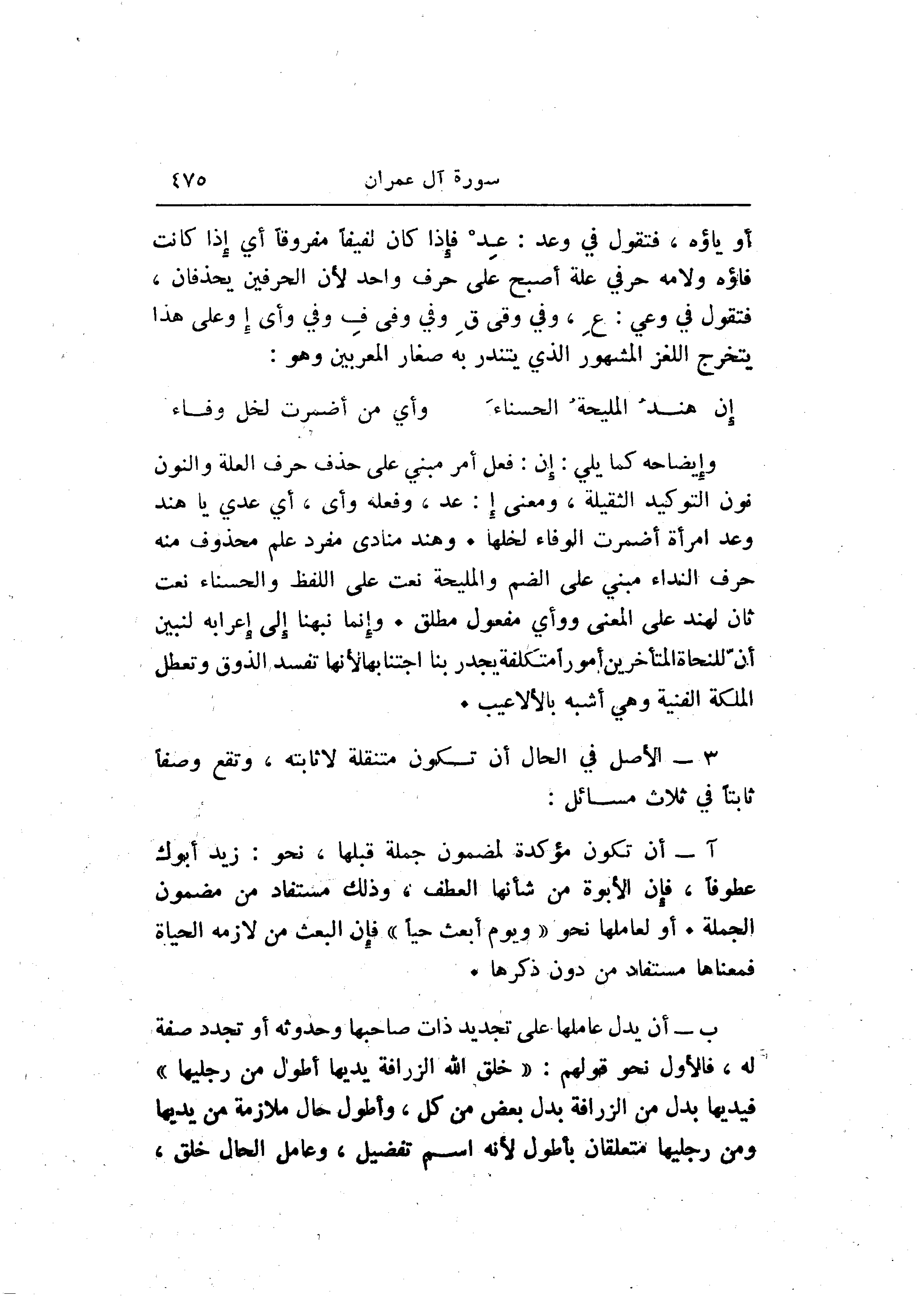 وإيضاحه كما يلي: إن: فعل أمر مبني على حذف حرف العلة والنون نون التوكيد الثقيلة، ومعنى إ: عد، وفعله وأى، أي عدي يا هند وعد امرأة أضمرت الوفاء لخلها. وهند منادى مفرد علم محذوف منه حرف النداء مبني على الضم والمليحة نعت على اللفظ والحسناء نعت ثان لهند على المعنى ووأي مفعول مطلق. وإنما نبهنا إلى إعرابه لنبين أنّ للنحاة المتأخرين أمورا متكلفة يجدر بنا اجتنابها لأنها تفسد الذوق وتعطل الملكة الفنية وهي أشبه بالأعيب.