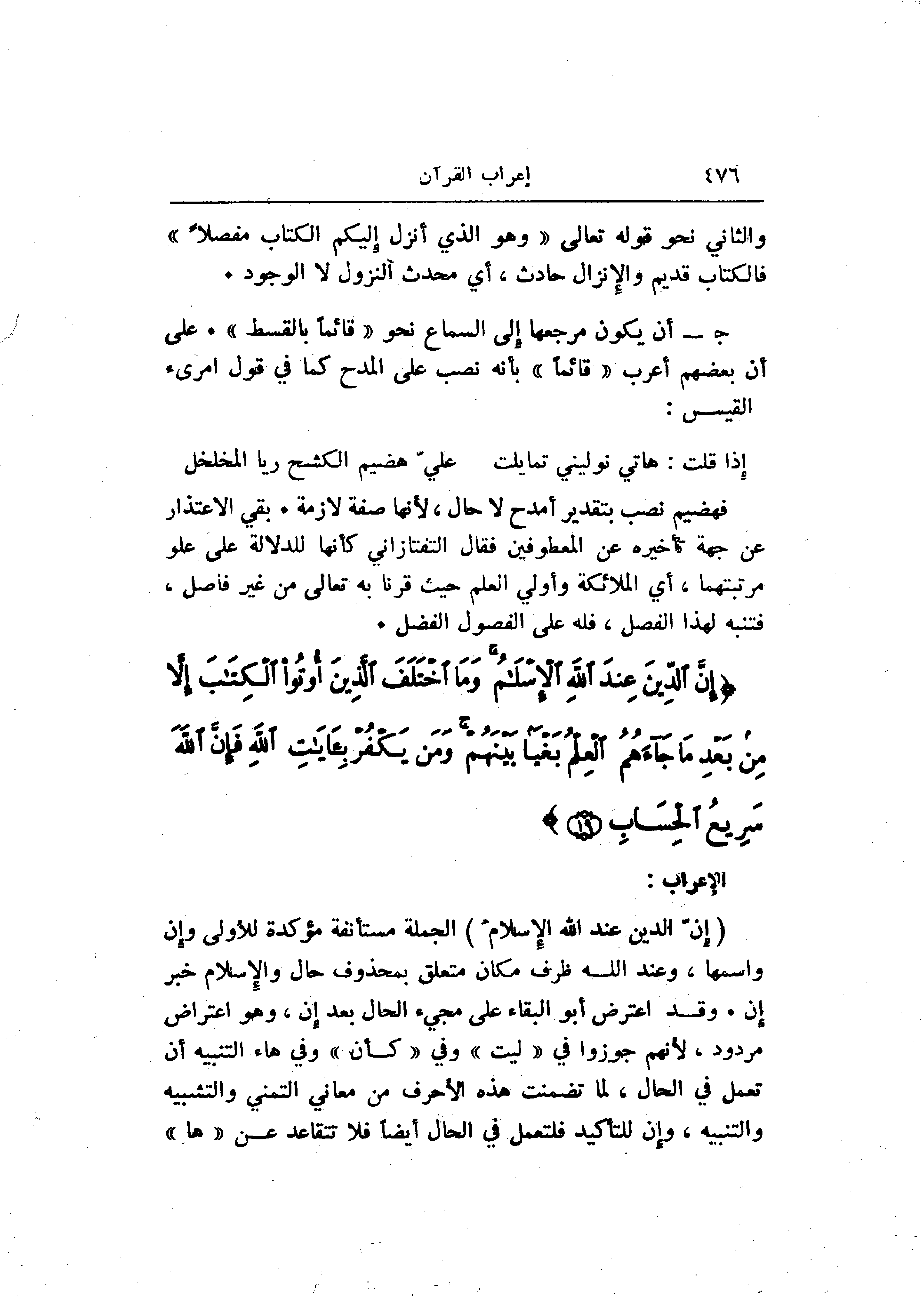 (إِنَّ الدِّينَ عِنْدَ اللَّهِ الْإِسْلامُ) الجملة مستأنفة مؤكدة للأولى وإن واسمها، وعند الله ظرف مكان متعلق بمحذوف حال والإسلام خبر إن. وقد اعترض أبو البقاء على مجيء الحال بعد إن، وهو اعتراض مردود، لأنهم جوزوا في «ليت» وفي «كأن» وفي هاء التنبيه أن تعمل في الحال، لما تضمنت هذه الأحرف من معاني التمني والتشبيه والتنبيه، وإن للتأكيد فلتعمل في الحال أيضا فلا تتقاعد عن «ها»