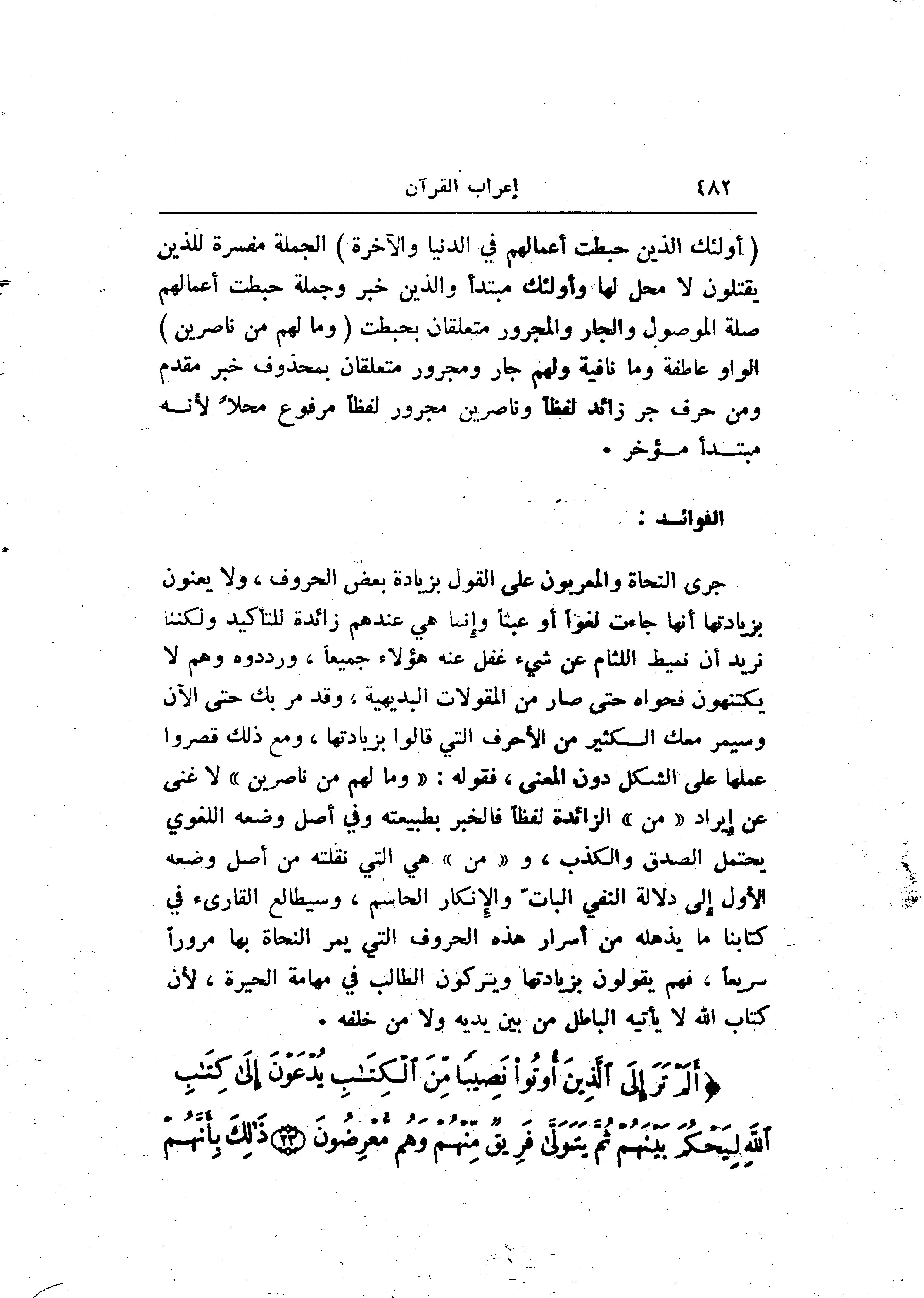 جرى النحاة والمعربون على القول بزيادة بعض الحروف، ولا يعنون بزيادتها أنها جاءت لغوا أو عبثا وإنما هي عندهم زائدة للتأكيد ولكننا نريد أن نميط اللثام عن شيء غفل عنه هؤلاء جميعا، ورددوه وهم لا يكتنهون فحواه حتى صار من المقولات البديهية، وقد مر بك حتى الآن وسيمر معك الكثير من الأحرف التي قالوا بزيادتها، ومع ذلك قصروا عملها على الشكل دون المعنى، فقوله: «وما لهم من ناصرين» لا غنى عن إيراد «من» الزائدة لفظا فالخبر بطبيعته وفي أصل وضعه اللغوي يحتمل الصدق والكذب، و «من» هي التي نقلته من أصل وضعه الأول إلى دلالة النفي الباتّ والإنكار الحاسم، وسيطالع القارئ في كتابنا ما يذهله من أسرار هذه الحروف التي يمر النحاة بها مرورا سريعا، فهم يقولون بزيادتها ويتركون الطالب في مهامة الحيرة، لأن كتاب الله لا يأتيه الباطل من بين يديه ولا من خلفه.
