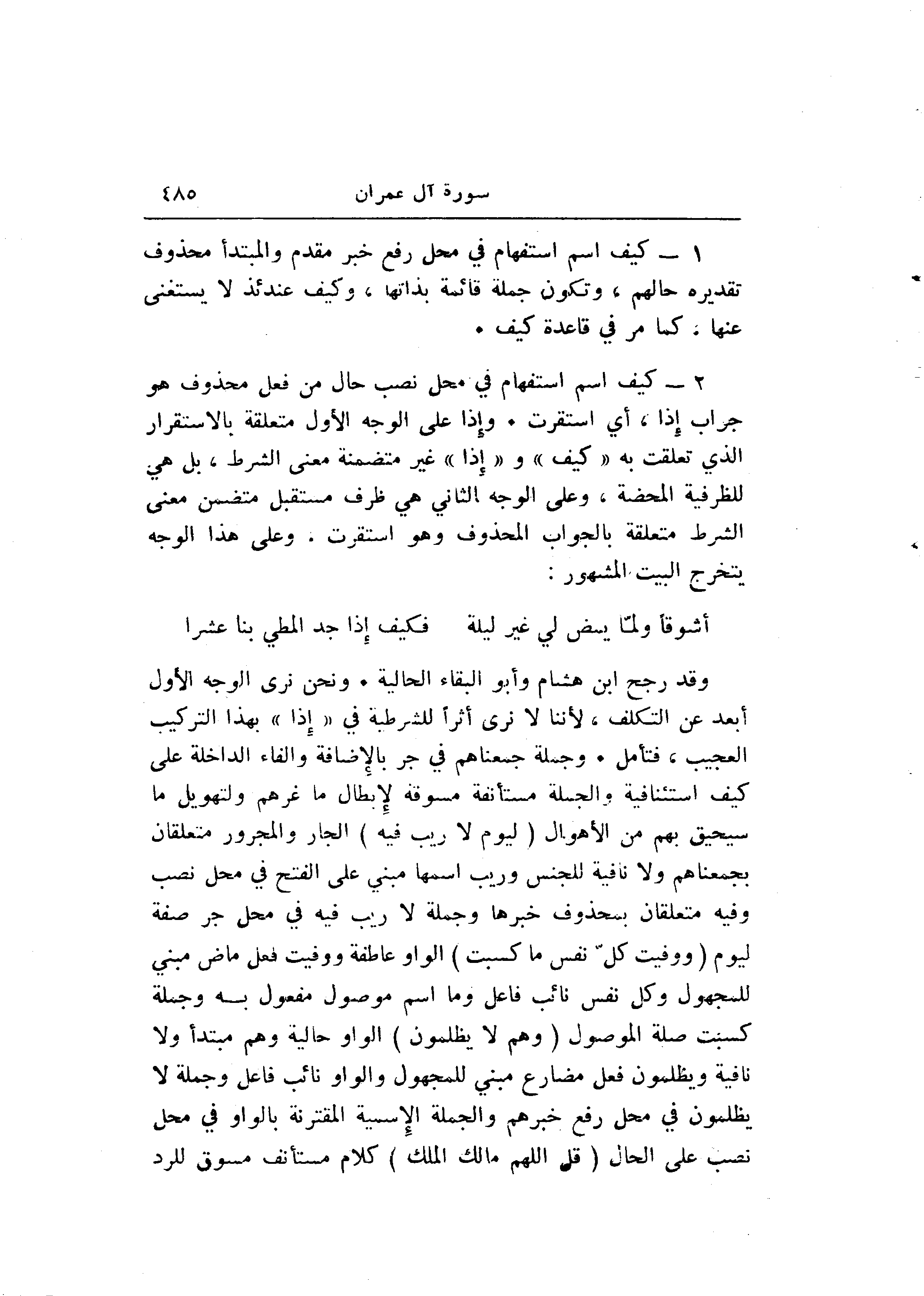 1- كيف اسم استفهام في محل رفع خبر مقدم والمبتدأ محذوف تقديره حالهم، وتكون جملة قائمة بذاتها، وكيف عندئذ لا يستغنى عنها، كما مر في قاعدة كيف.